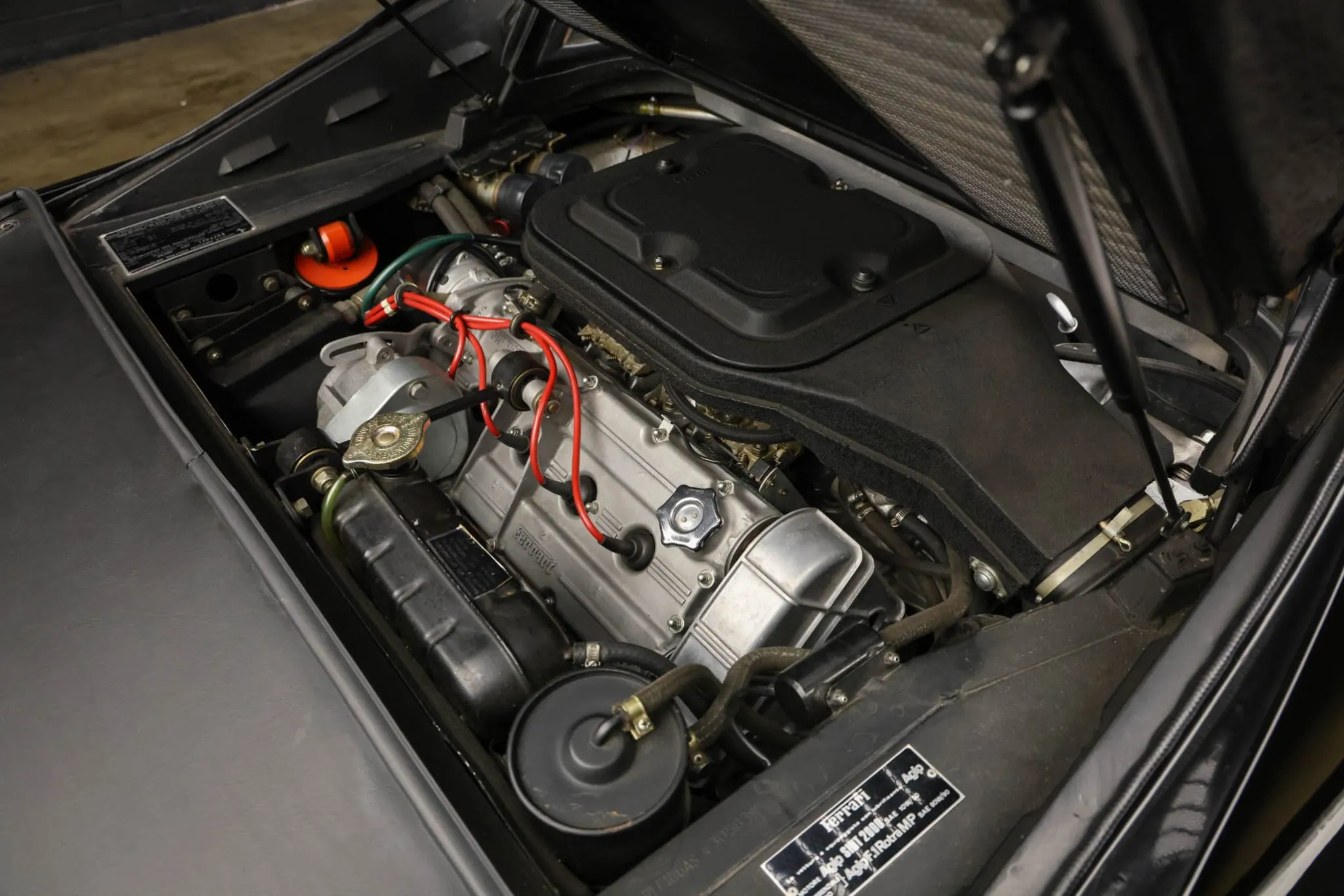 The mid-mounted 2.9L quad-cam V8 is equipped with four twin-choke Weber 40DCNF carburetors and was factory rated at 237 horsepower, which is sent to the rear wheels through a five-speed manual transaxle and a limited-slip differential. A timing belt service is said to have been last completed in 2015, and the car last passed a California emissions test in May 2024.