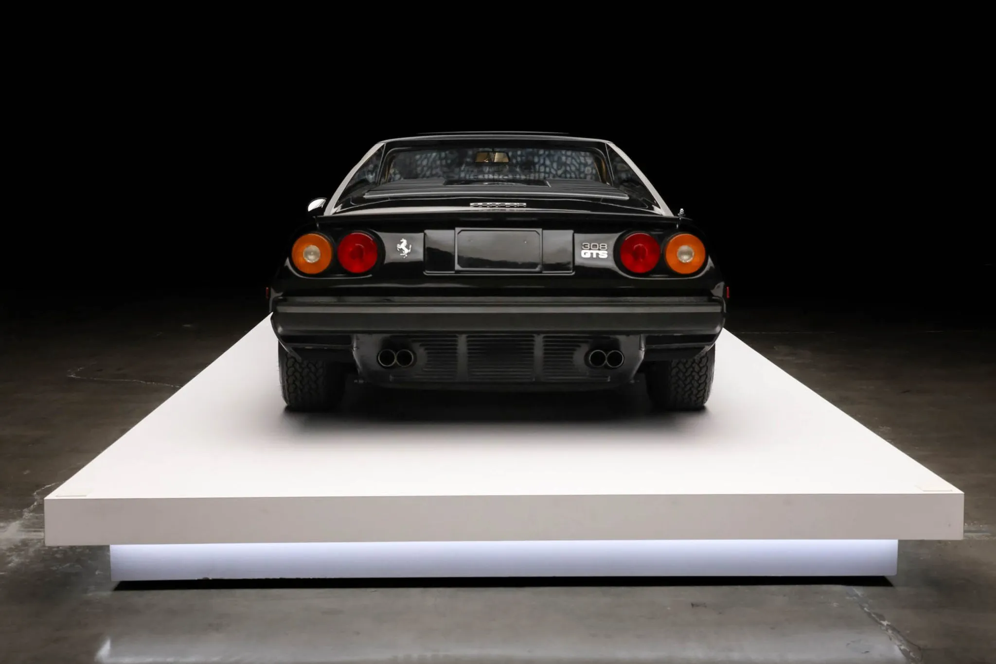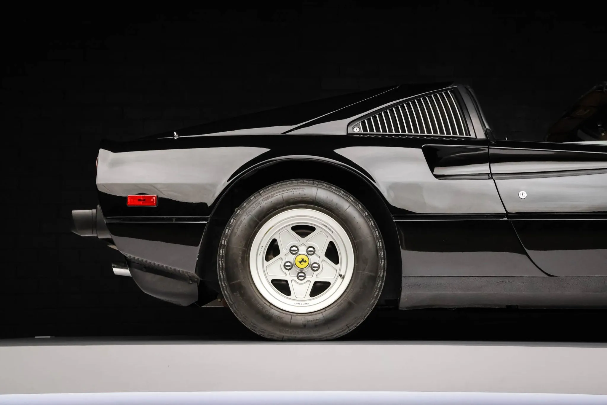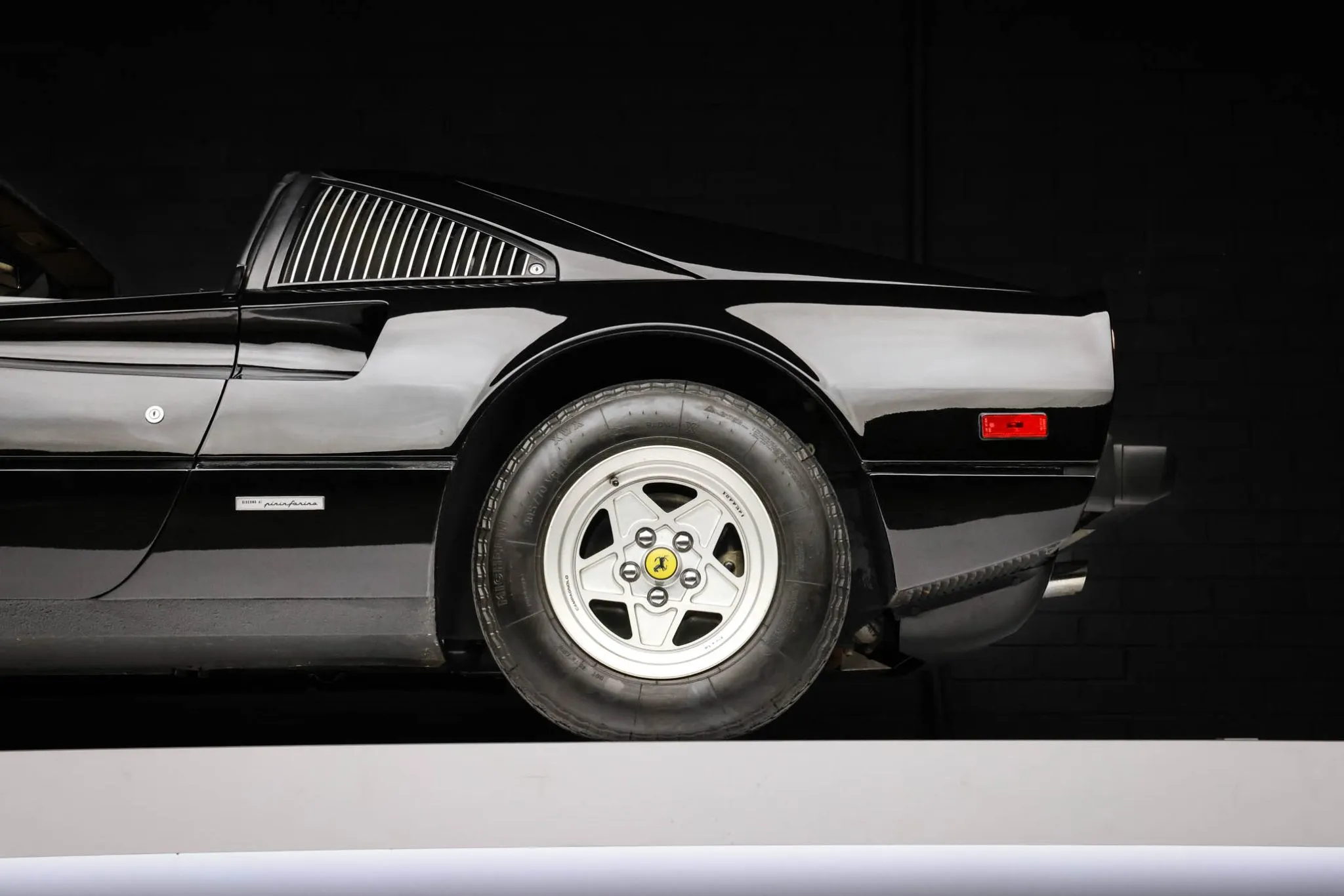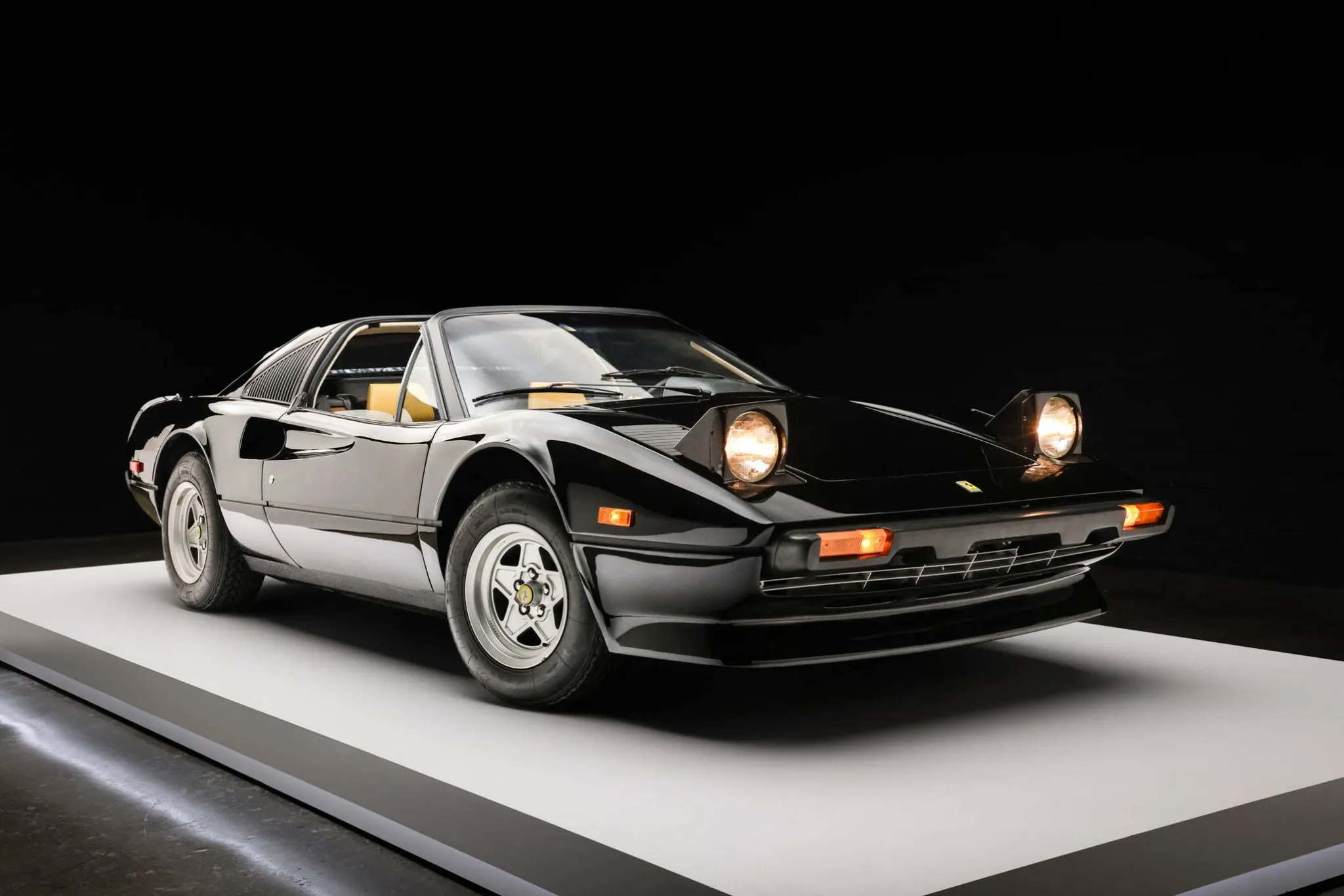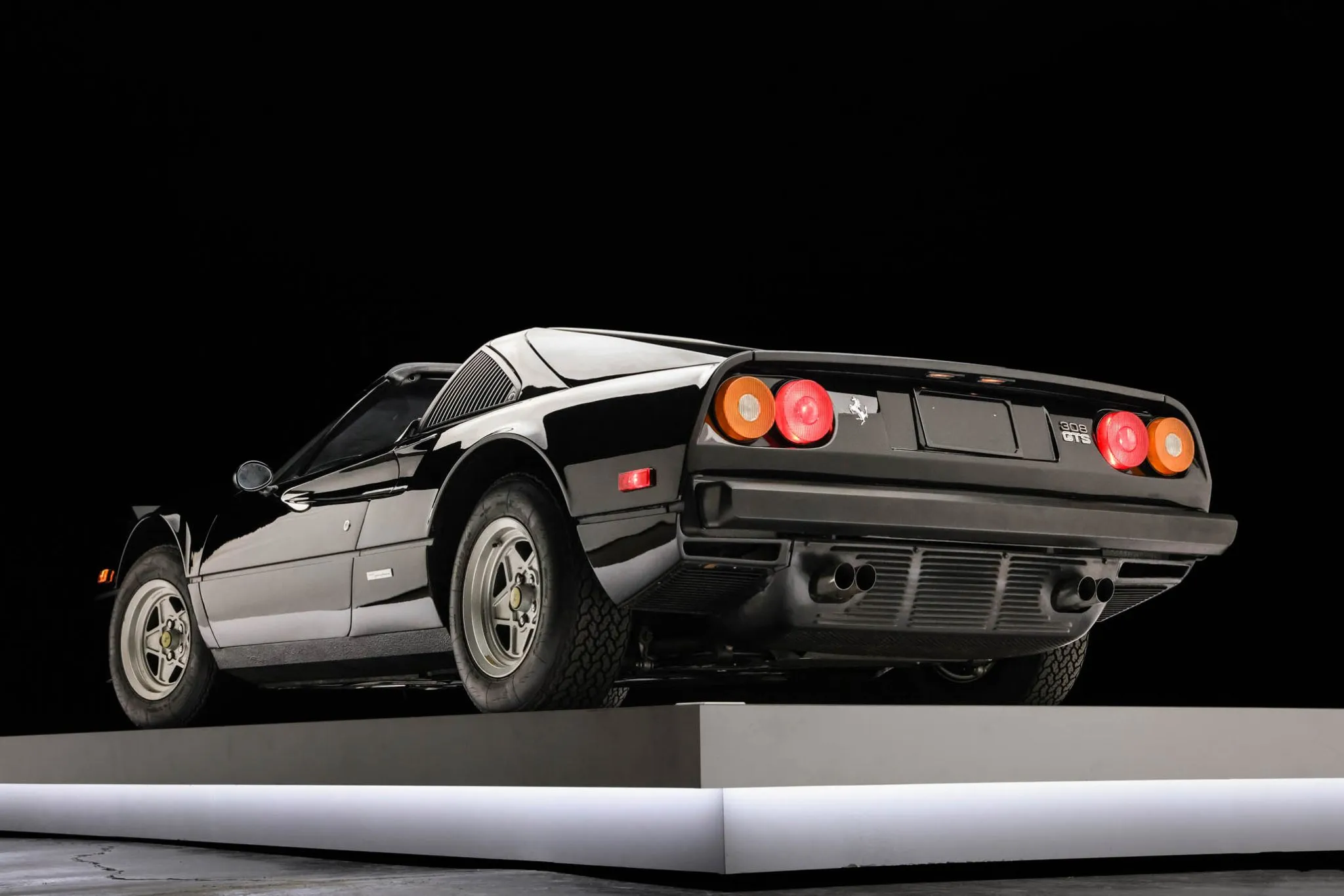 The hardtop 308 GTB debuted at the 1975 Paris Motor Show, while the targa-top GTS model was introduced at the 1977 Frankfurt Motor Show. The car is finished in Nero and features pop-up headlights, a black removable roof panel, a driver-side mirror, a vented decklid, and quad exhaust outlets. Close-up photographs of the exterior finish and trim are shown in the gallery below.