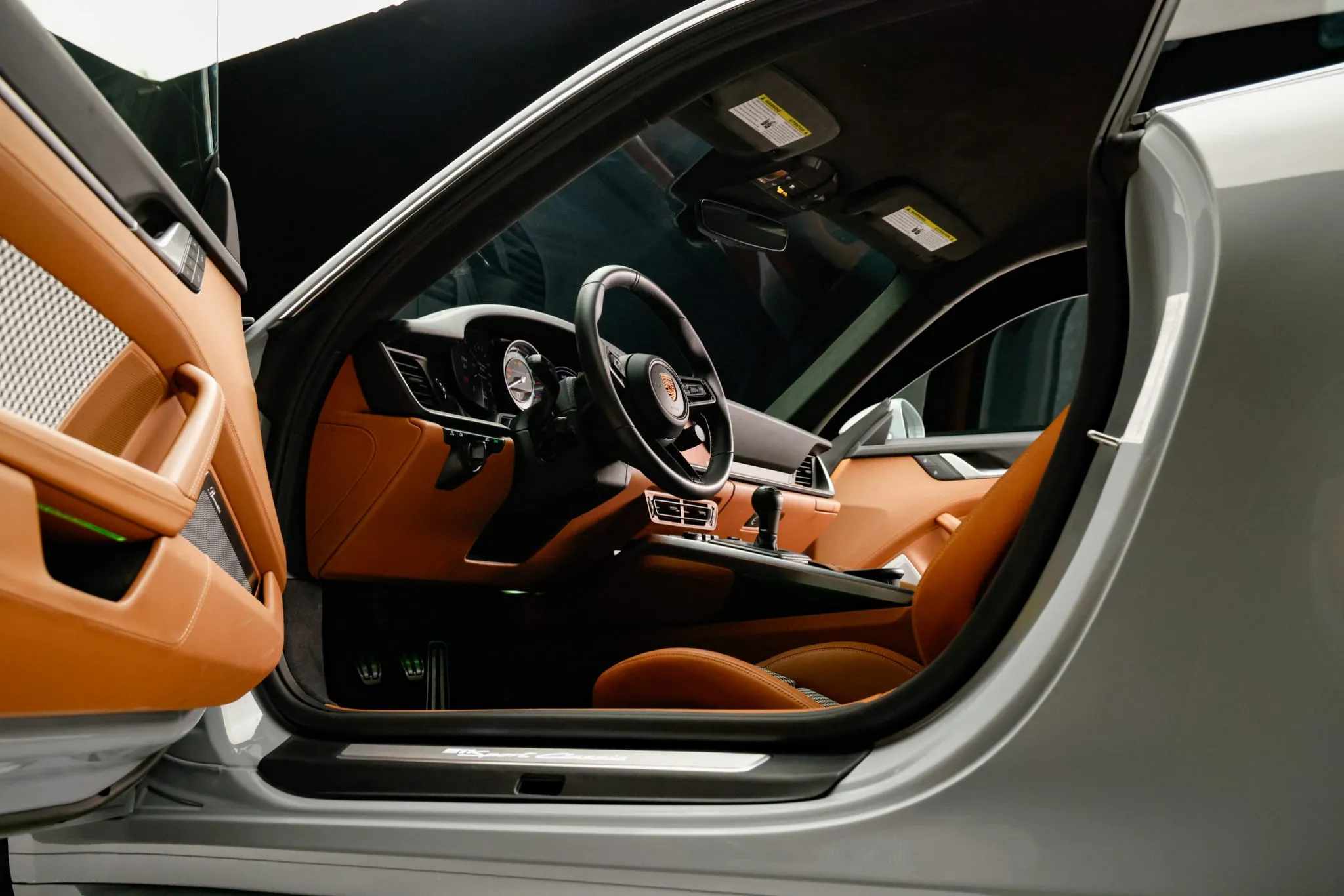 The heated power-adjustable front Sport seats and the folding rear seats are trimmed in Classic Cognac Semi-Aniline Heritage leather with Pepita inserts, and matching hide extends to the dashboard, center console, door panels, and rear side panels. Additional features include a Burmester sound system, dual-zone automatic climate control, cruise control, illuminated door sill guards, and PCM with navigation.
