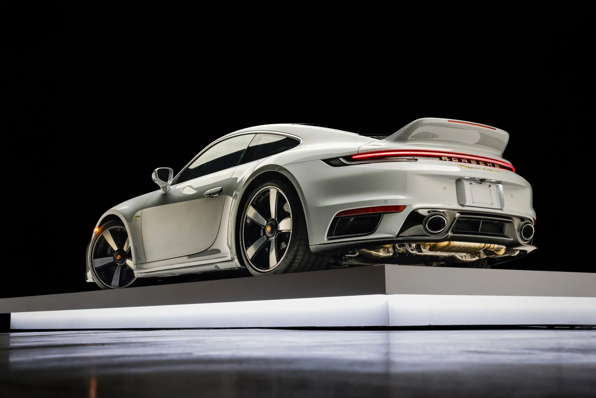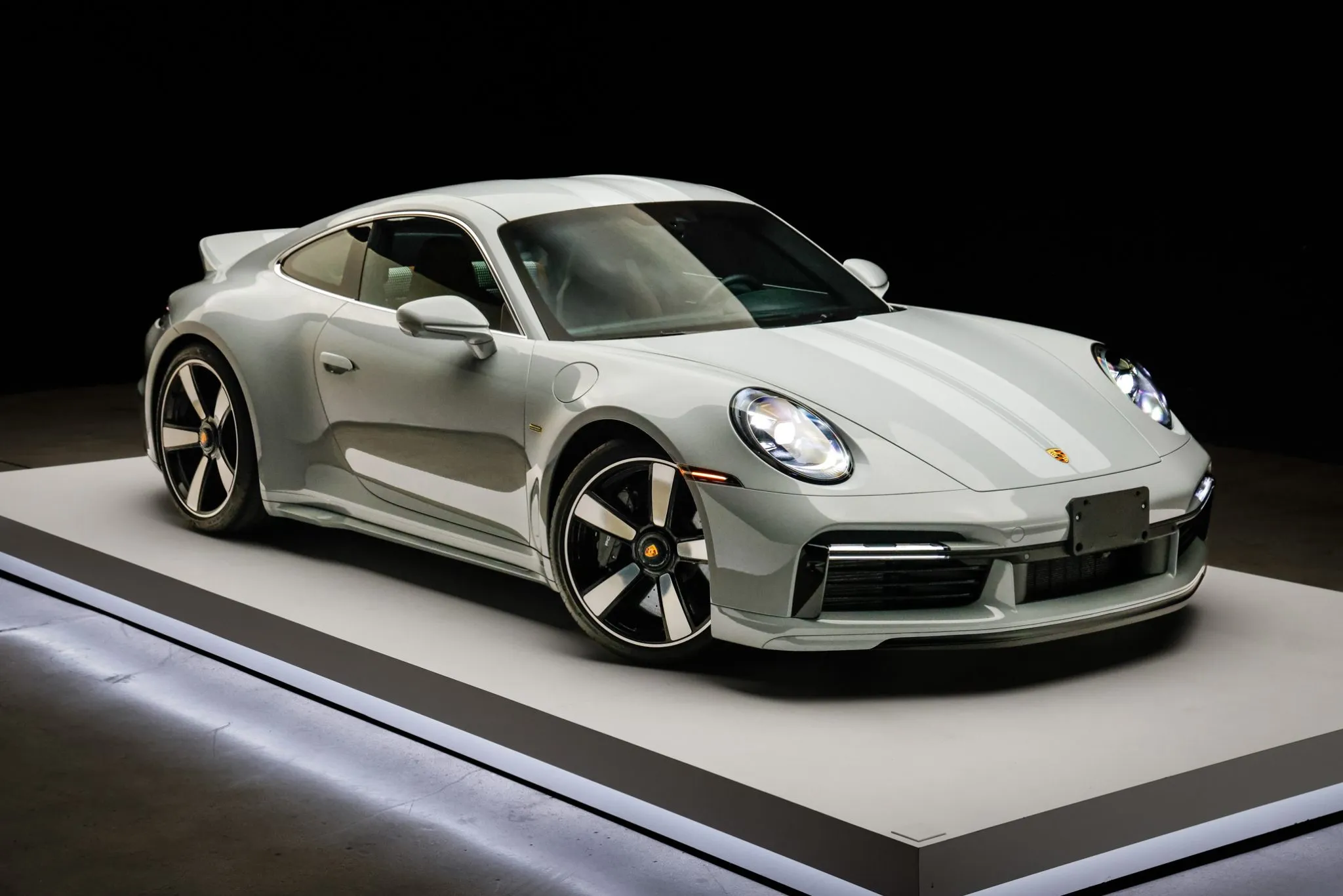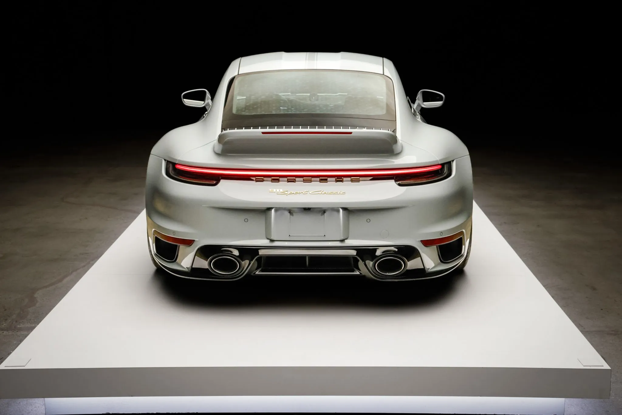 The 911 Sport Classic is based on the 911 Turbo S and pays tribute to the 911 Carrera RS 2.7 from the 1970s with its distinctive ducktail spoiler as well as retro design elements including Fuchs-style alloy wheels and gold badging. This example is finished in Sport Classic Gray Metallic with over-the-top stripes and features a carbon-fiber roof with a double-bubble as well as LED-Matrix Design headlights and a Porsche Heritage rear grille badge.