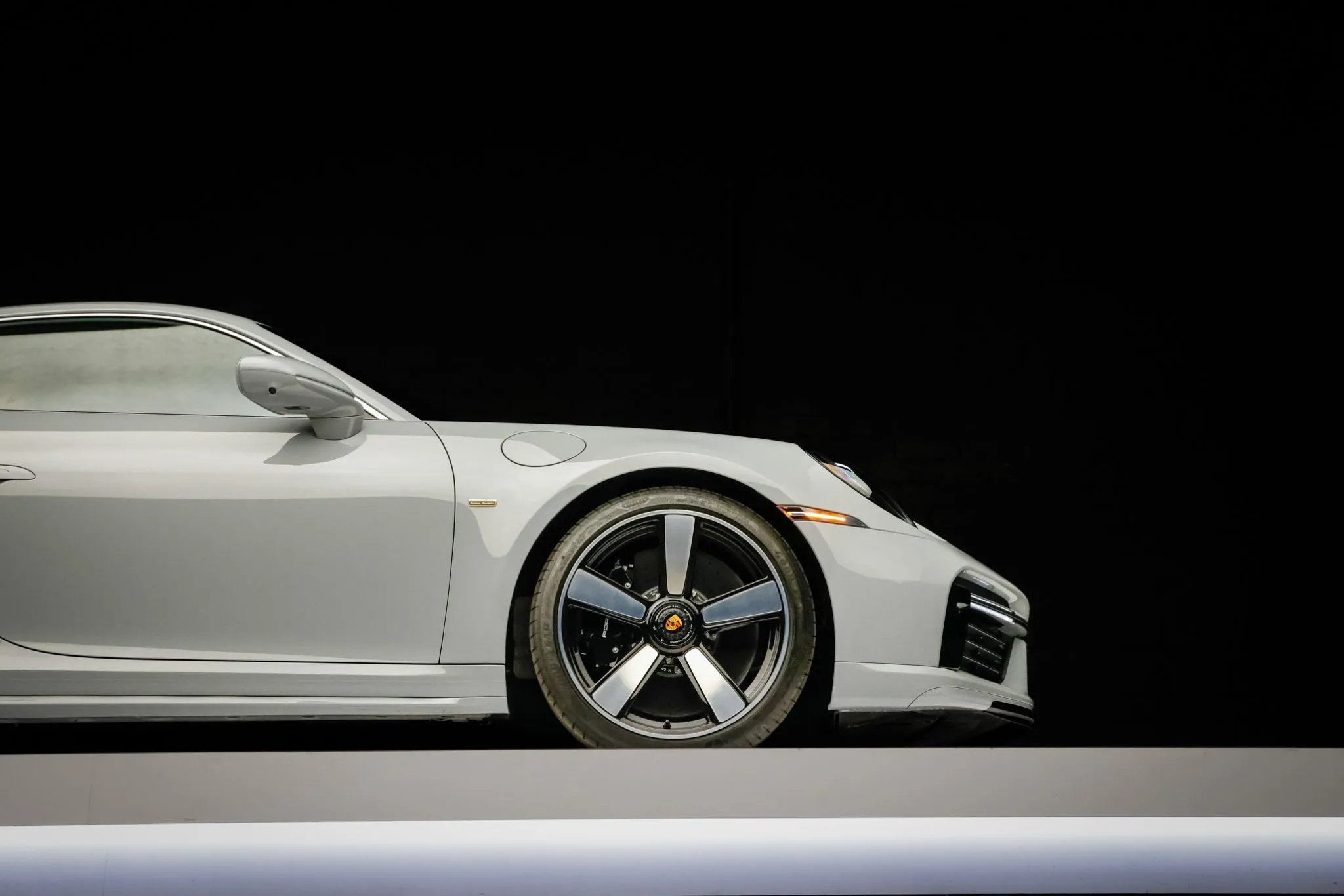 The 20″ and 21″ Sport Classic wheels are mounted with 255/35 front and 315/30 rear Goodyear Eagle F1 Super Sport tires. Stopping power is provided by Porsche Ceramic Composite Brakes (PCCB) with black-finished multi-piston calipers. The car is equipped with Porsche Dynamic Chassis Control (PDCC), Porsche Active Suspension Management (PASM), and rear-axle steering.