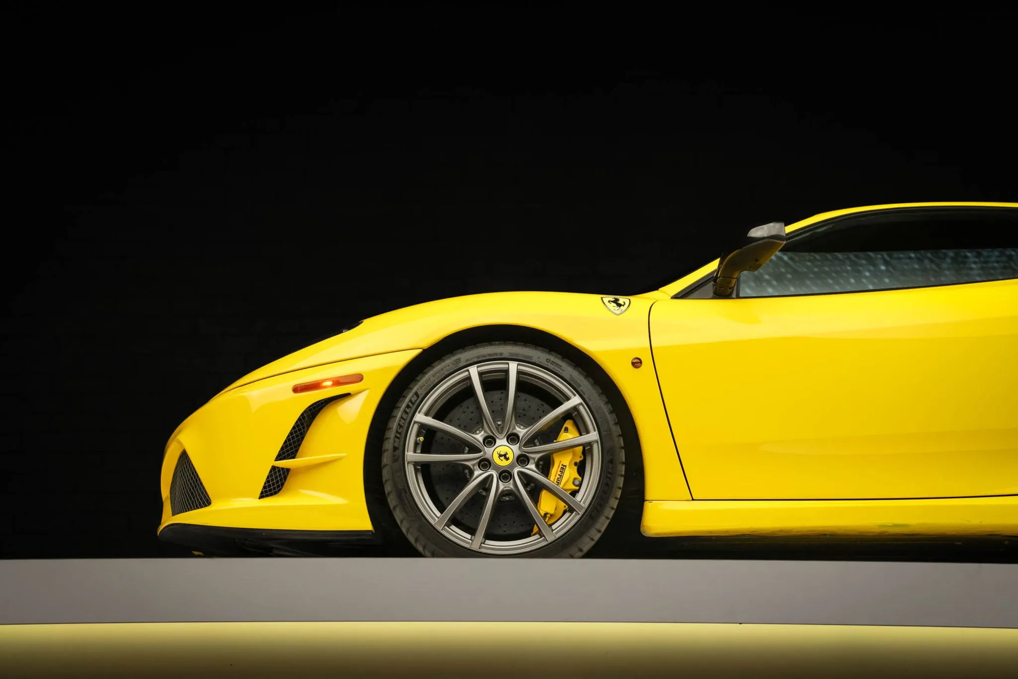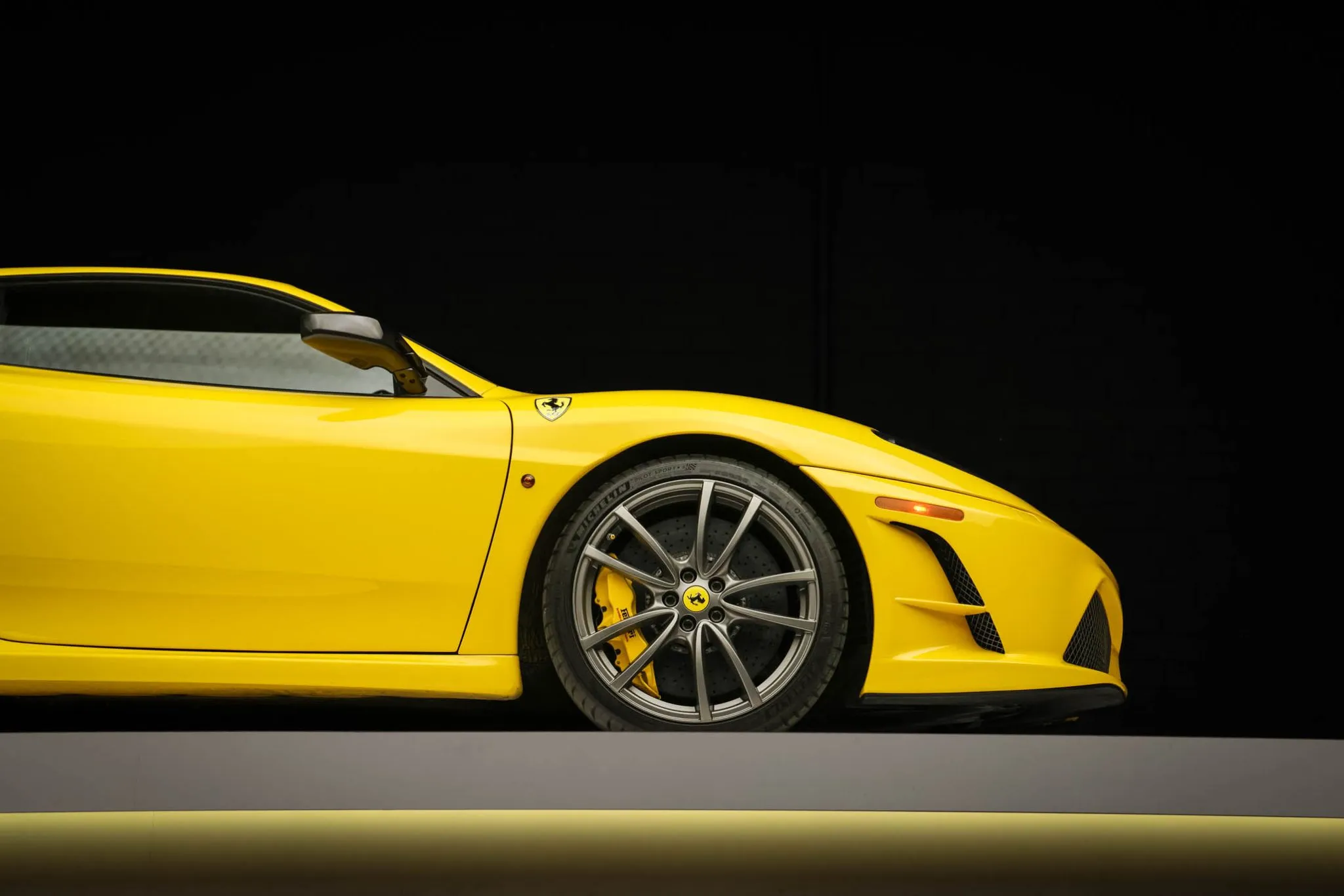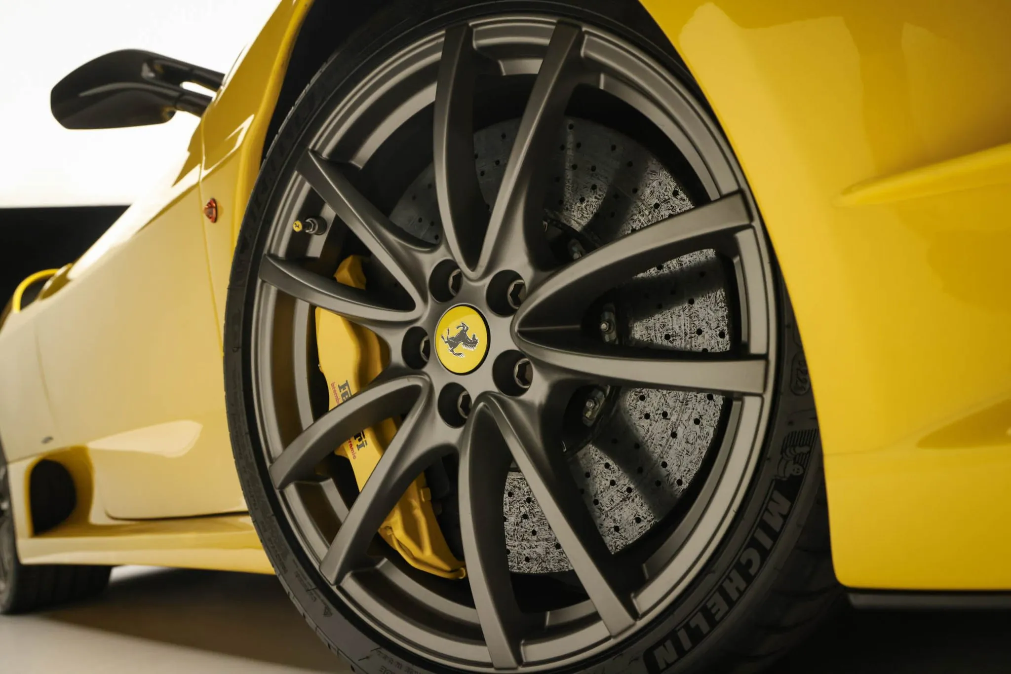 The 19″ Scuderia alloy wheels are mounted with Michelin Pilot Sport 4S tires. Braking is handled by yellow-finished brake calipers fitted over Brembo carbon-ceramic rotors.