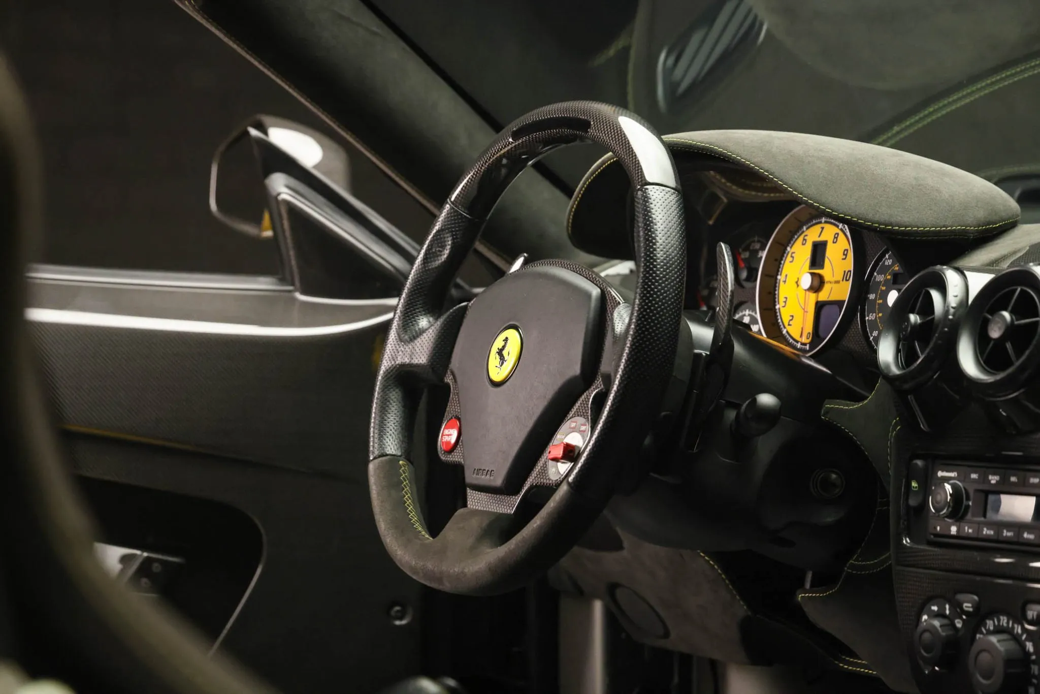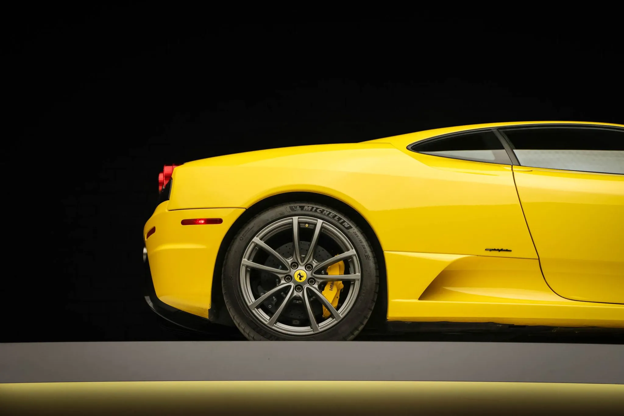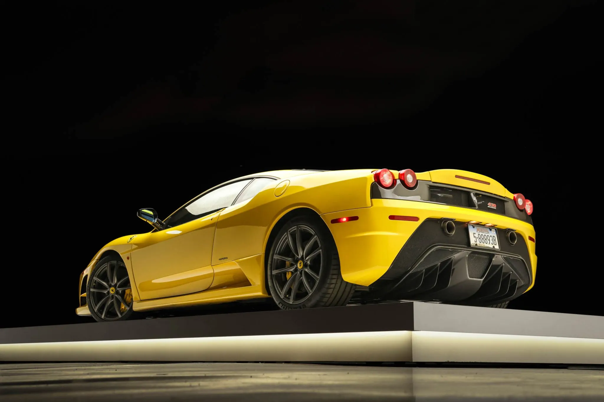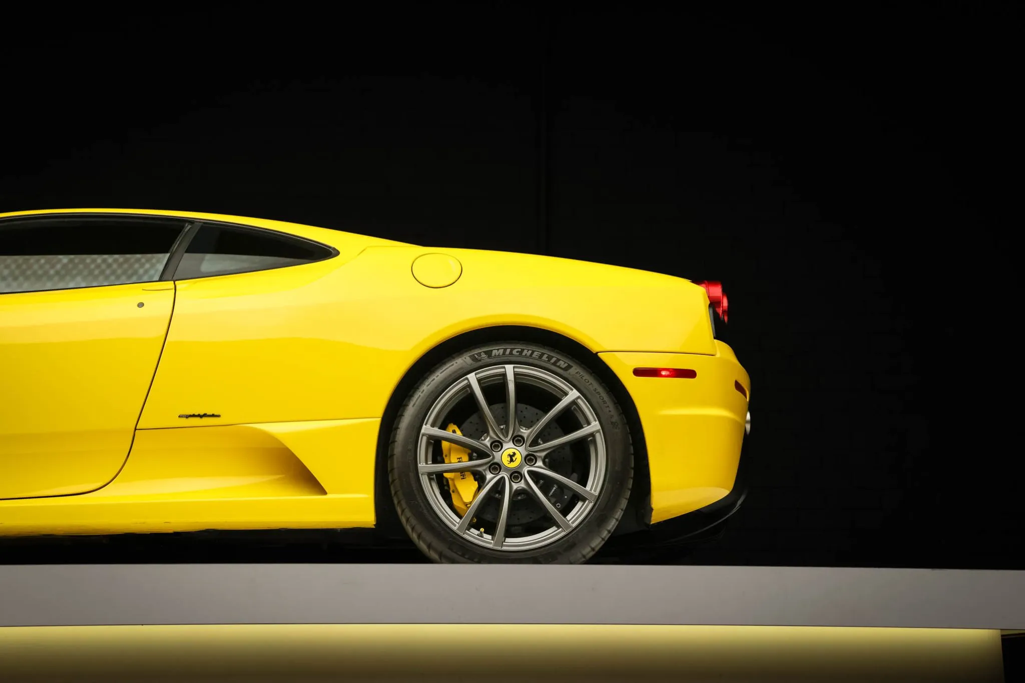The 19″ Scuderia alloy wheels are mounted with Michelin Pilot Sport 4S tires. Braking is handled by yellow-finished brake calipers fitted over Brembo carbon-ceramic rotors.