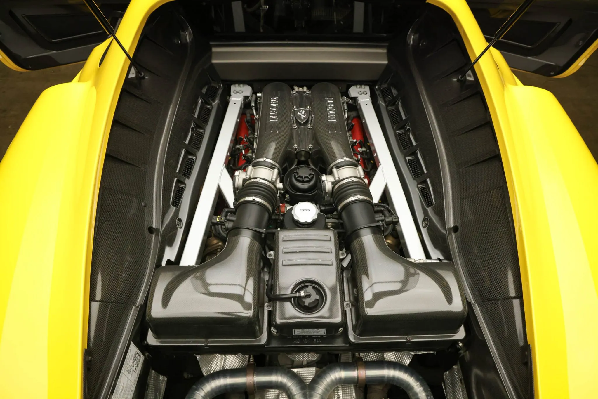 The mid-mounted 4.3-liter V8 features a flat-plane crankshaft, two overhead camshafts per cylinder bank, four valves per cylinder, and an 11.9:1 compression ratio. Output was factory rated at 503 horsepower and 347 lb-ft of torque in Scuderia trim, which is sent to the rear wheels through a six-speed F1 automated transaxle and an electronically controlled limited-slip differential. The engine mounts were replaced in February 2022, and the oil was changed in April 2024.