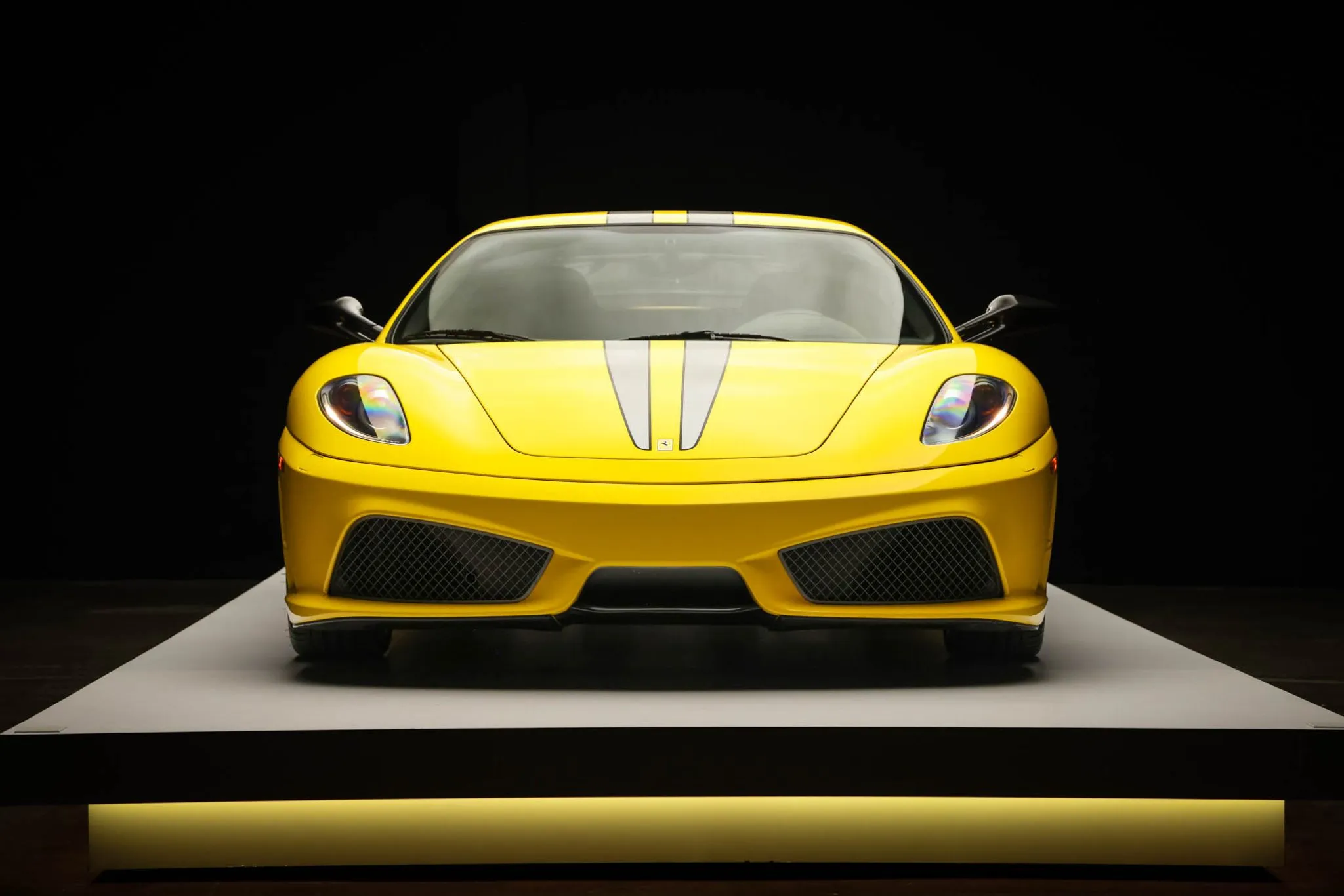 The exterior is finished in Giallo Modena with optional dual racing stripes, and additional equipment includes xenon headlights, Scuderia Ferrari fender shields, a carbon-fiber rear diffuser, and dual exhaust finishers that exit through the rear valance.