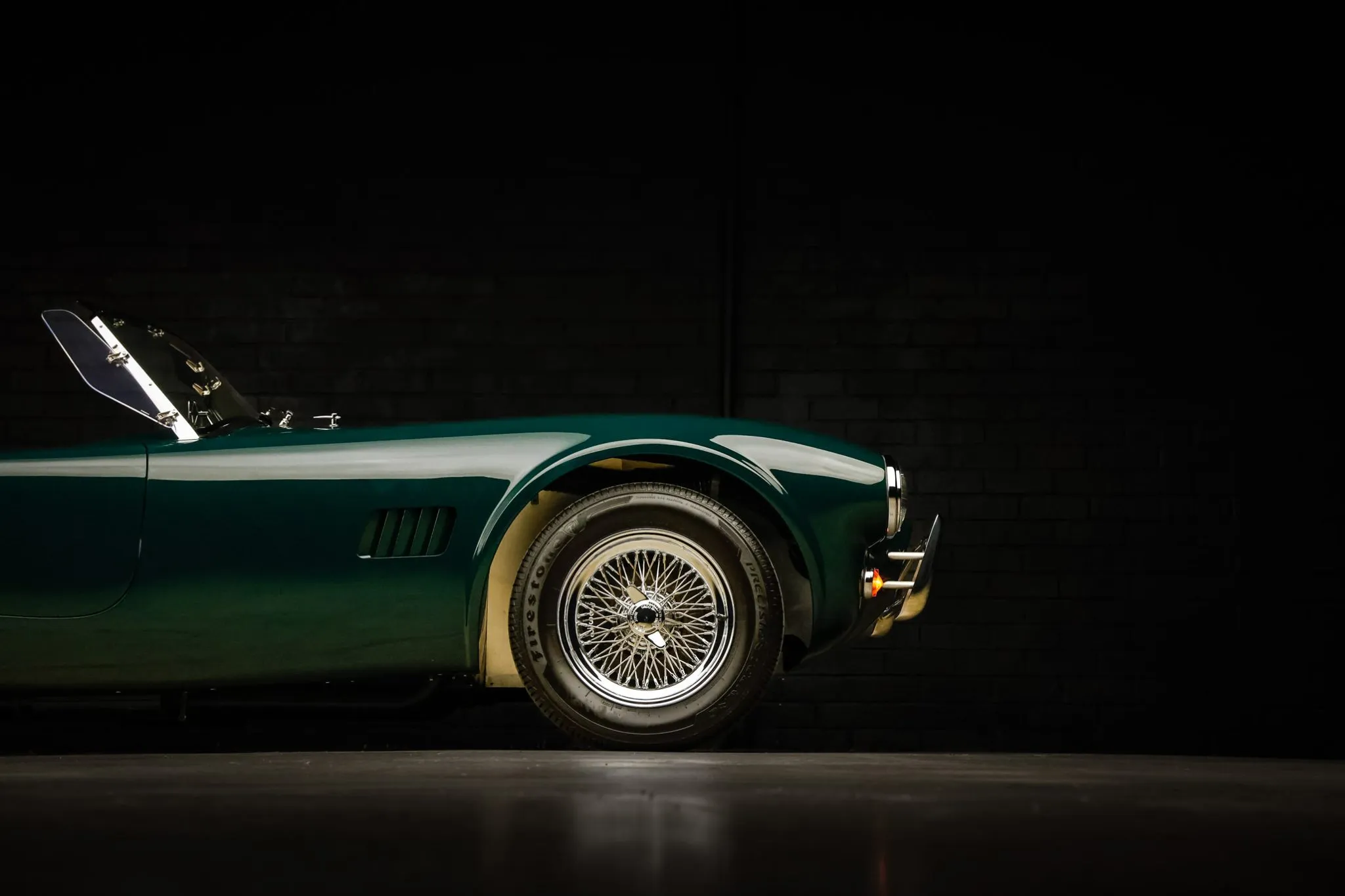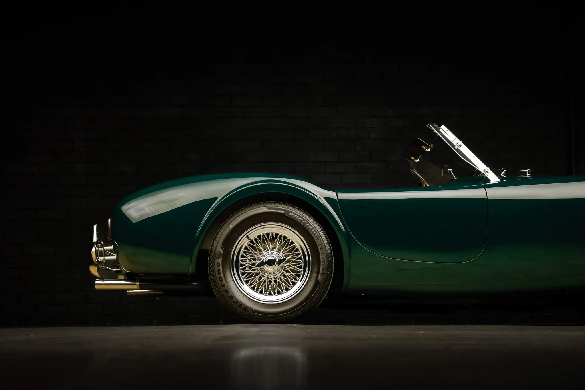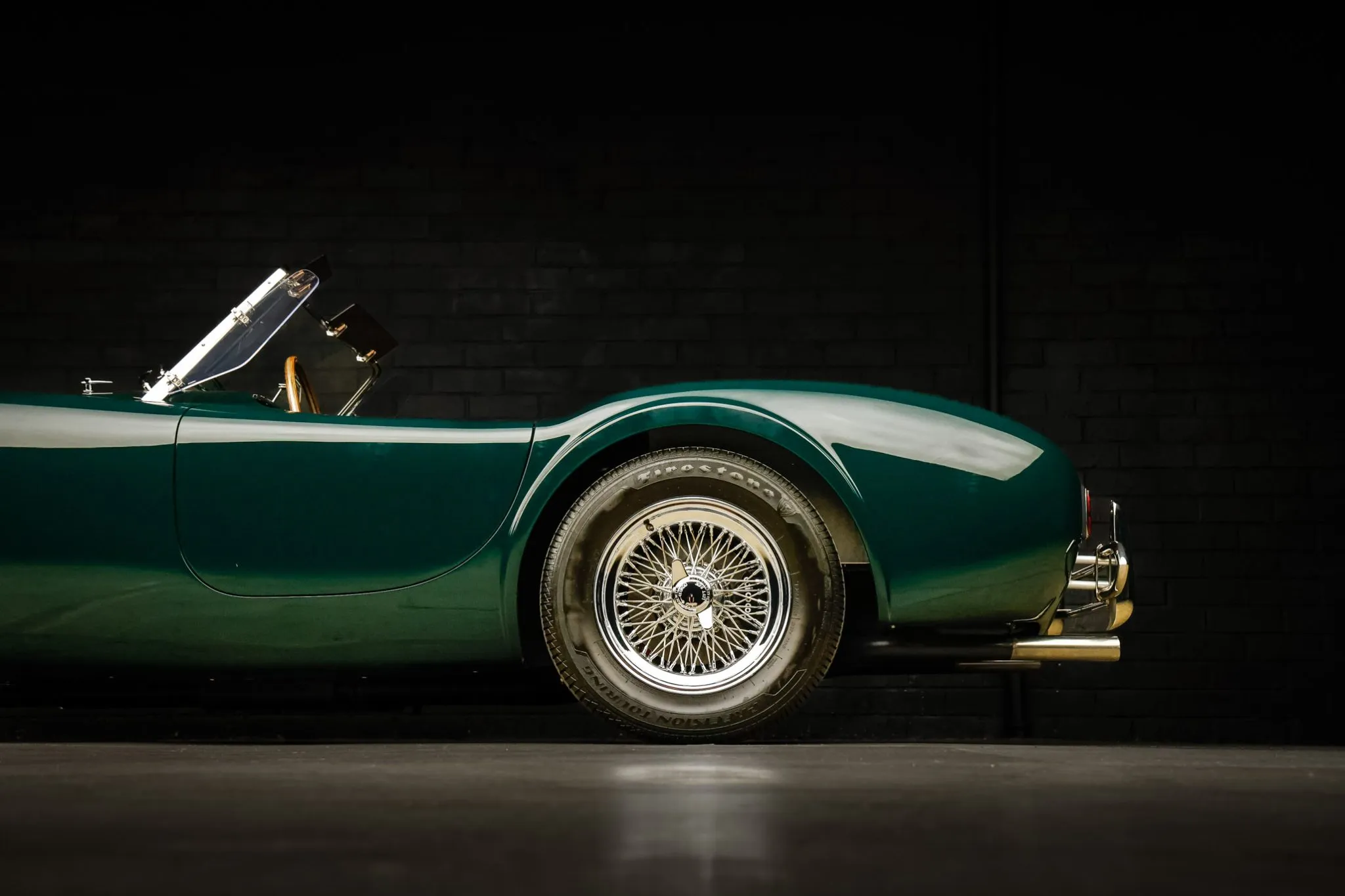 The steel-reinforced slab-side fiberglass body is finished in British Racing Green. Exterior details include chrome bumperettes with tube guards, fender vents, windshield wipers, wind wings, dual rear-exit exhaust pipes, and a Le Mans-style fuel filler.