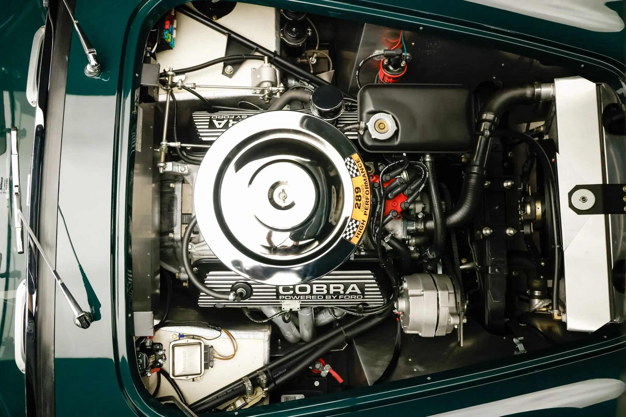 The 302ci V8 features a four-barrel carburetor, an Edelbrock intake manifold, MSD ignition components, Cobra-branded valve covers, and ceramic-coated long tube exhaust headers. Cooling is handled by an aluminum single core radiator with a shroud and dual electric fans.