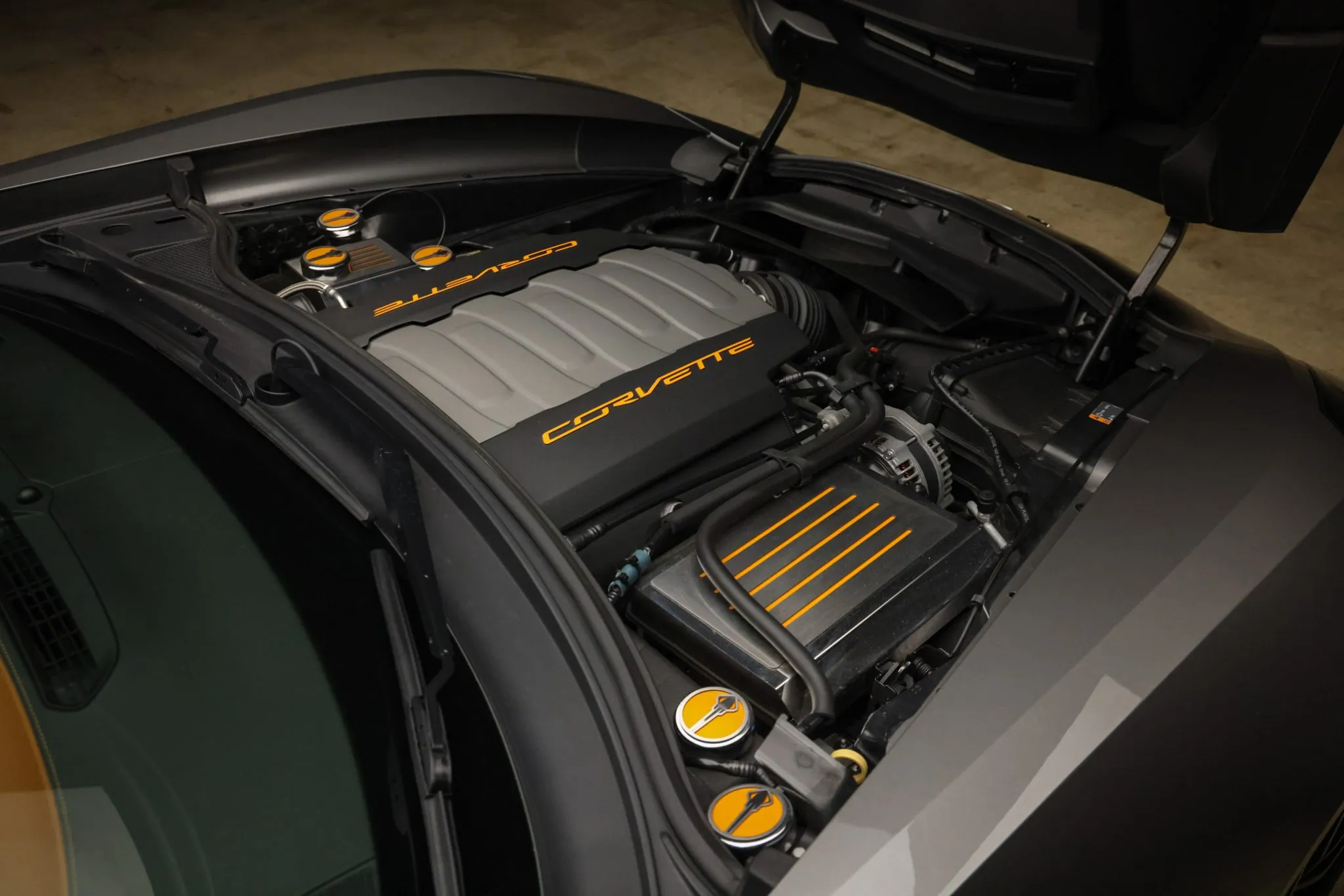 The 6.2-liter LT1 V8 is equipped with a performance exhaust and has been fitted with a stingray-themed dress-up kit. Output was factory rated at 460 horsepower and 465 lb-ft of torque. The oil was changed in 2023.