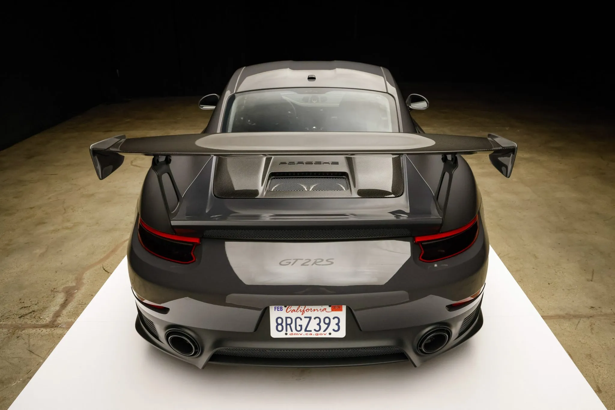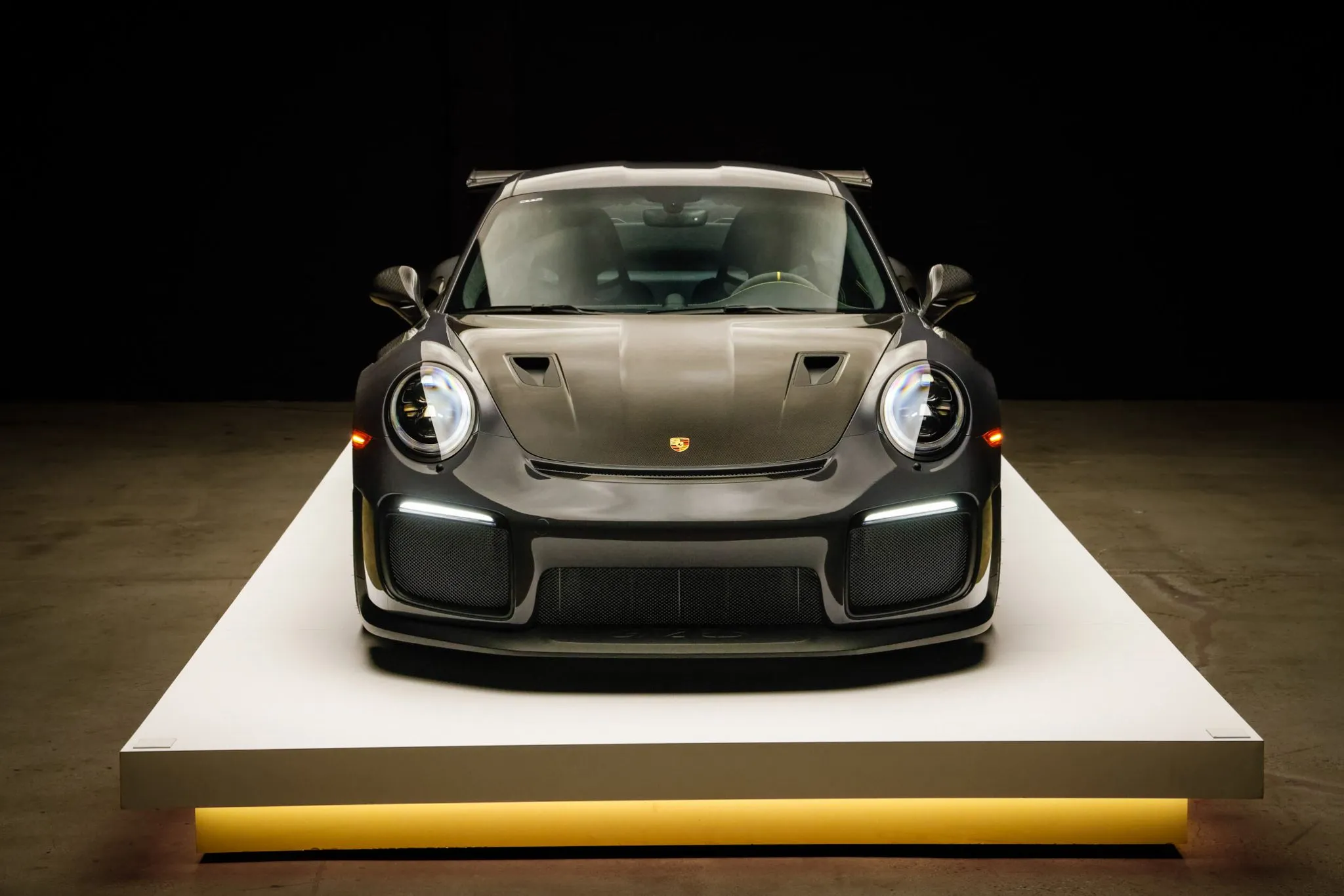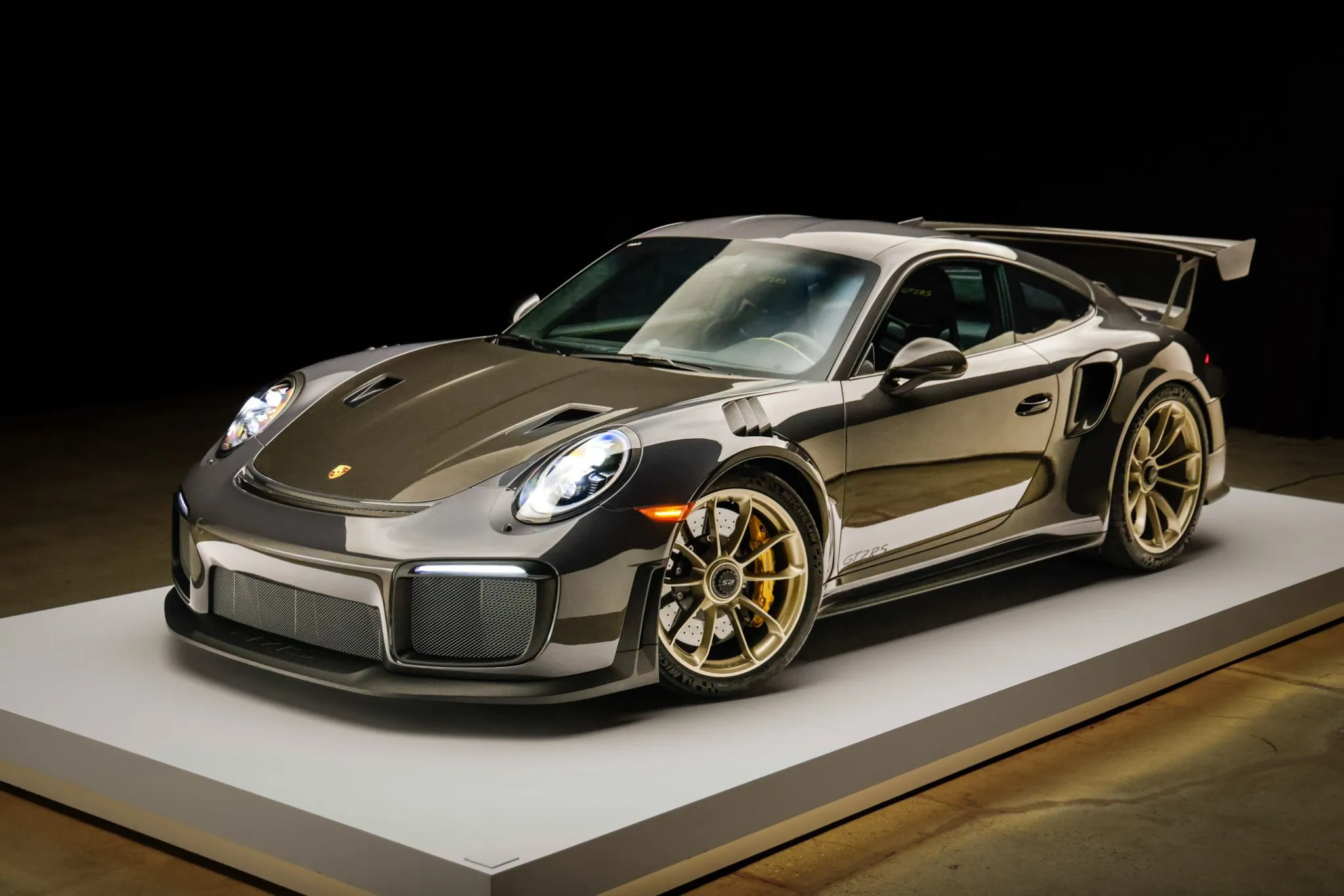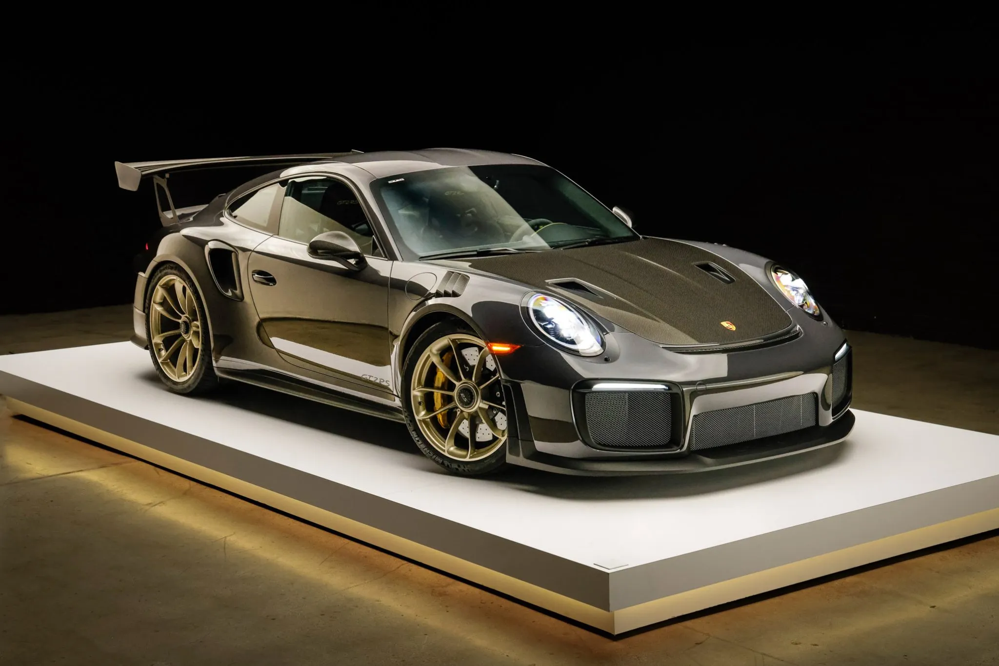 Weight savings were targeted with the GT2 RS program, and Porsche fitted multiple carbon-fiber components, including the hood, front fender vents, side intakes, side mirrors, and rear wing. This example is finished in Grey Black, a ~$12k non-metallic paint-to-sample selection, and features LED headlights with Porsche Dynamic Lighting System, fog lights, and dual exhaust outlets.