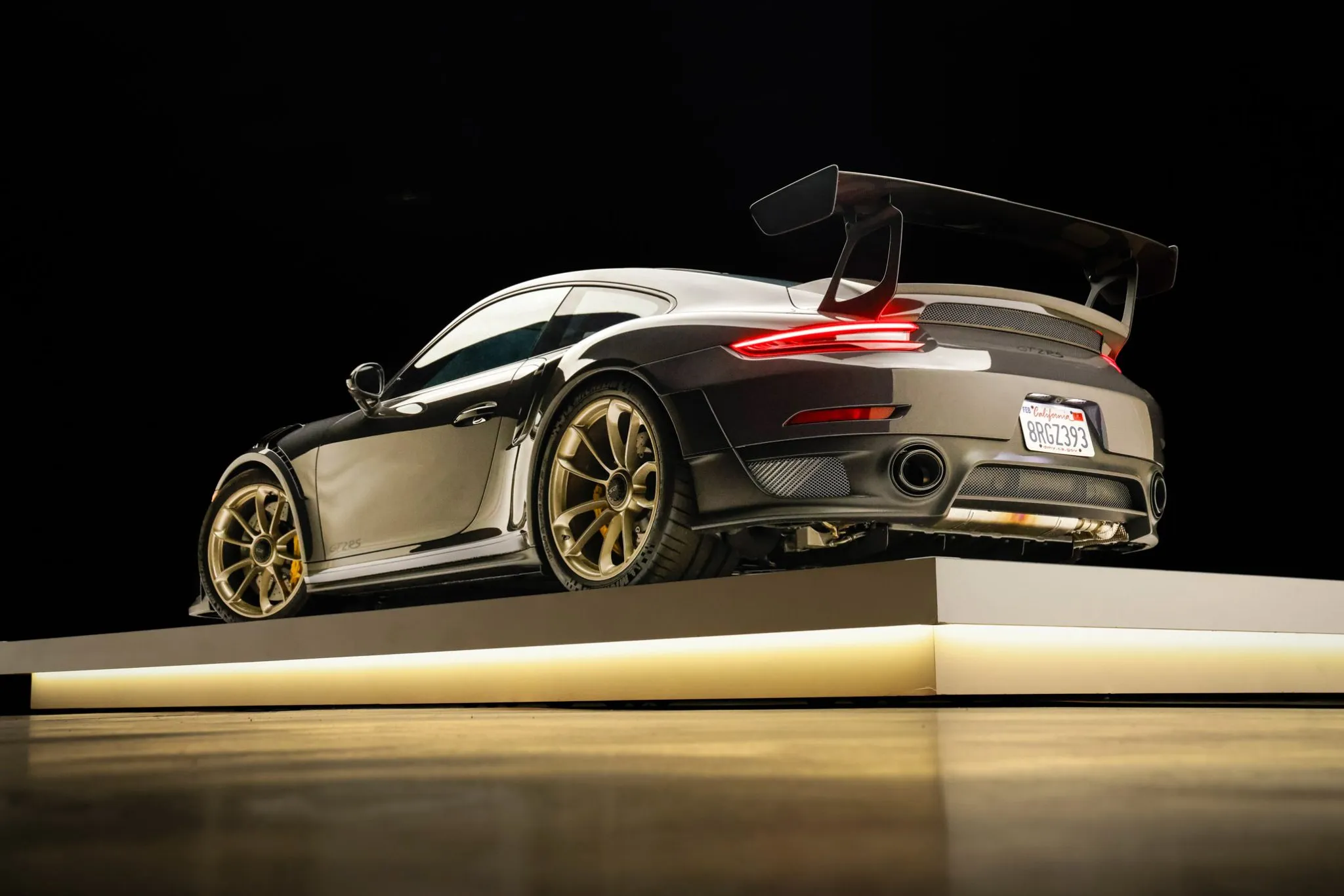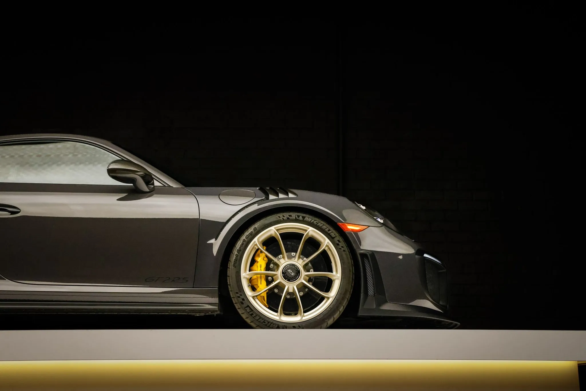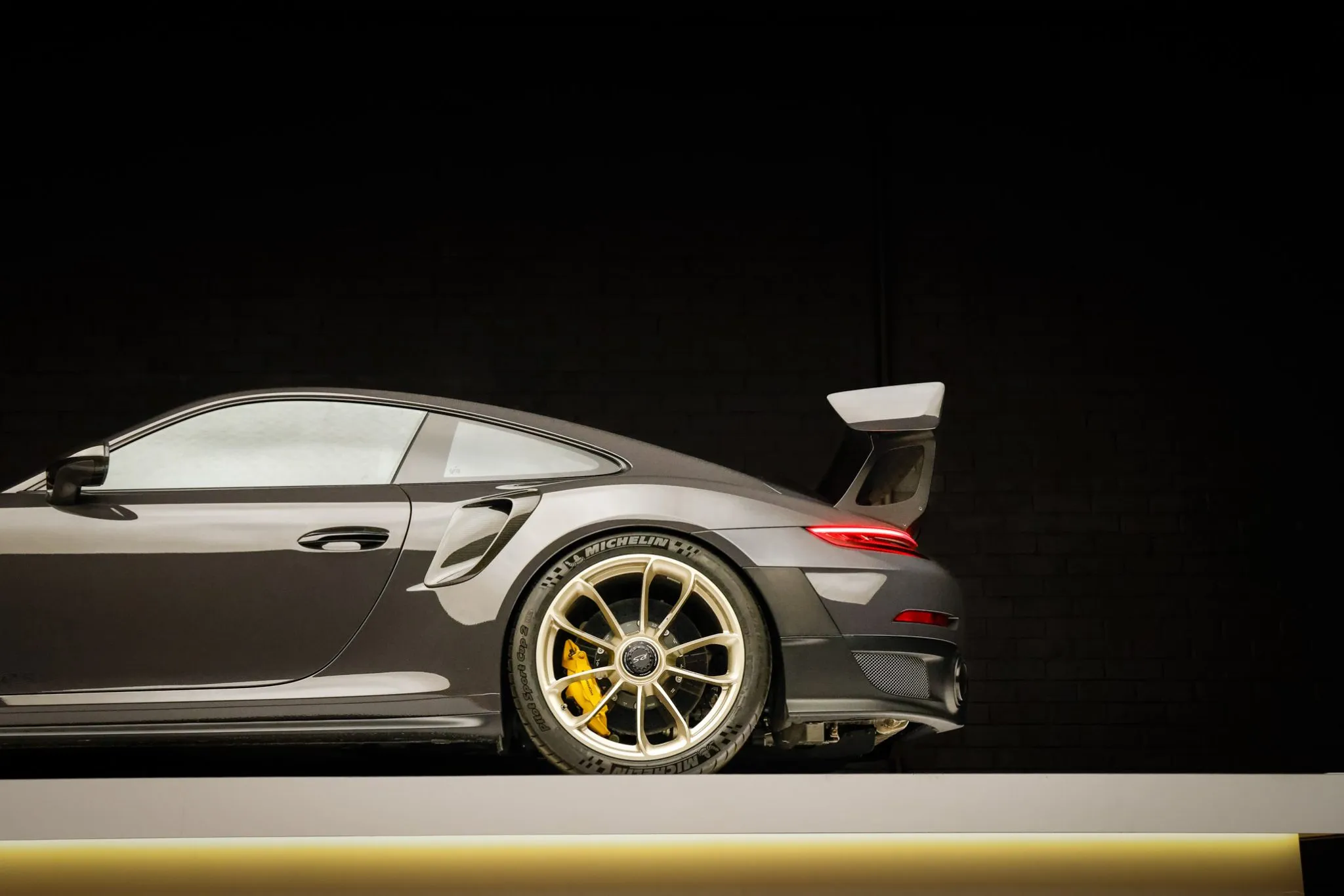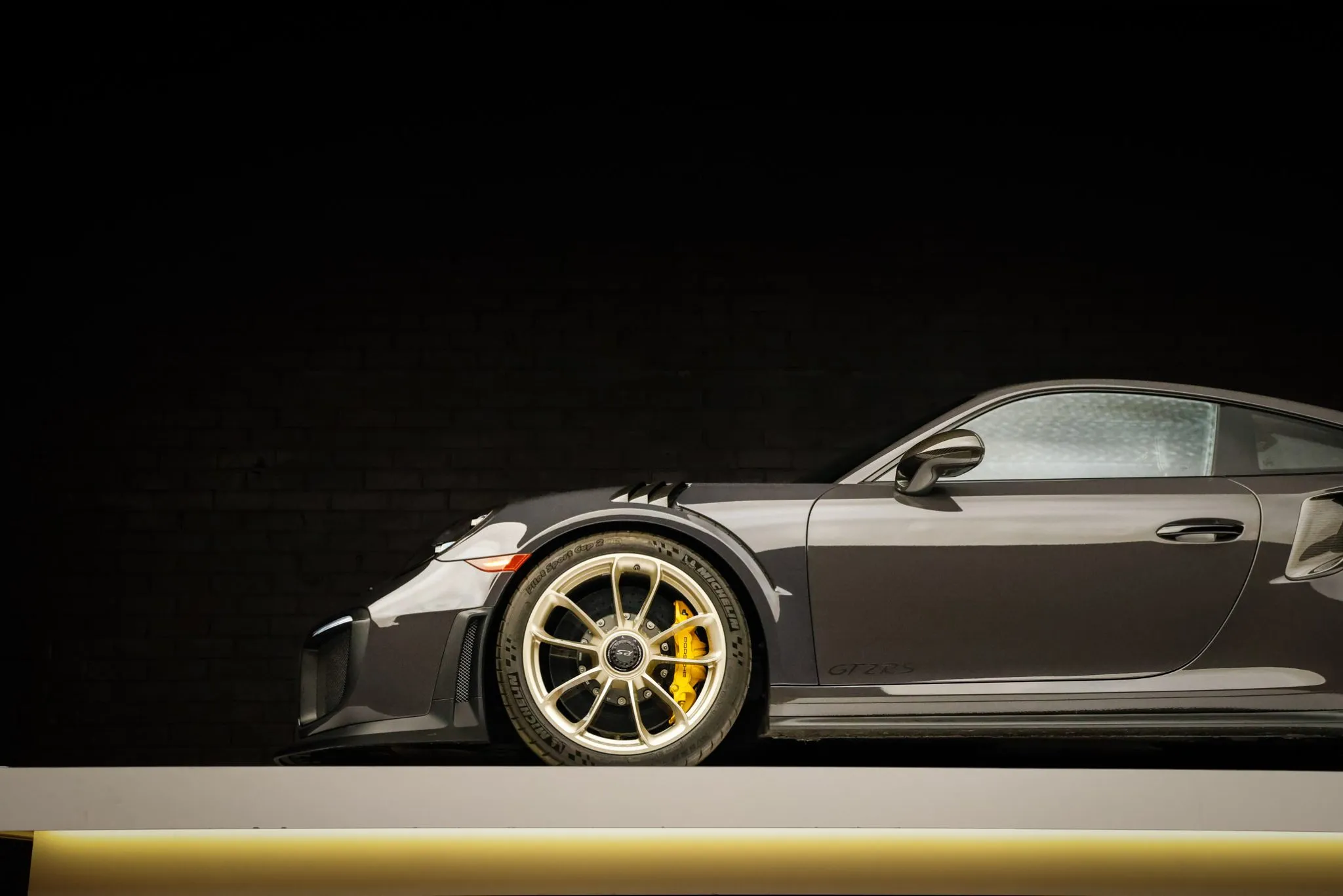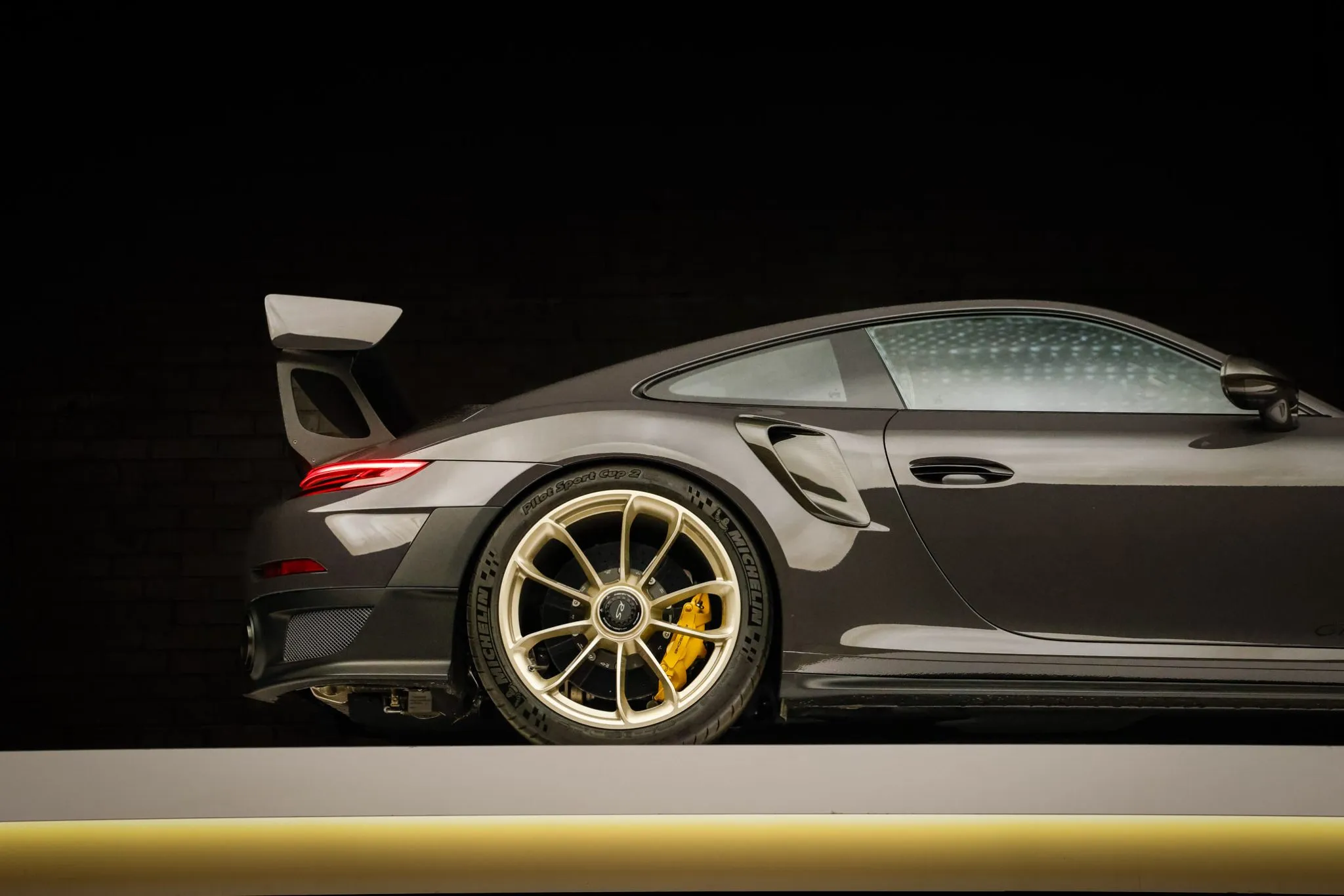 Weight savings were targeted with the GT2 RS program, and Porsche fitted multiple carbon-fiber components, including the hood, front fender vents, side intakes, side mirrors, and rear wing. This example is finished in Grey Black, a ~$12k non-metallic paint-to-sample selection, and features LED headlights with Porsche Dynamic Lighting System, fog lights, and dual exhaust outlets.