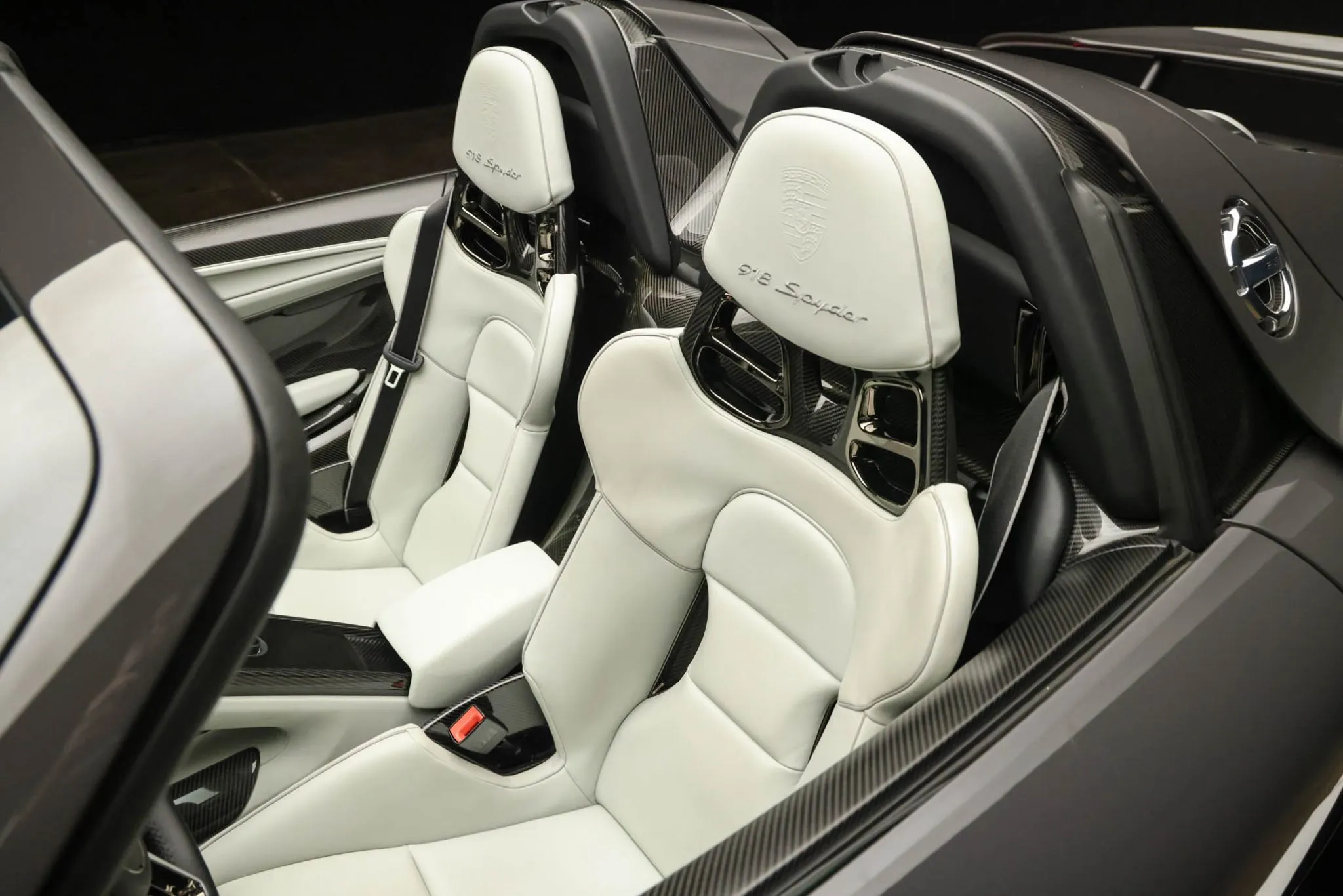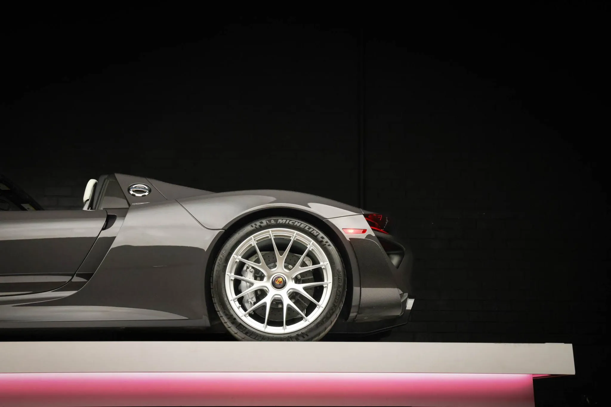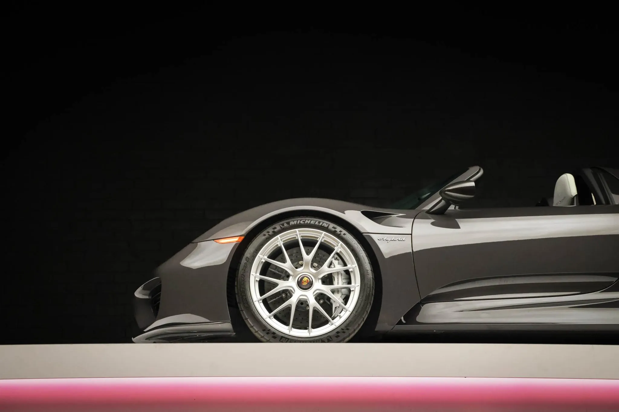 Staggered-diameter 20″ and 21″ 918 Spyder magnesium wheels are mounted with 265/35 front and 325/30 rear Michelin Pilot Sport Cup 2 tires. The adaptive suspension system incorporates a double-wishbone front and multi-link rear setup along with rear-axle steering, Porsche Active Suspension Management (PASM), Porsche Torque Vectoring Plus, and electro-mechanical power steering. Stopping power is provided by silver-painted six-piston front and four-piston rear calipers over ventilated and drilled carbon-ceramic discs measuring 410mm up front and 390mm out back.