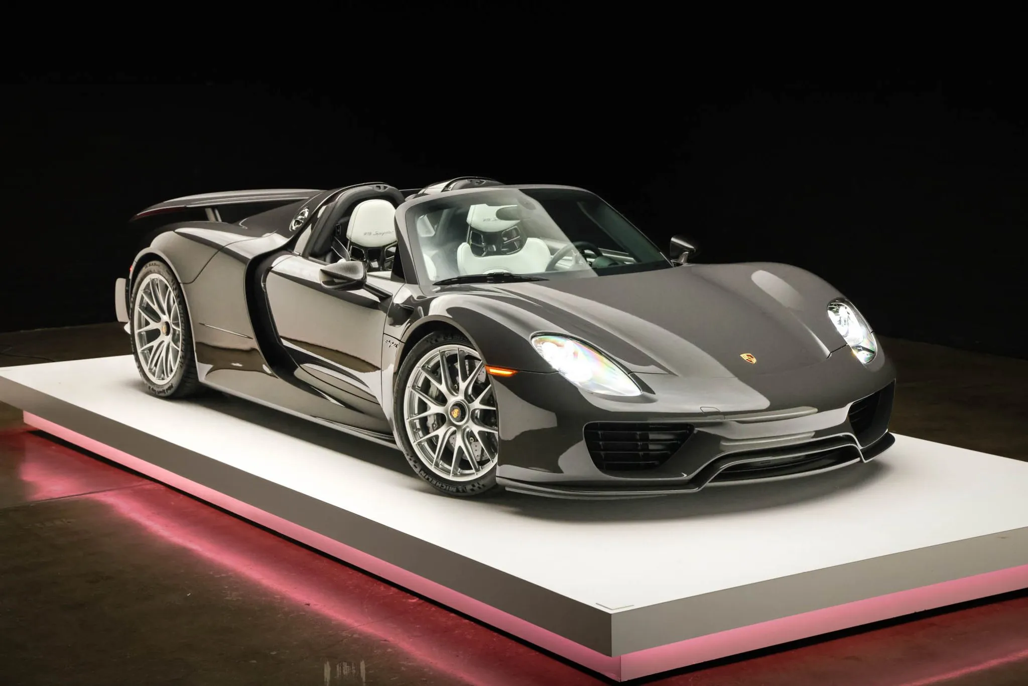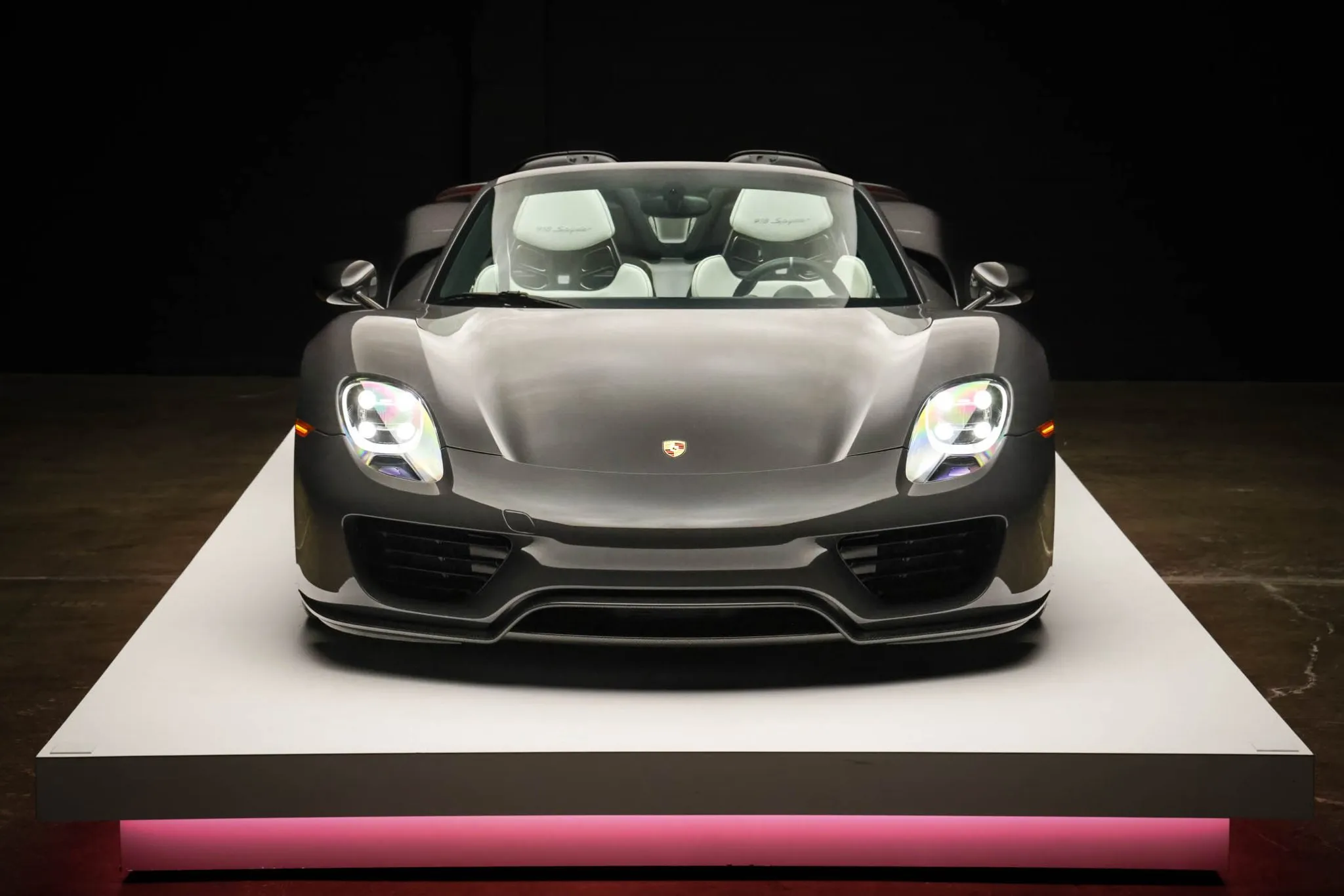 This 2015 Porsche 918 Spyder is #590 of 918 examples built and was delivered new to Niello Porsche of Rocklin, California. It has 5k miles and has had three registered owners. The car is finished in paint-to-sample Grey Black over a white leather-to-sample interior, and is powered by a 4.6-liter V8 that works in conjunction with dual electric motors that drive all four wheels through a seven-speed PDK automatic transaxle. Equipment includes 20″ and 21″ 918 Spyder magnesium wheels, an electro-mechanical limited-slip differential, a front-axle lift system, the Porsche Active Aerodynamics system, rear-axle steering, LED headlights, a back-up camera, $7k in Custom Tailoring options, a Burmester surround sound system, the Carbon-Fiber Interior Package, dual-zone climate control, glare-reducing interior components, and a 6.8-kWh lithium-ion battery pack mounted behind the passenger compartment. This 918 Spyder is now offered in Newbury Park, California, on dealer consignment with a window sticker, a build sheet, a car cover, factory literature, and a clean Montana title.