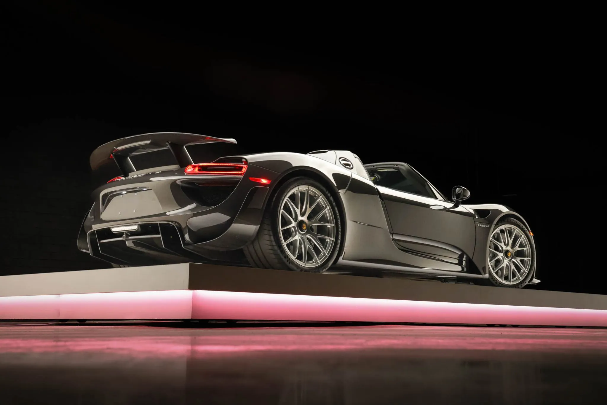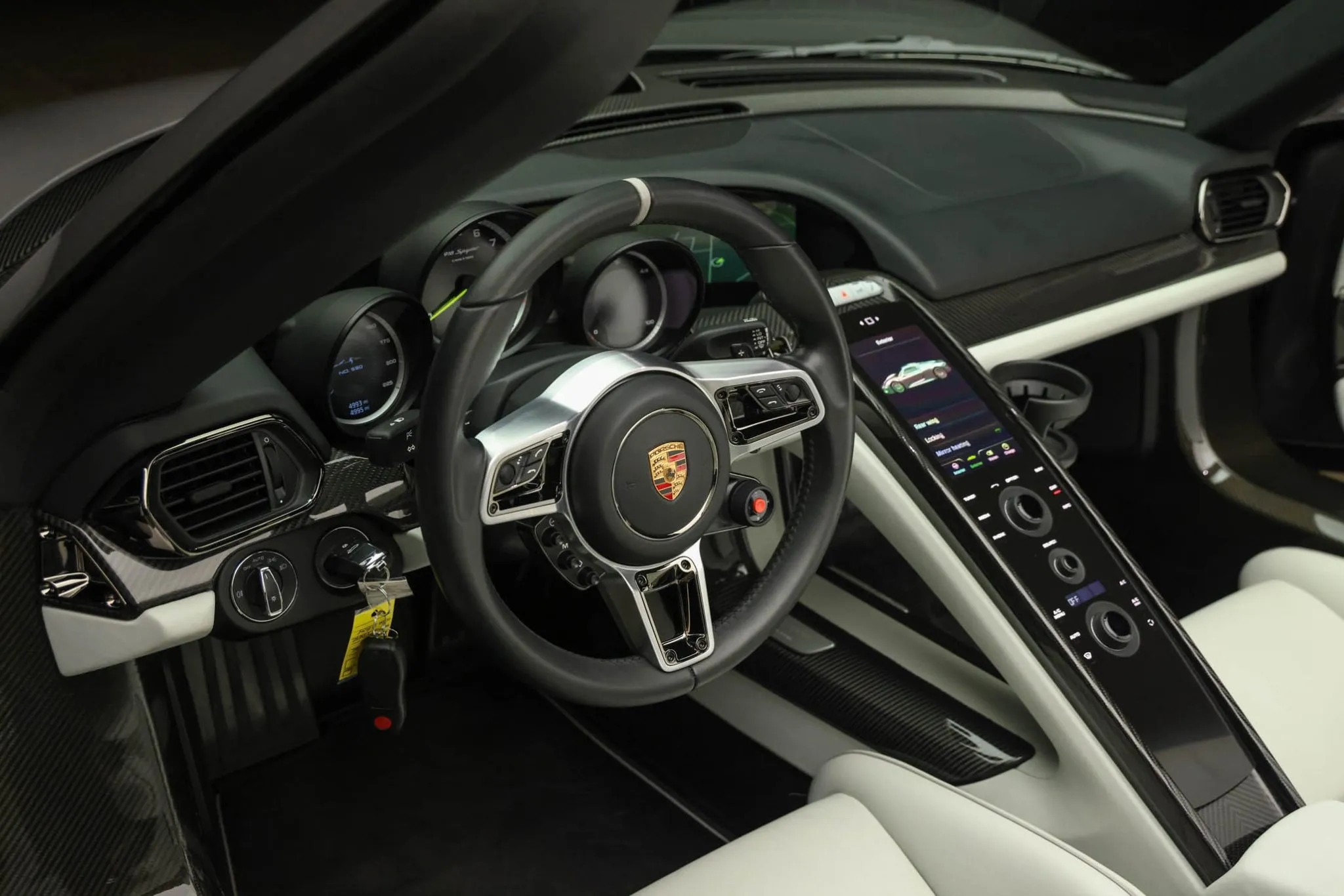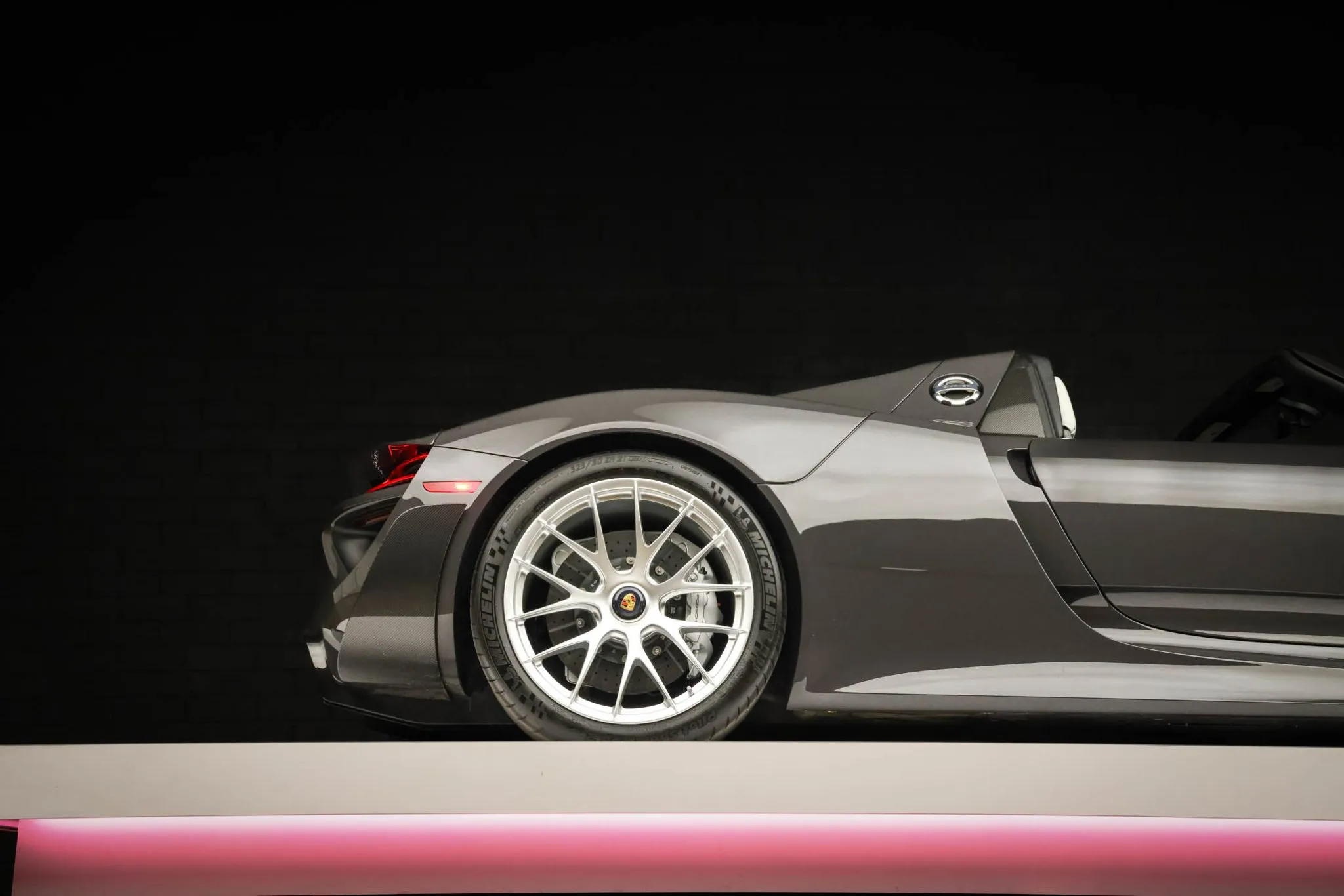 The Michael Mauer-designed 918 Spyder was unveiled as a concept at the 2010 Geneva Motor Show and entered production in September 2013, with all examples produced as 2015 models. Construction incorporates a carbon-fiber-reinforced polymer monocoque chassis with carbon fiber also utilized for the body panels and removable roof panels.