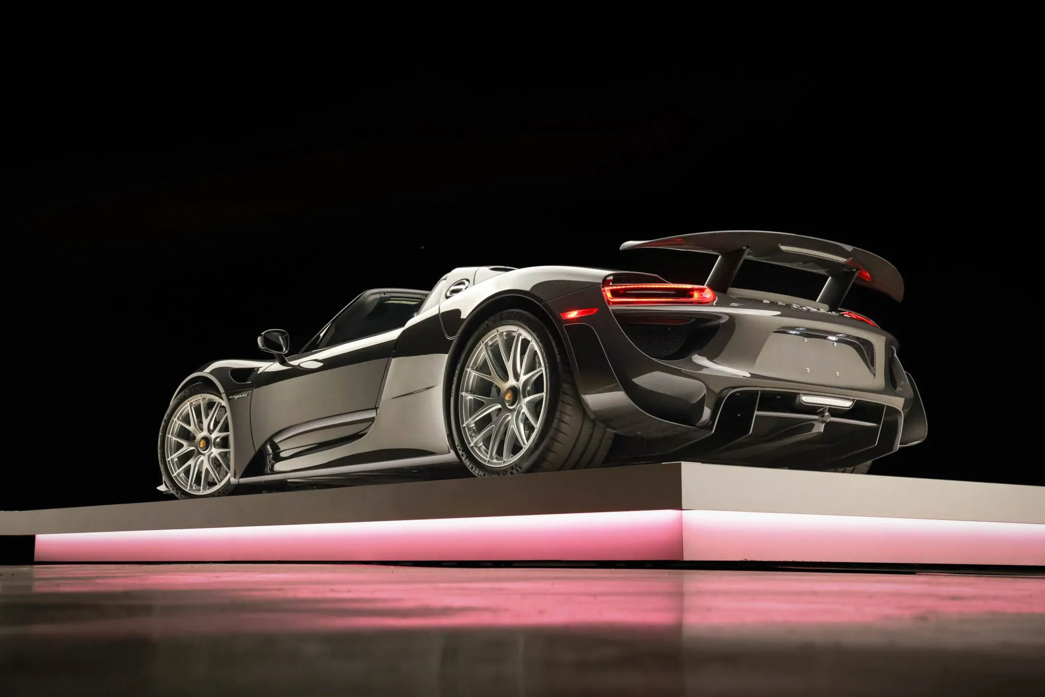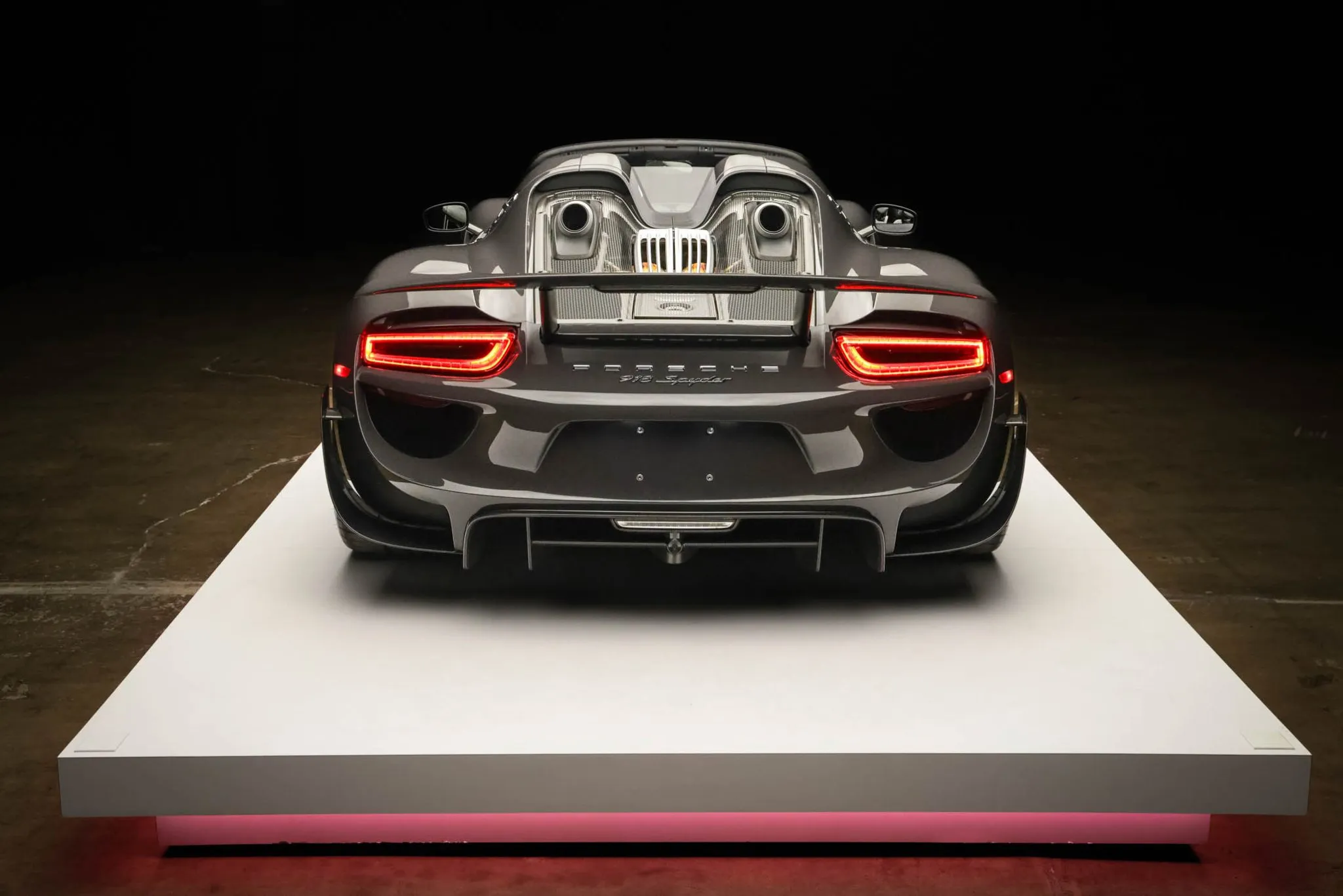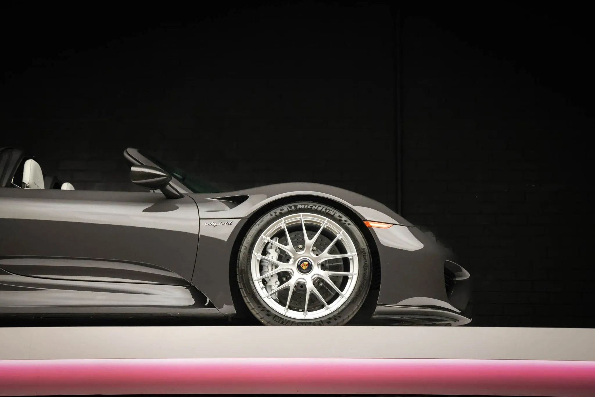 The Michael Mauer-designed 918 Spyder was unveiled as a concept at the 2010 Geneva Motor Show and entered production in September 2013, with all examples produced as 2015 models. Construction incorporates a carbon-fiber-reinforced polymer monocoque chassis with carbon fiber also utilized for the body panels and removable roof panels.