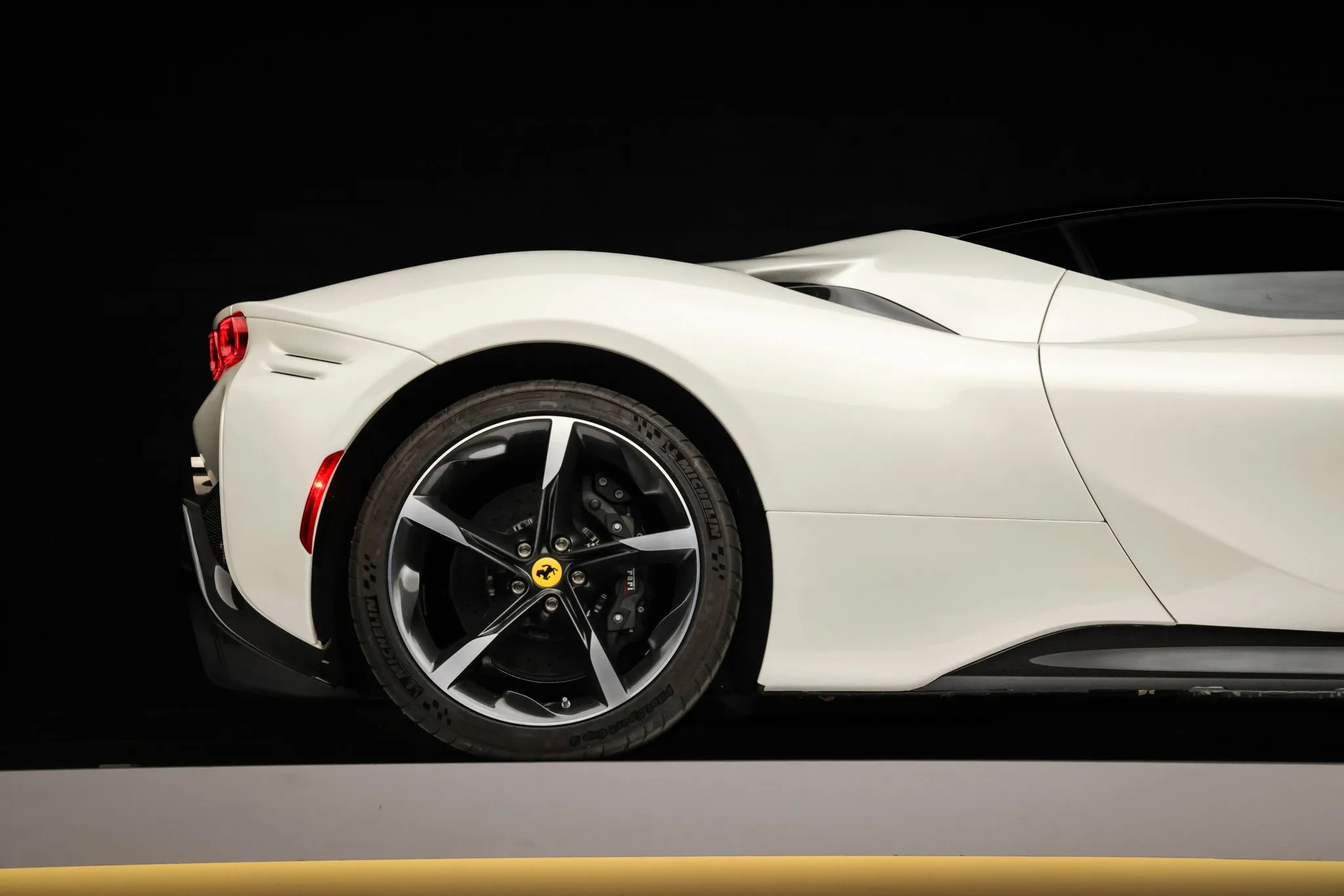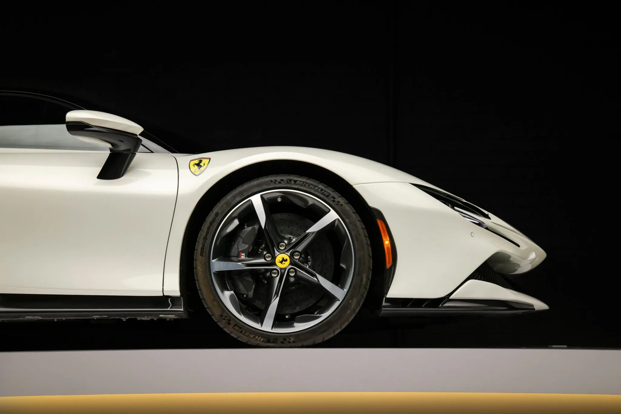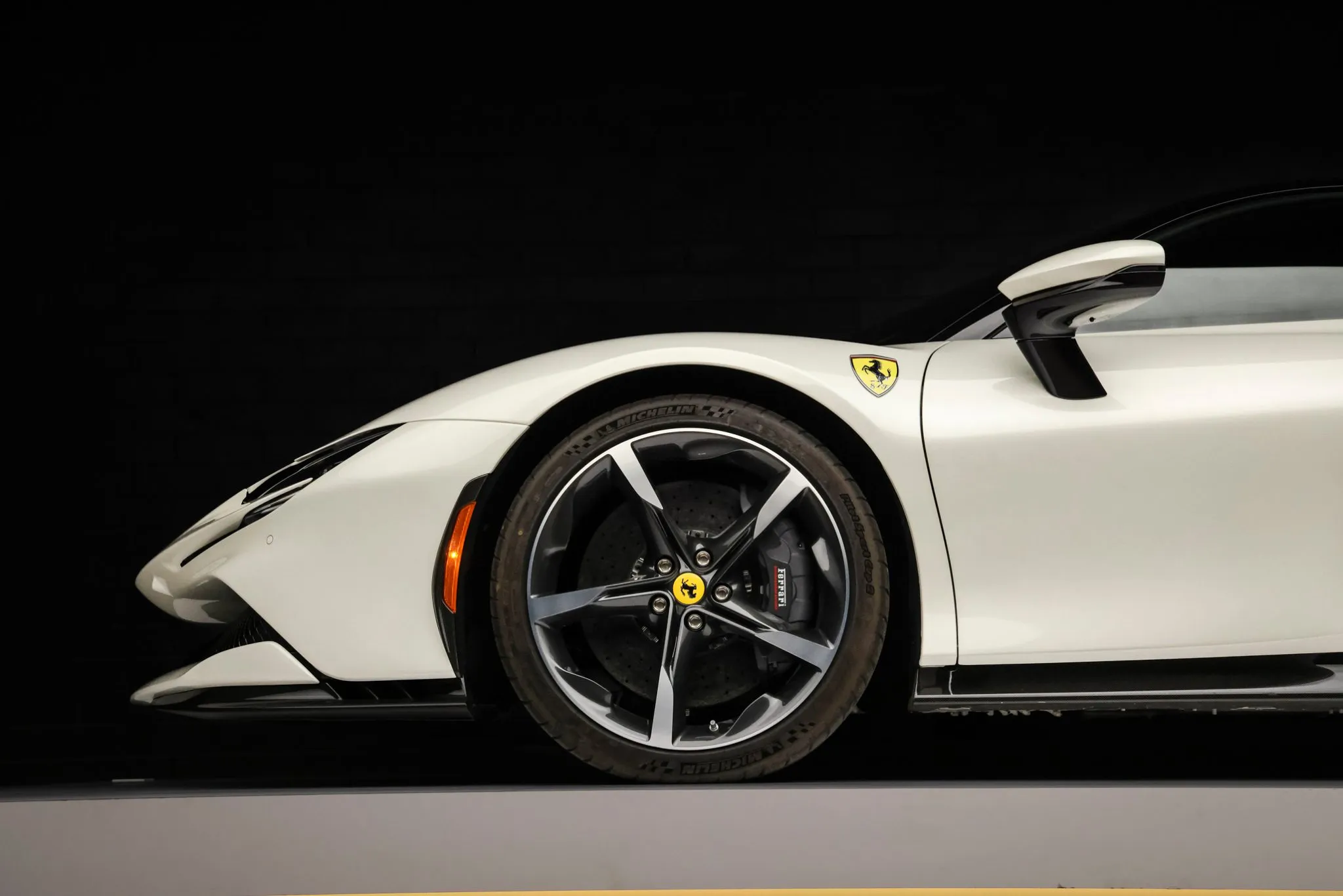 The SF90 was designed by director Flavio Manzoni’s team at the Ferrari Styling Center and was introduced to commemorate the 90th anniversary of the Scuderia Ferrari racing team. This example is finished in Extra Range four-layer Bianco Italia paintwork with a Nero DS roof and a carbon-fiber rear diffuser, front spoiler, and side air splitters. Additional details include adaptive headlights, front and rear cameras, Scuderia Ferrari fender shields, and front and rear parking sensors. A Formula 1–inspired drag-reduction system utilizes active aerodynamics, a two-piece rear wing, and underbody vortex generators. A paint chip is highlighted in the gallery.