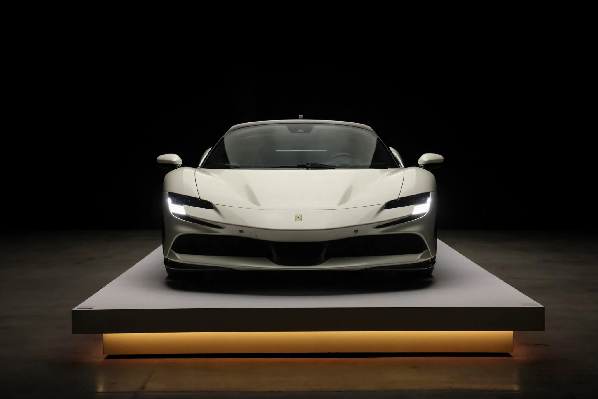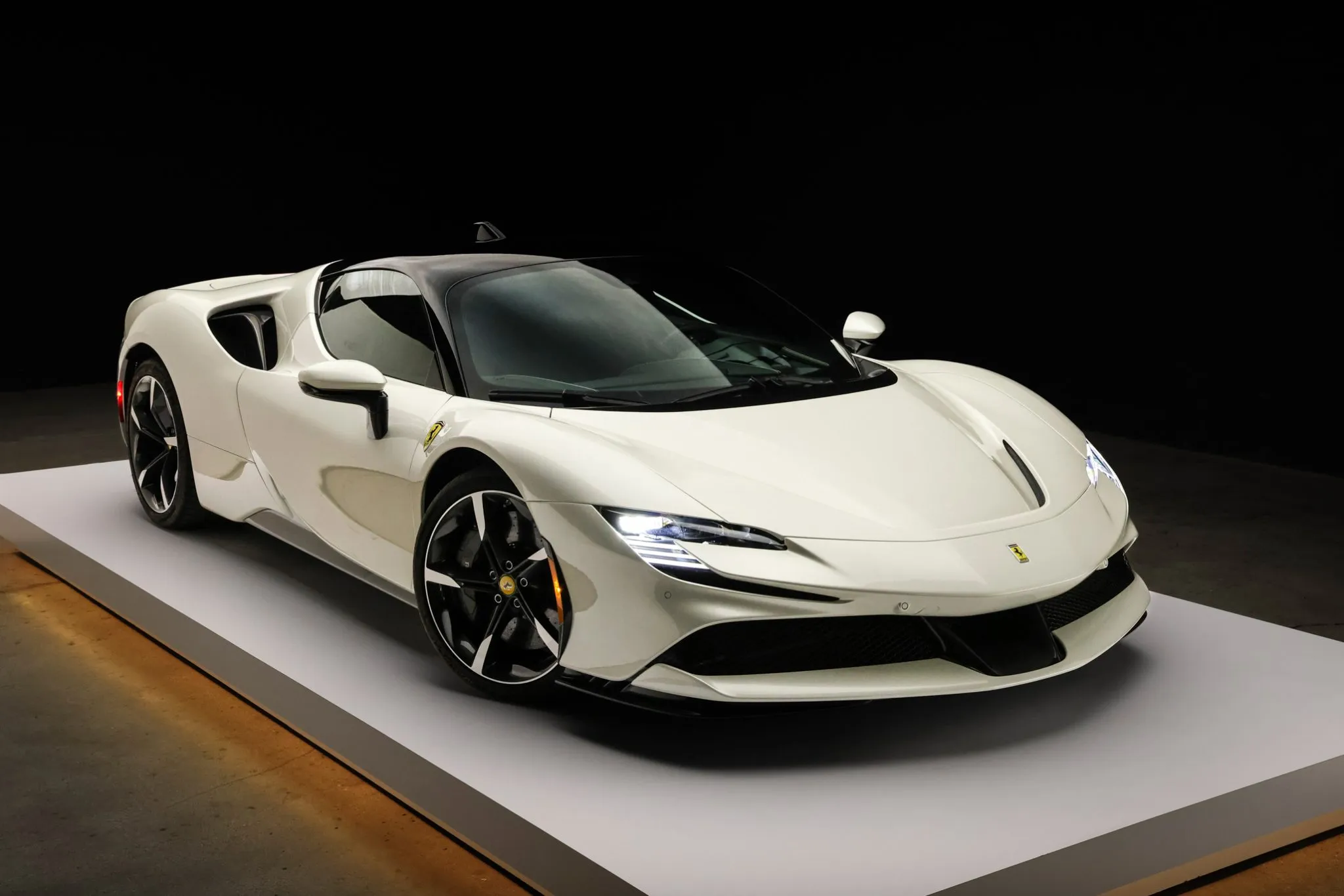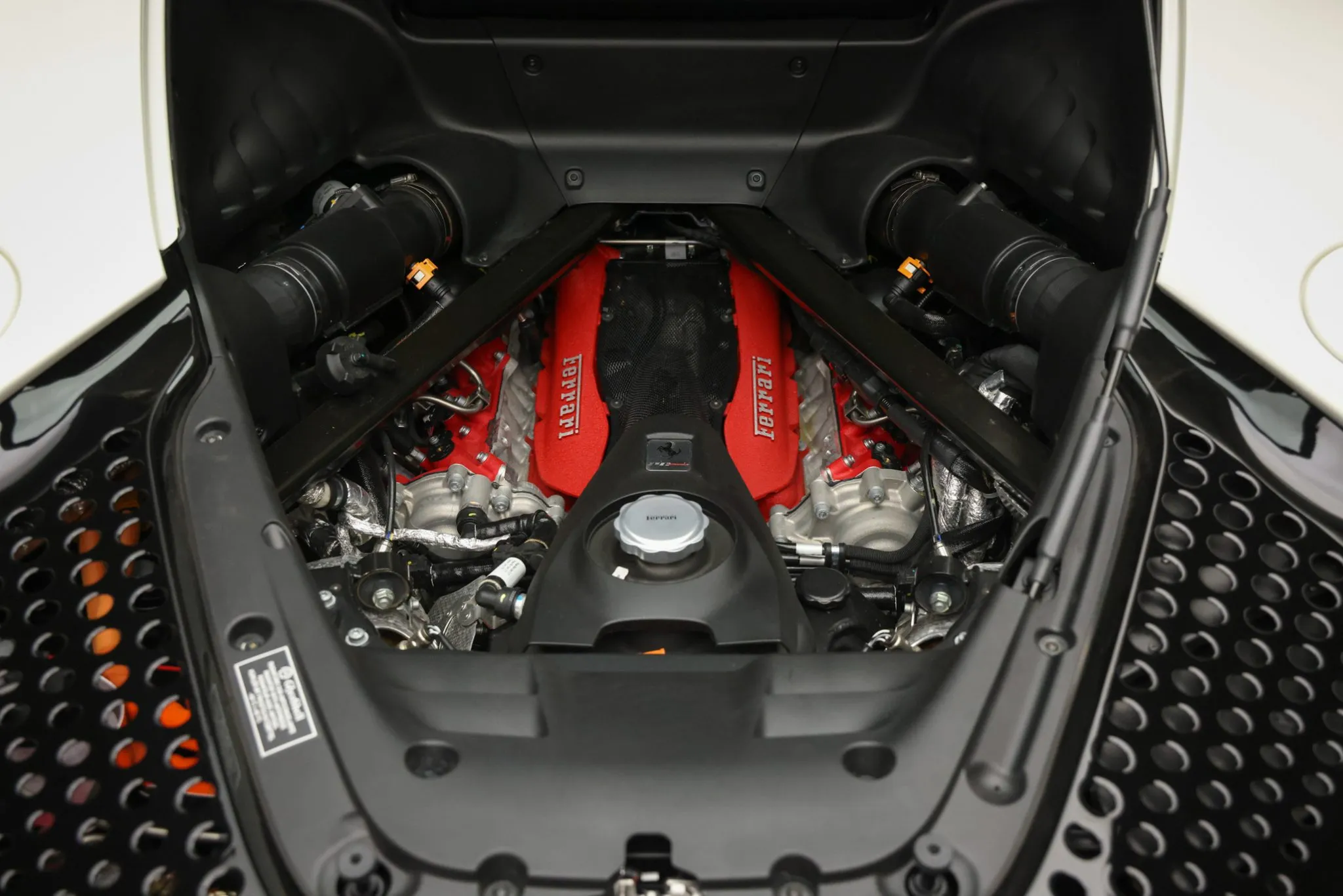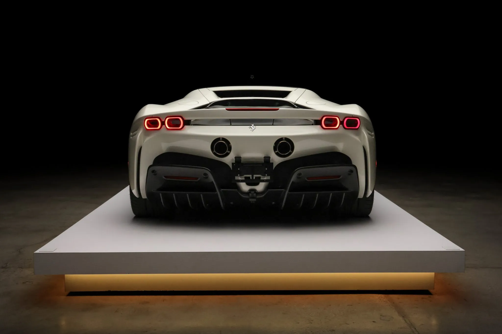 The SF90 was designed by director Flavio Manzoni’s team at the Ferrari Styling Center and was introduced to commemorate the 90th anniversary of the Scuderia Ferrari racing team. This example is finished in Extra Range four-layer Bianco Italia paintwork with a Nero DS roof and a carbon-fiber rear diffuser, front spoiler, and side air splitters. Additional details include adaptive headlights, front and rear cameras, Scuderia Ferrari fender shields, and front and rear parking sensors. A Formula 1–inspired drag-reduction system utilizes active aerodynamics, a two-piece rear wing, and underbody vortex generators. A paint chip is highlighted in the gallery.