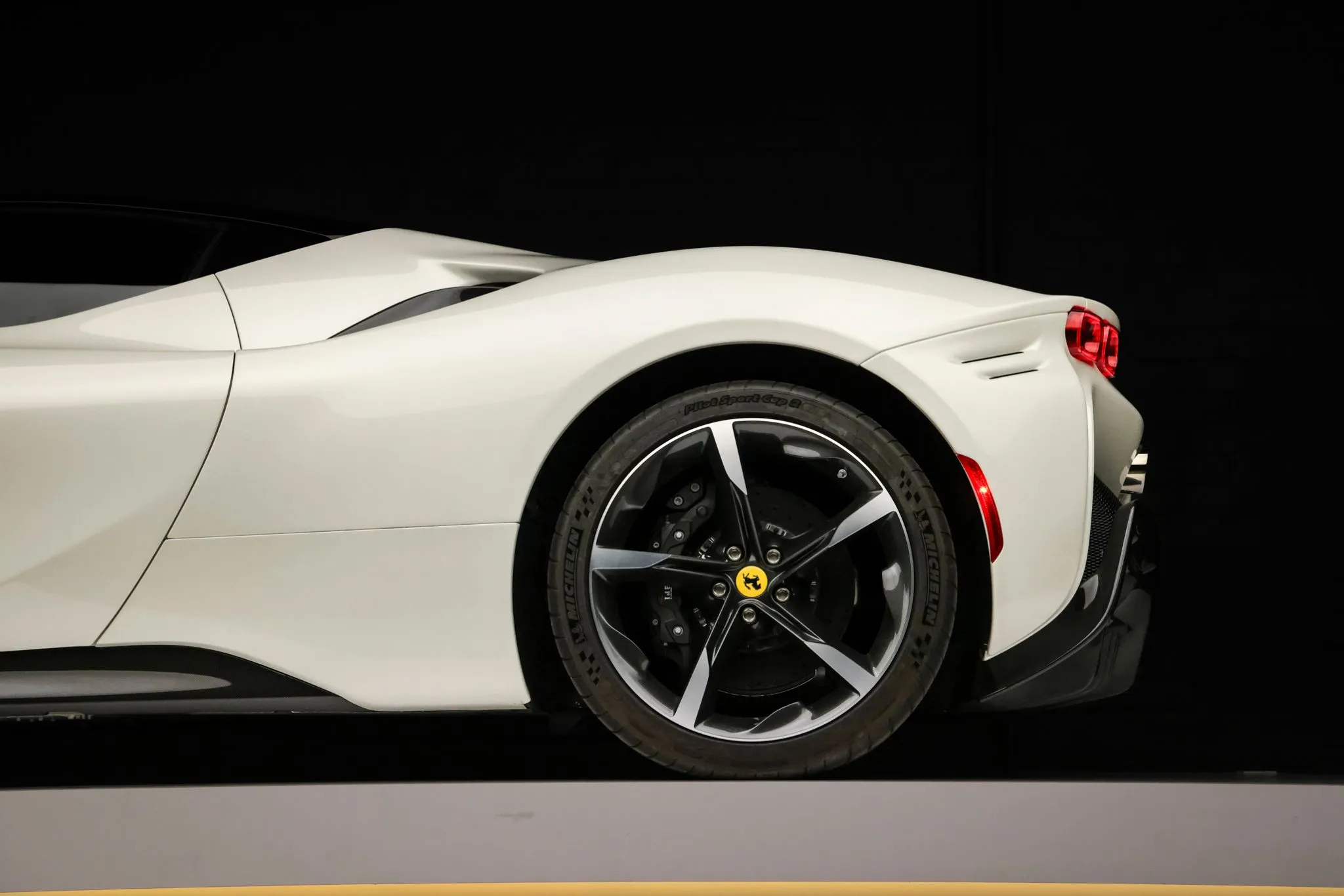 The 20″ forged diamond wheels feature titanium lug bolts and are mounted with Michelin tires. The SF90 features an aluminum chassis as well as a magnetorheological suspension. The electronic Side Slip Control (eSSC) system can distribute torque to all four wheels, while the electric traction control system (eTC) can deliver power to individual corners. The regenerative brake system is controlled via a brake-by-wire system that splits braking between the hydraulic system and the electric motors. Black-finished calipers over carbon-ceramic rotors are fitted at all four corners, and the car is equipped with a suspension lift system.