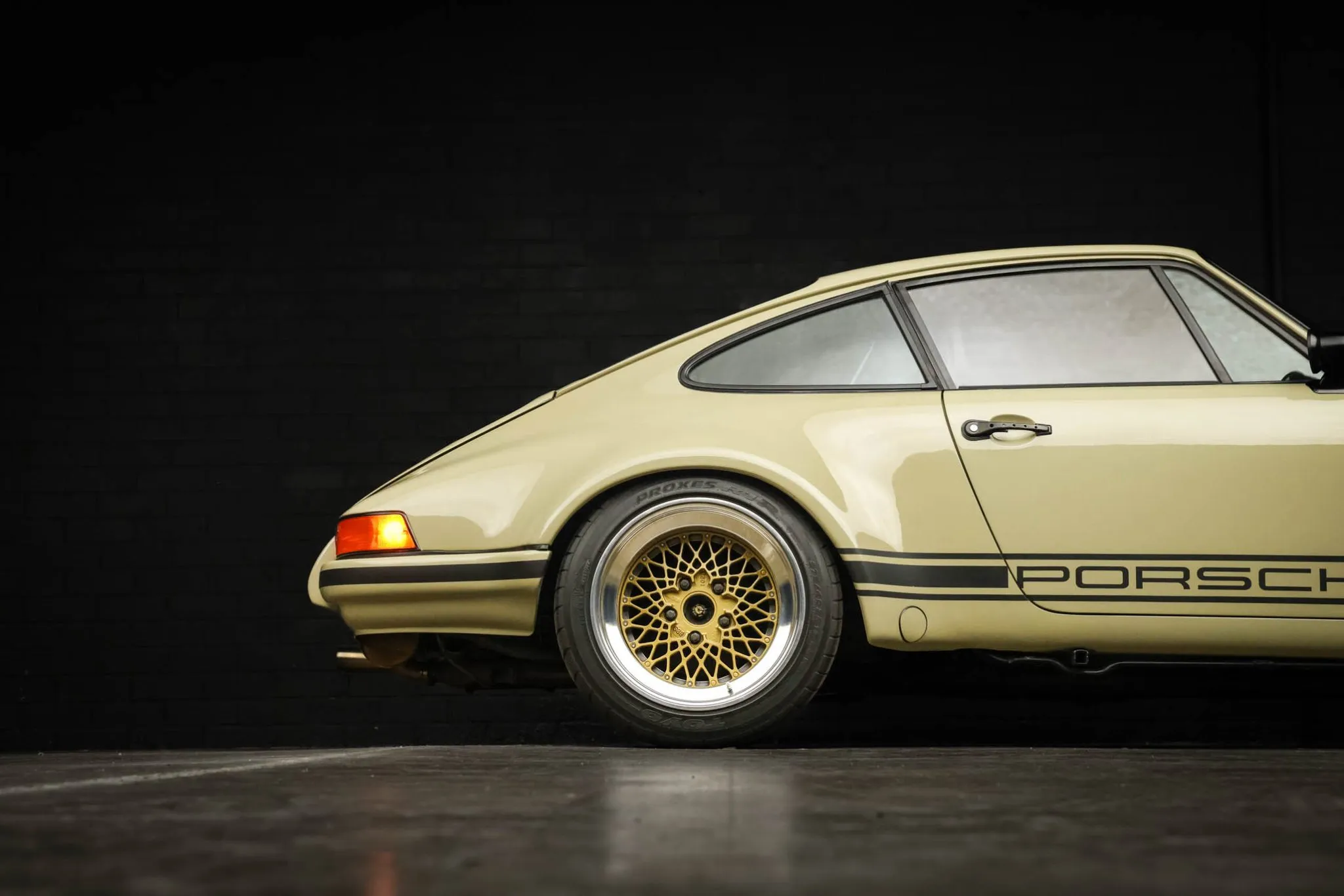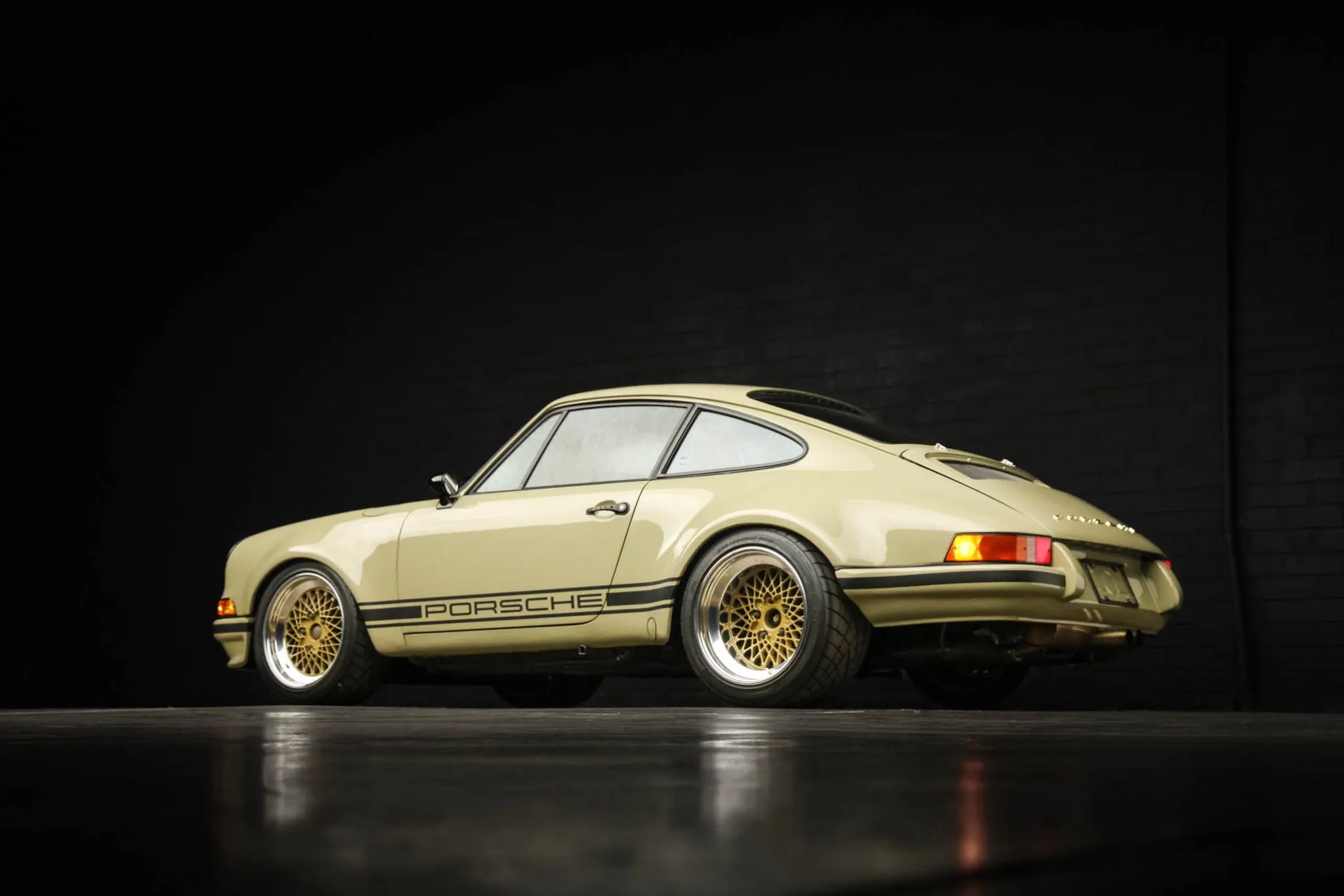 During the build, steel 930-style Dansk fender flares, backdated front turn signal boxes, a fiberglass long hood, an aftermarket fiberglass engine cover, and fiberglass bumpers were installed before the car was finished in Stone Grey (5710). Dual Achtung Kraft black bullet mirrors, projector-style headlights, black Porsche side graphics, drilled door handles, and gold Porsche rear lettering were then installed, and the car has a sunroof and a replacement windshield. Cracks are noted in the side markers and taillights, there is a paint chip on the rear bumper under the right turn signal, and the sunroof is difficult to open and close.
