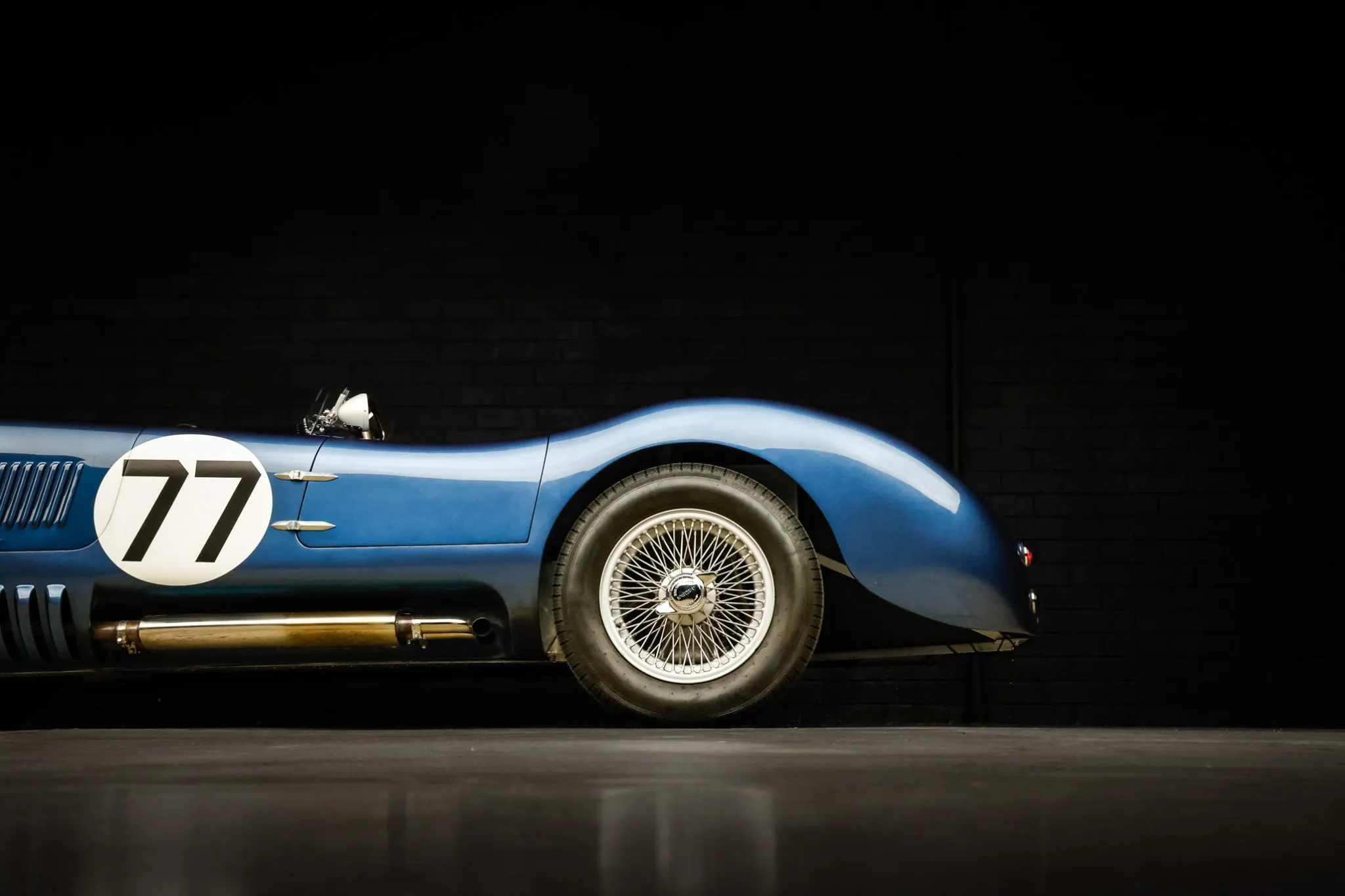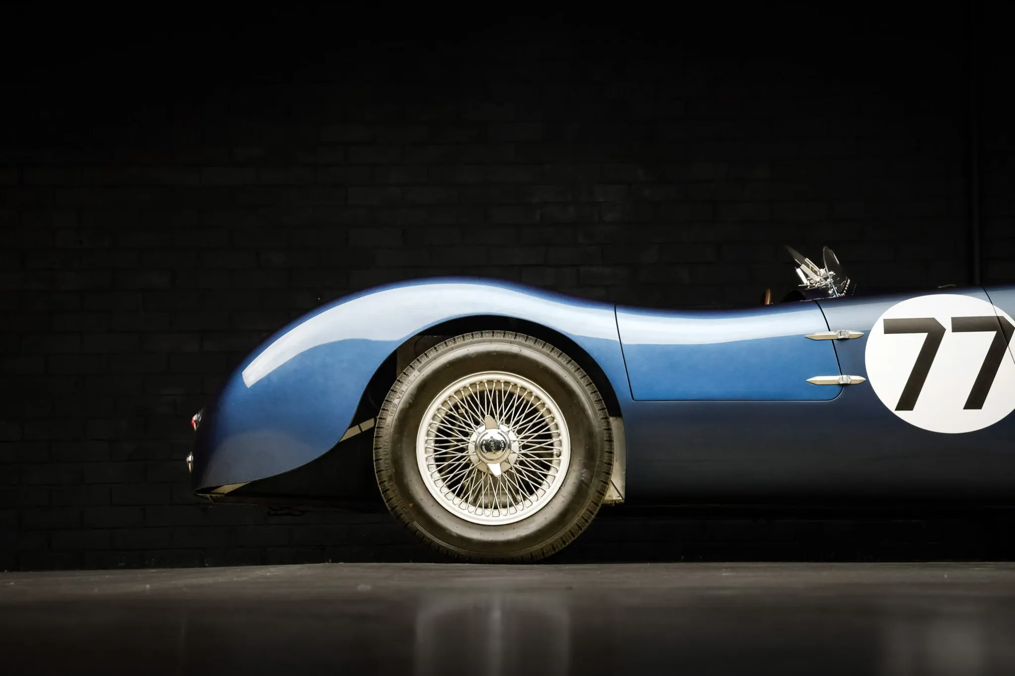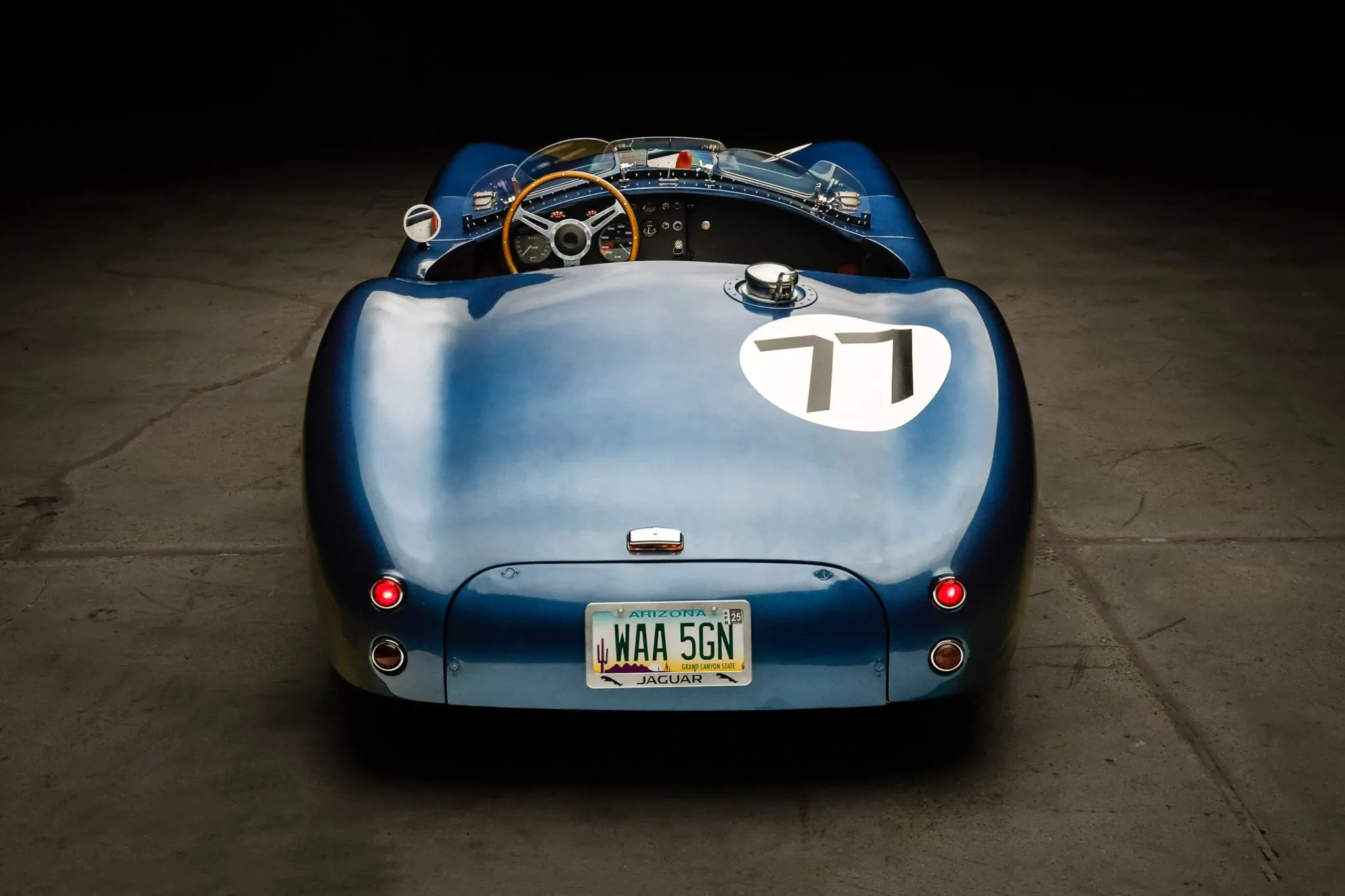 This re-creation features composite bodywork over a powder-coated tubular steel frame with steel front bulkheads and aluminum floor panels. The body wears a blue livery inspired by the Jaguars campaigned by Ecurie Ecosse during the 1950s and features number-77 roundels and Ecurie Ecosse fender shields. Additional features include faired-in headlights, a louvered hood with leather retention straps, Brooklands-style windscreens behind a fixed plexiglass windshield, a bullet-style drive-side mirror, side-exit exhaust, and a Monza-style fuel-filler cap.
