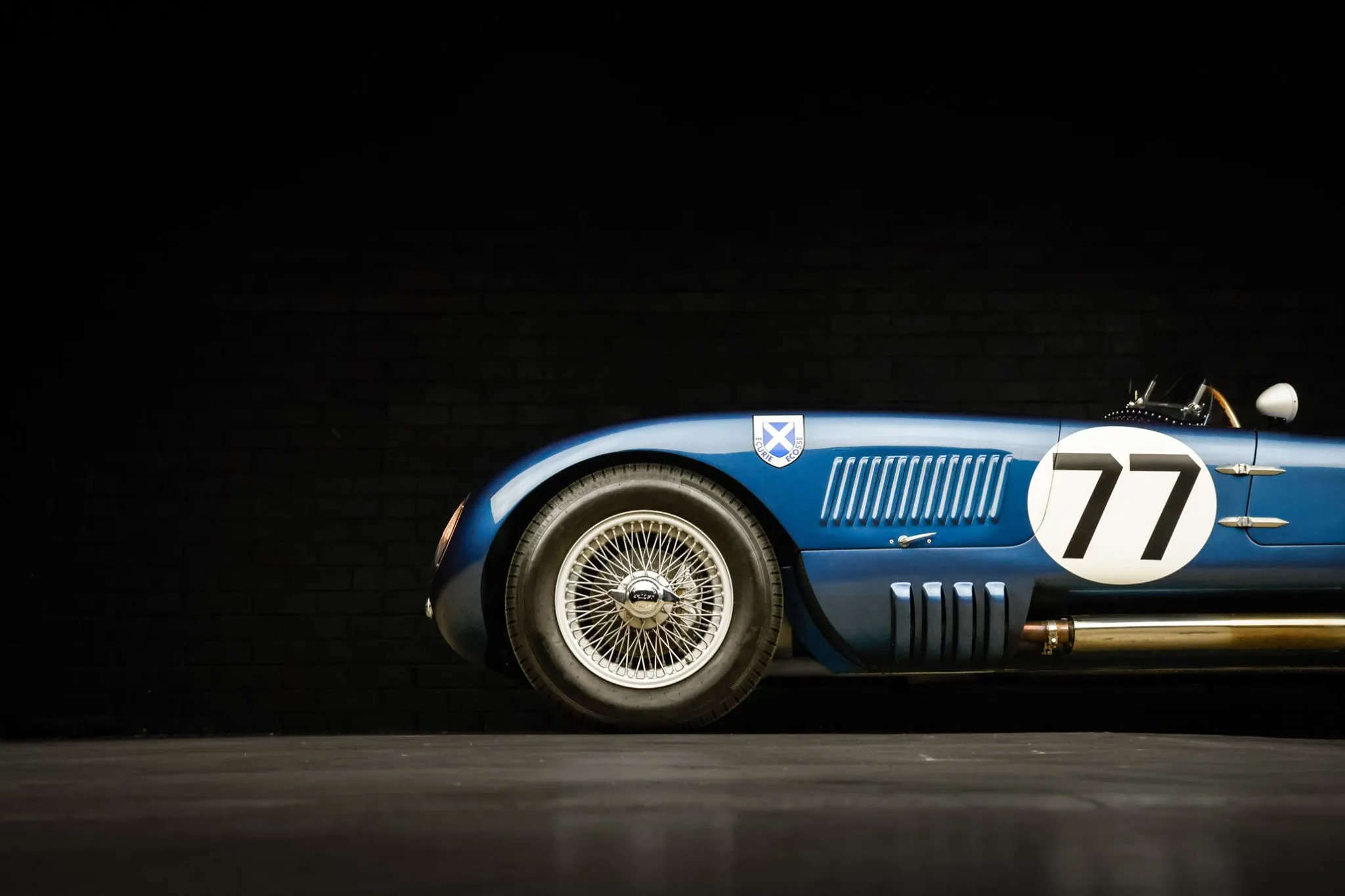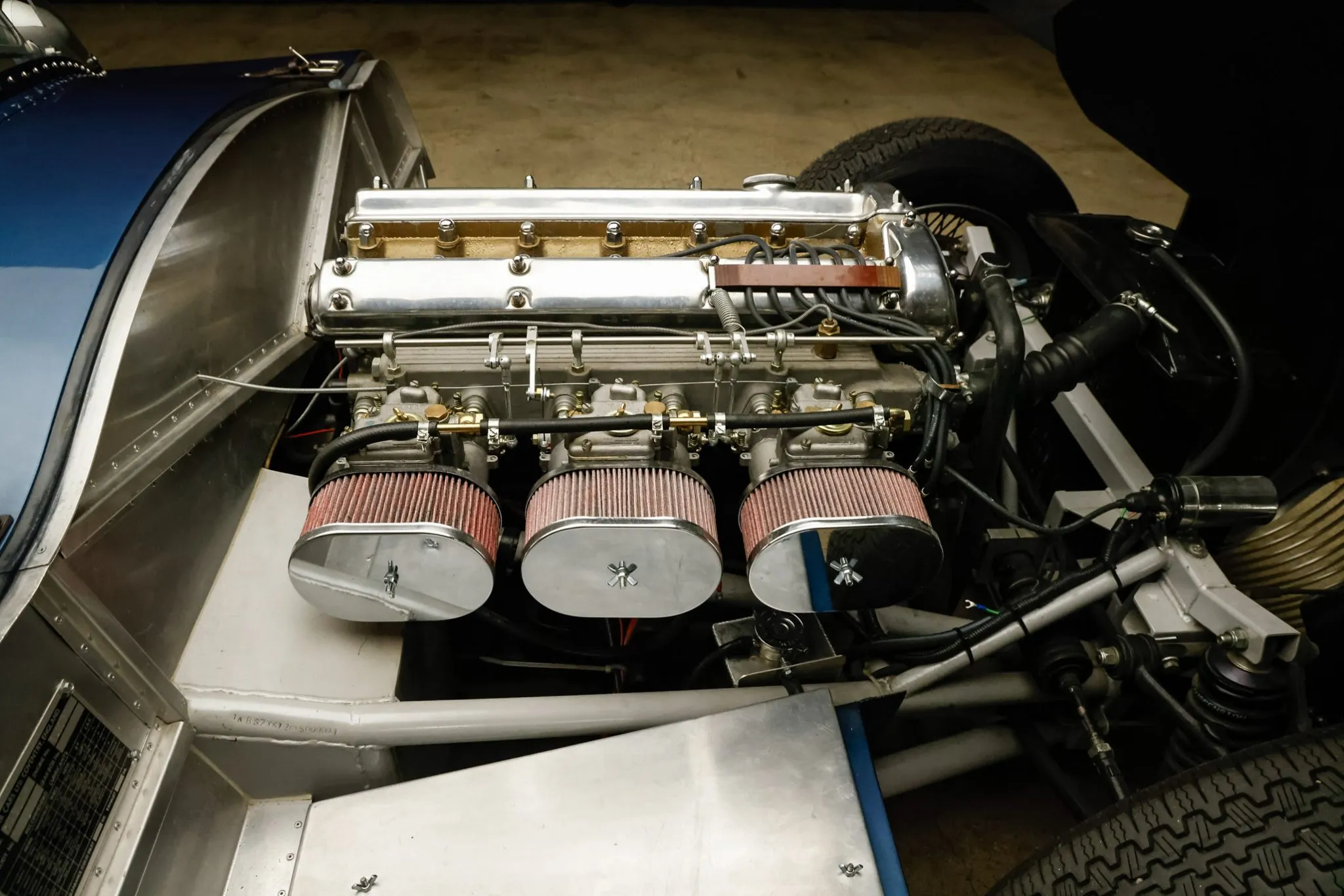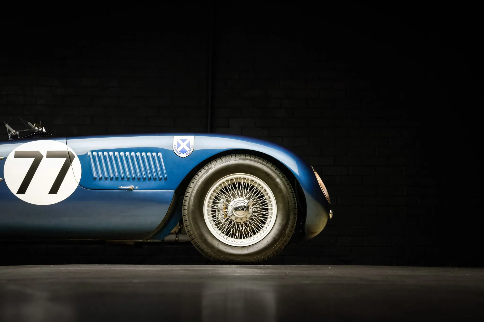 This re-creation features composite bodywork over a powder-coated tubular steel frame with steel front bulkheads and aluminum floor panels. The body wears a blue livery inspired by the Jaguars campaigned by Ecurie Ecosse during the 1950s and features number-77 roundels and Ecurie Ecosse fender shields. Additional features include faired-in headlights, a louvered hood with leather retention straps, Brooklands-style windscreens behind a fixed plexiglass windshield, a bullet-style drive-side mirror, side-exit exhaust, and a Monza-style fuel-filler cap.