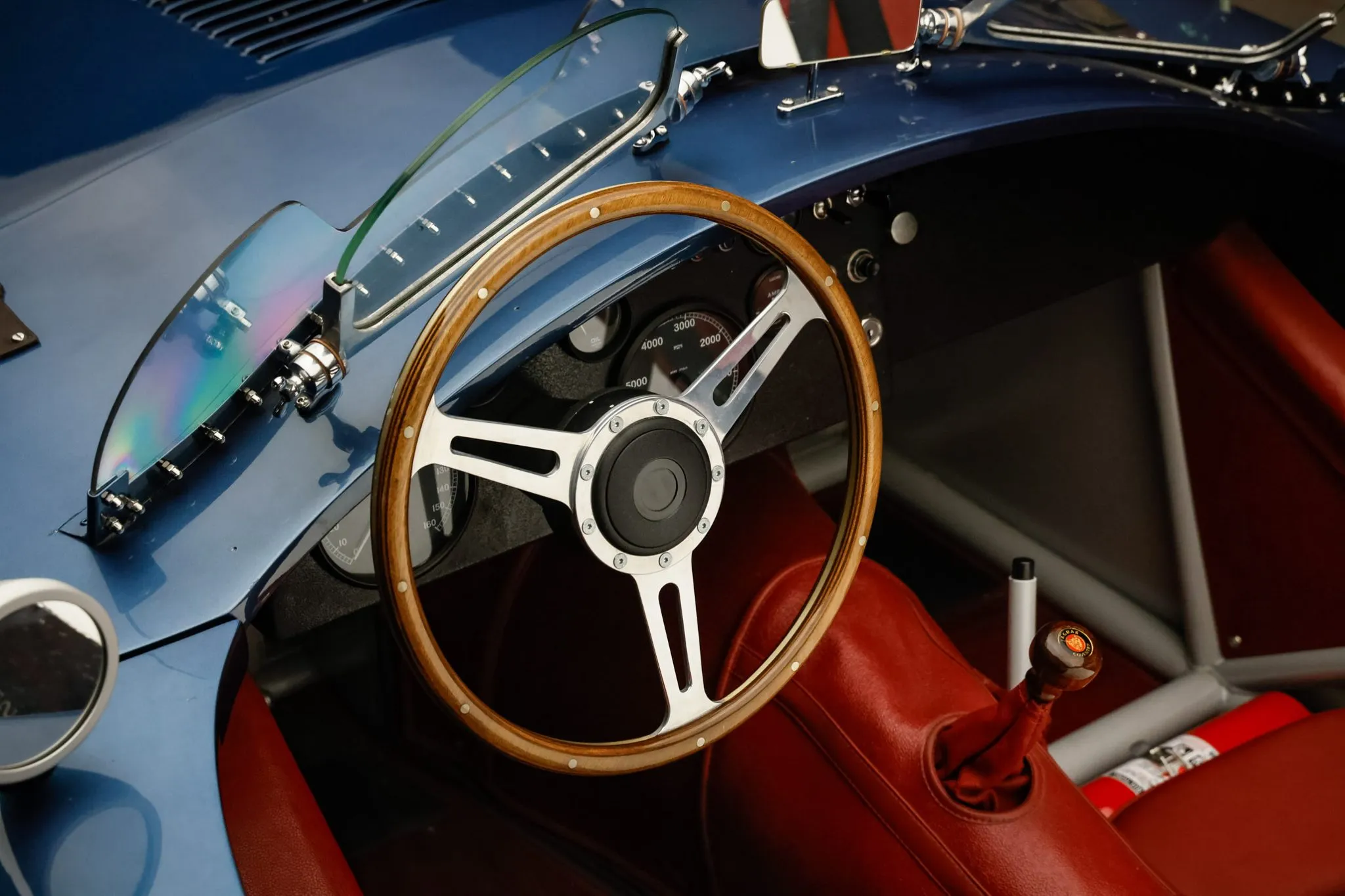 The left-hand-drive cockpit features fixed-back bucket seats trimmed in red leather with color-matched upholstery over the center tunnel and sills. A shorter shifter with a wood knob was installed in 2023, and insulation was added to the firewall. Additional features include color-matched carpeting, Willans four-point harnesses, a dashboard-mounted rearview mirror, and a fire extinguisher.