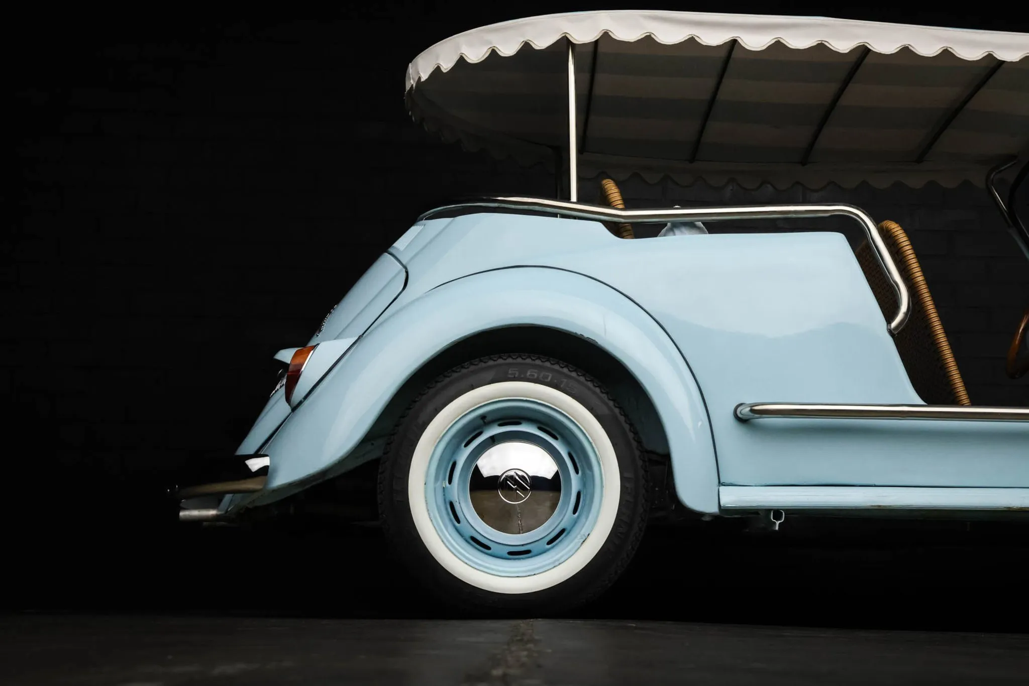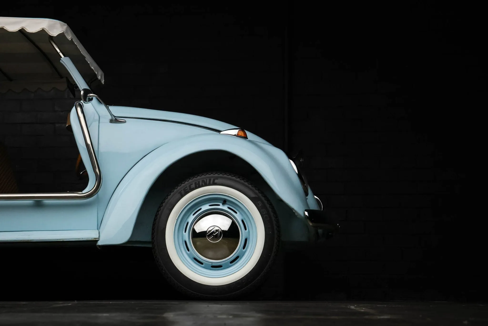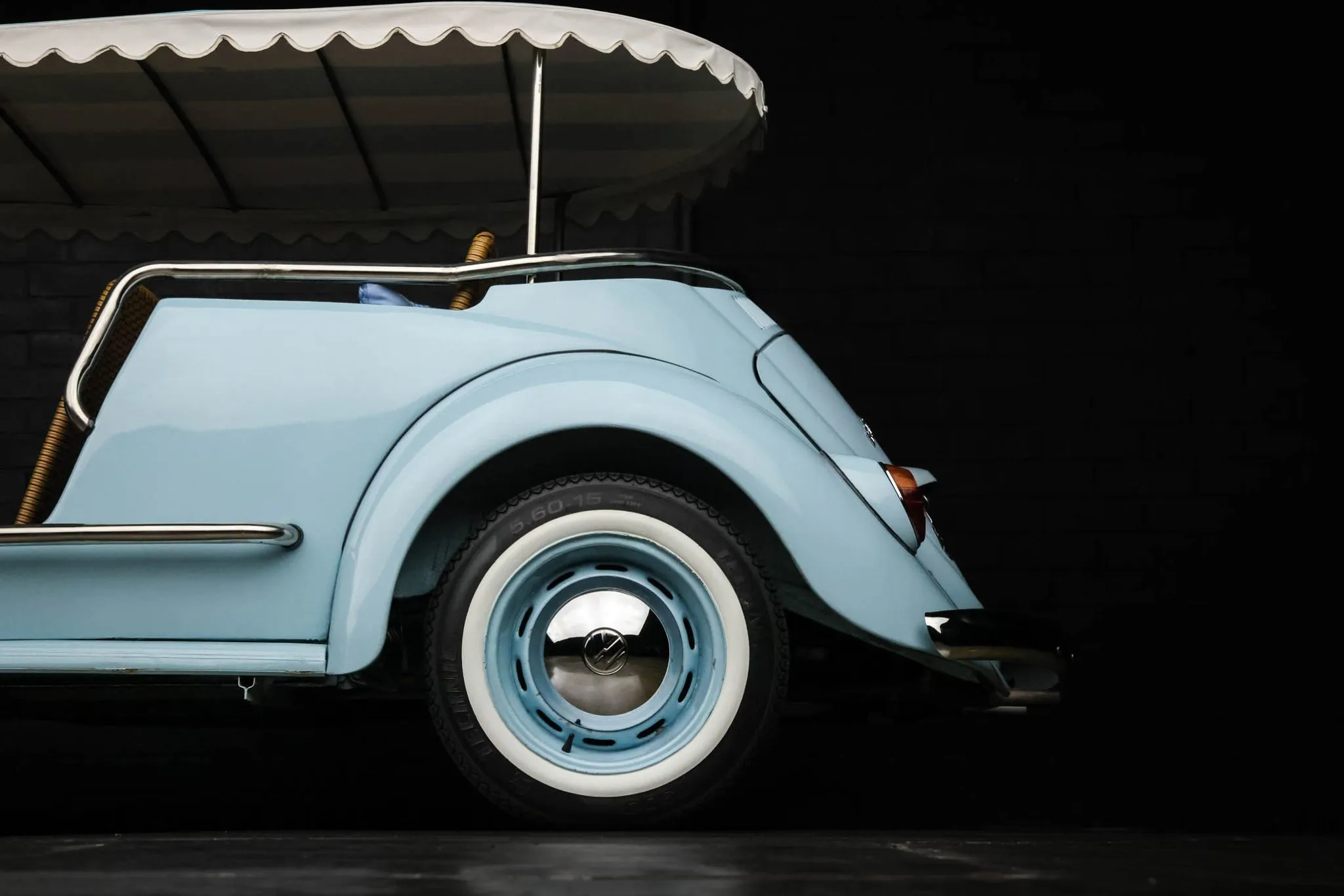 The body-color 15″ steel wheels wear chrome VW-stamped hubcaps and are mounted with 5.60-15 Technic bias-ply tires. Stopping power is provided by four-wheel drum brakes.