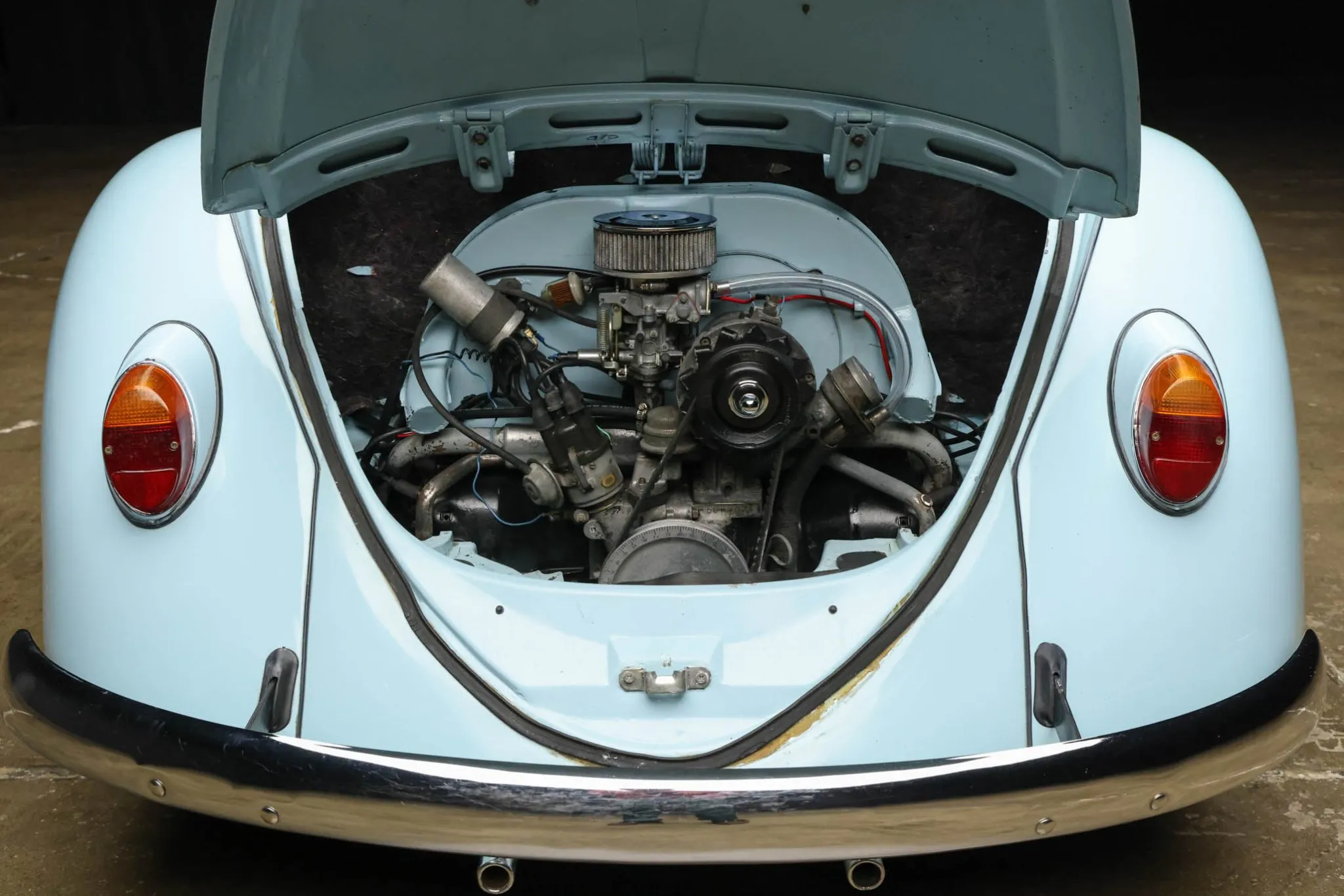 The air-cooled 1.2L (5) flat-four is fed by a single downdraft carburetor topped with an open-element air cleaner and features body-color engine tins. The fan shroud heat ducts are capped.