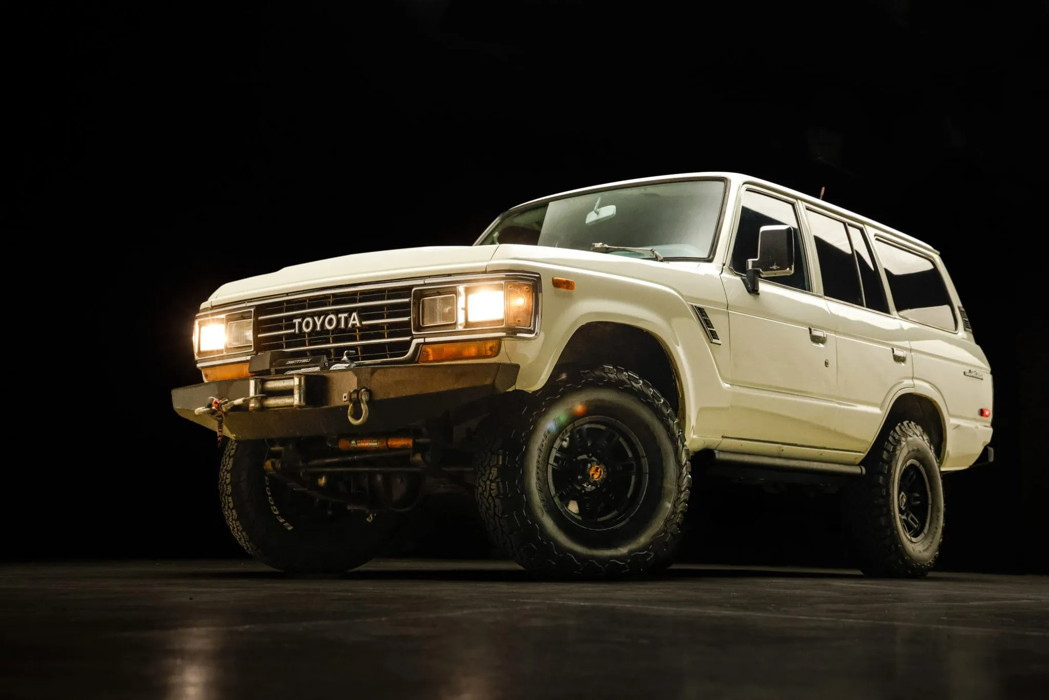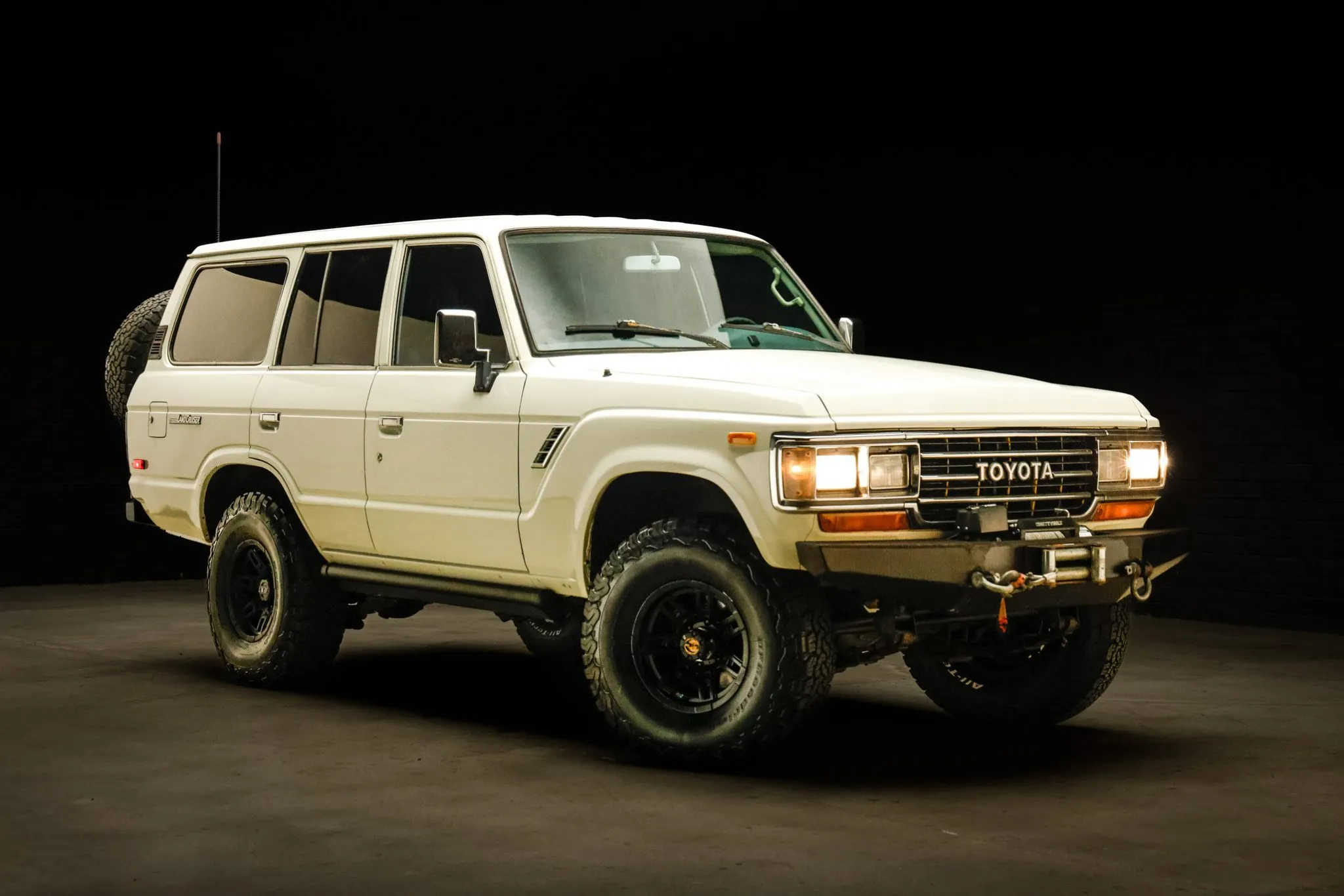 This 1989 Toyota Land Cruiser FJ62 is powered by a 6.2-liter E-Rod LS3 crate V8 linked with a GM six-speed automatic transmission, and it has long-term registration history in Utah and California through the current owner’s acquisition in 2019. The truck rides on an Old Man Emu lift kit, 15″ Mickey Thompson wheels, and BFGoodrich 33″ tires, and off-road equipment includes Aisin manually locking front hubs, a rear ladder and tire carrier, and a Smittybilt front winch. It is finished in white over replacement blue and white vinyl upholstery, and the cabin is outfitted with air conditioning, power windows and locks, and a touchscreen infotainment system. This FJ62 is now offered on dealer consignment by the seller –a BaT Local Partner– with a clean California title.