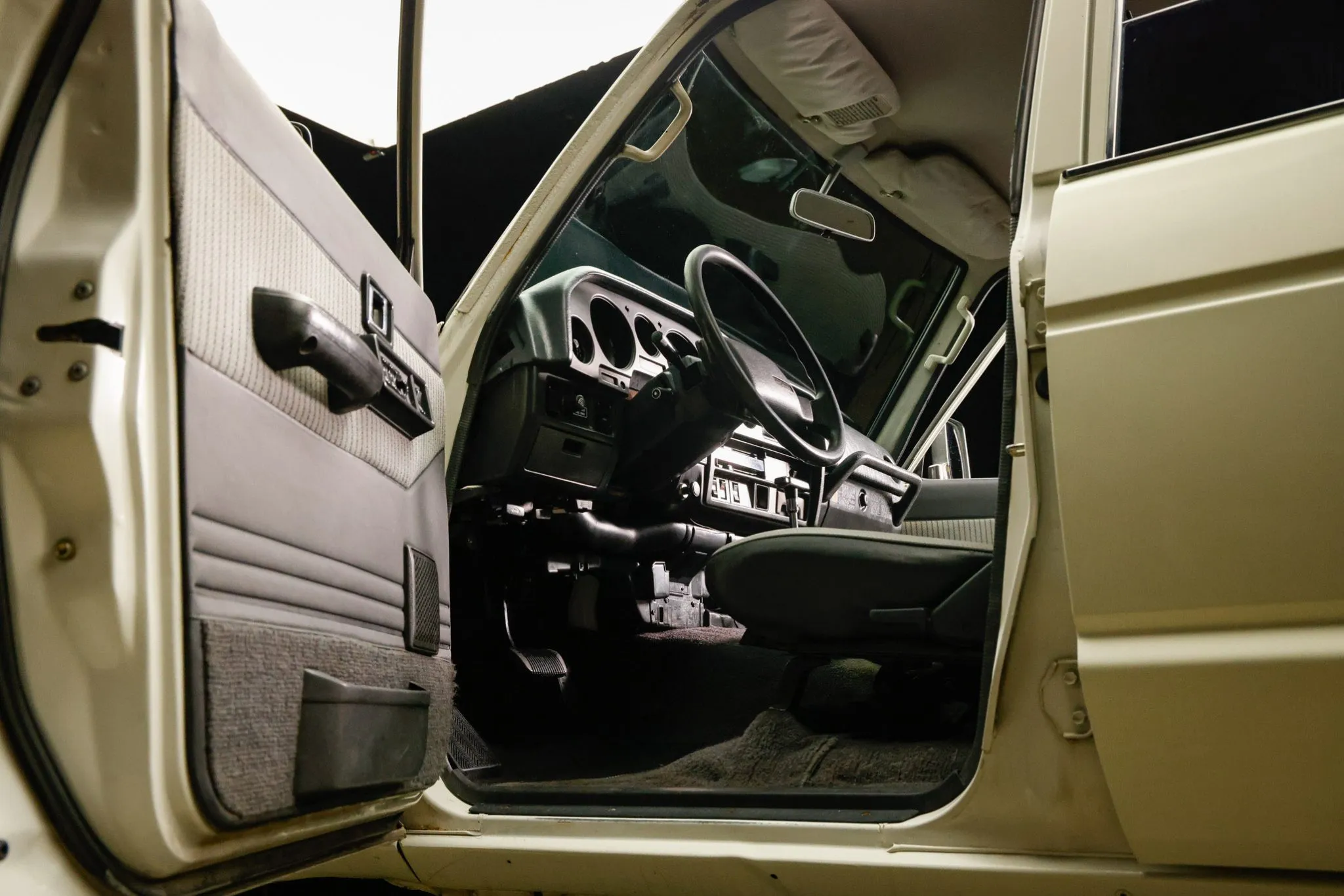 The front bucket seats and rear bench have been reupholstered in gray and white perforated vinyl, and a touchscreen infotainment system has been installed. Further appointments include air conditioning, power windows, a hand throttle, and a rear window defroster.