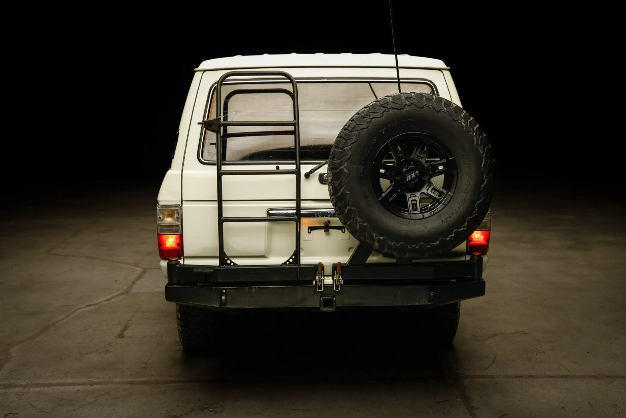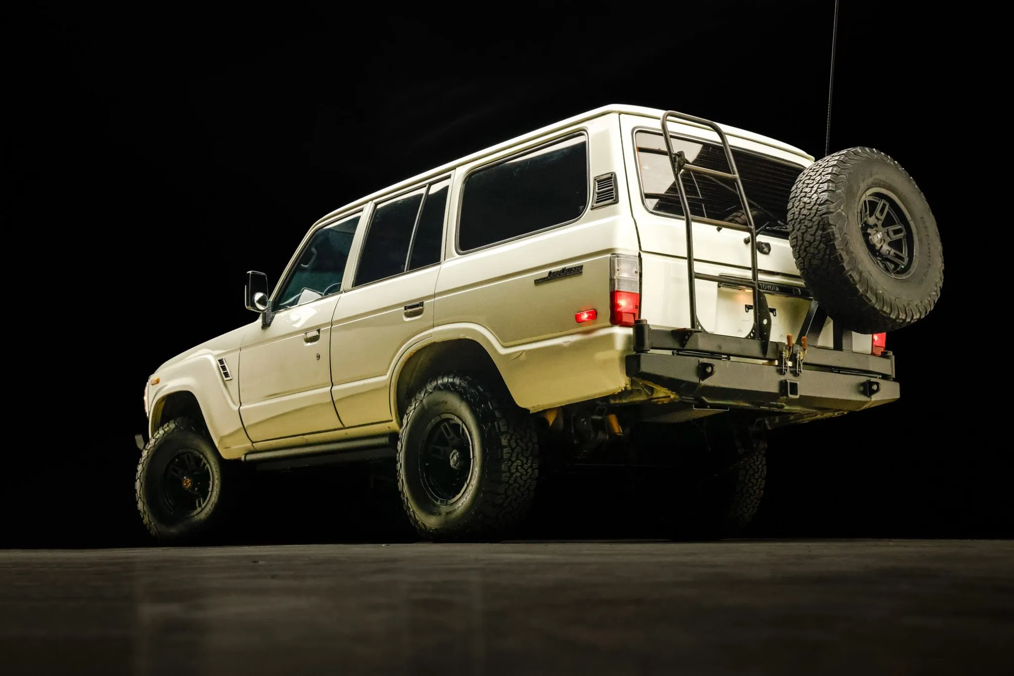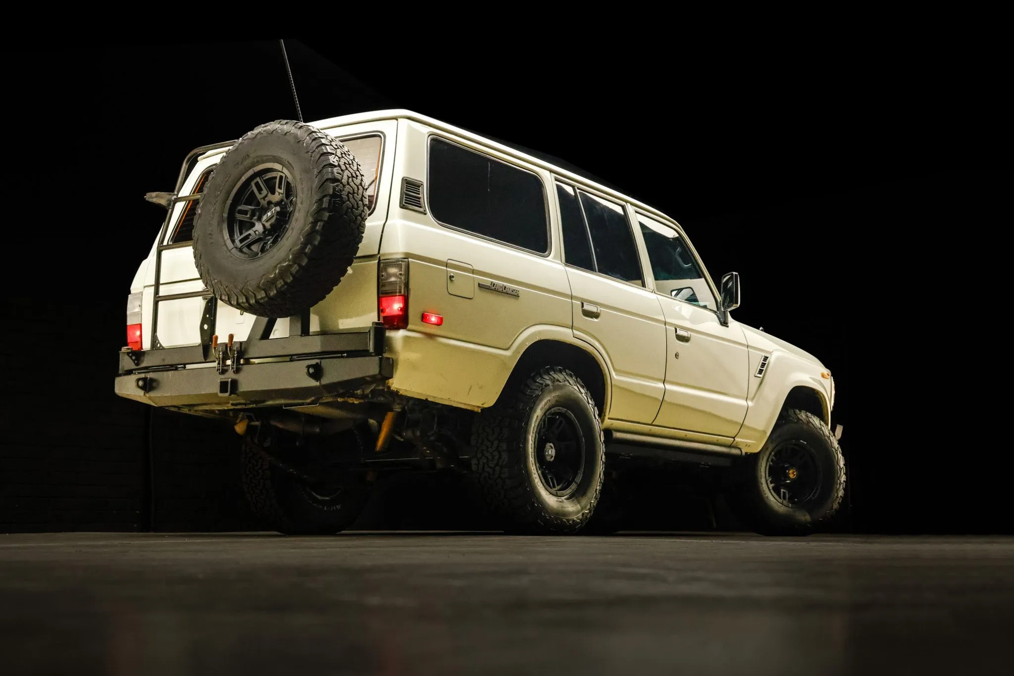 Old Man Emu provided the 2.5″ suspension lift, and Aisin manually locking hubs are found up front. Black-finished Mickey Thompson 15″ wheels are mounted with 33×10.5″ BFGoodrich All-Terrain T/A KO2 tires, and a matching spare is found out back.