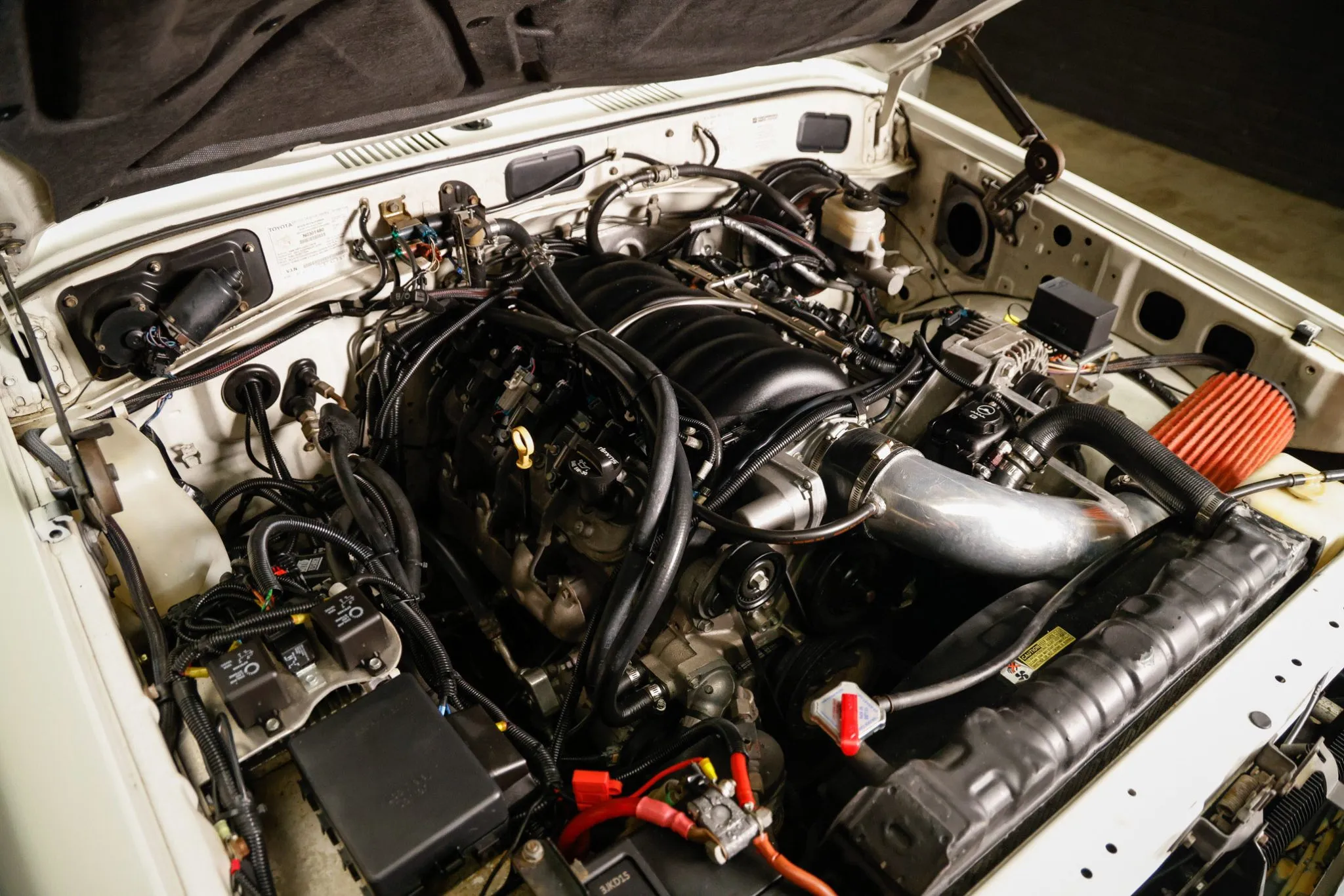 The General Motors 6.2-liter E-Rod crate V8 breathes through a polished intake pipe and a conical filter. Photos of emissions and CARB-related stickers are included in the gallery below.