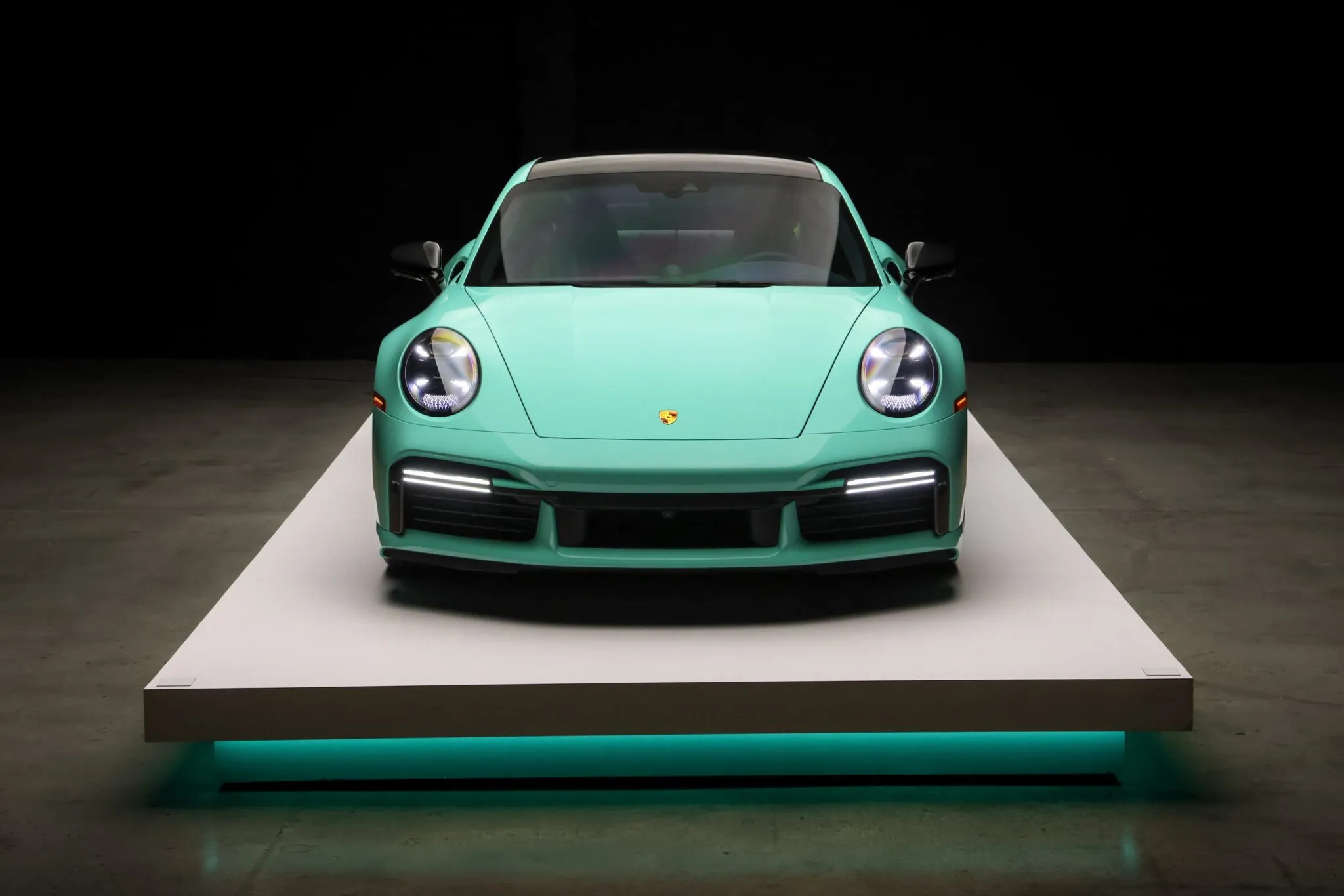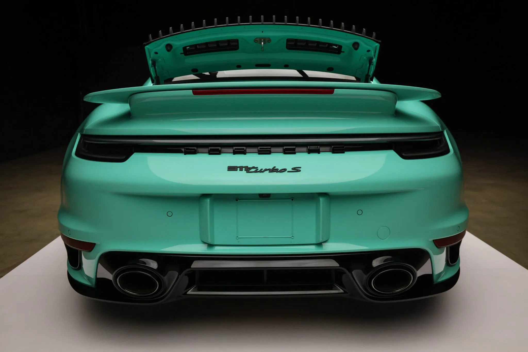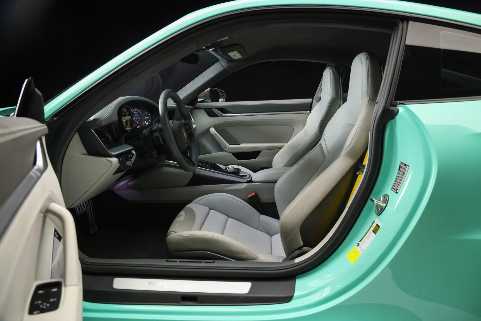 The car is finished in paint-to-sample Mint Green and features a carbon-fiber roof and mirror caps, High Gloss Black trim, an Exclusive Design fuel cap, fog lights, a surround-view camera system, a speed-activated rear spoiler, Exclusive Design taillights, front and rear parking sensors, and LED-Matrix Design headlights with Porsche Dynamic Light System Plus (PDLS+).