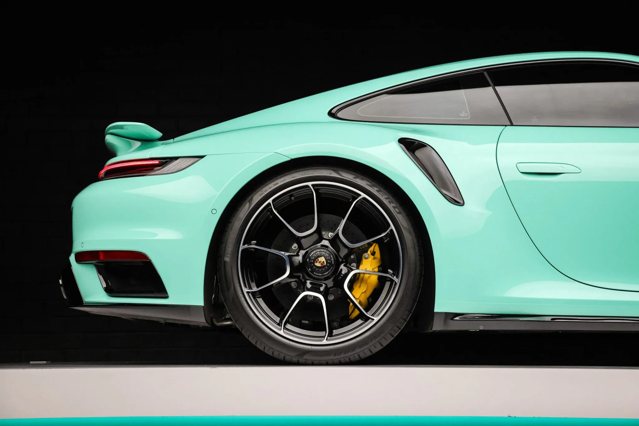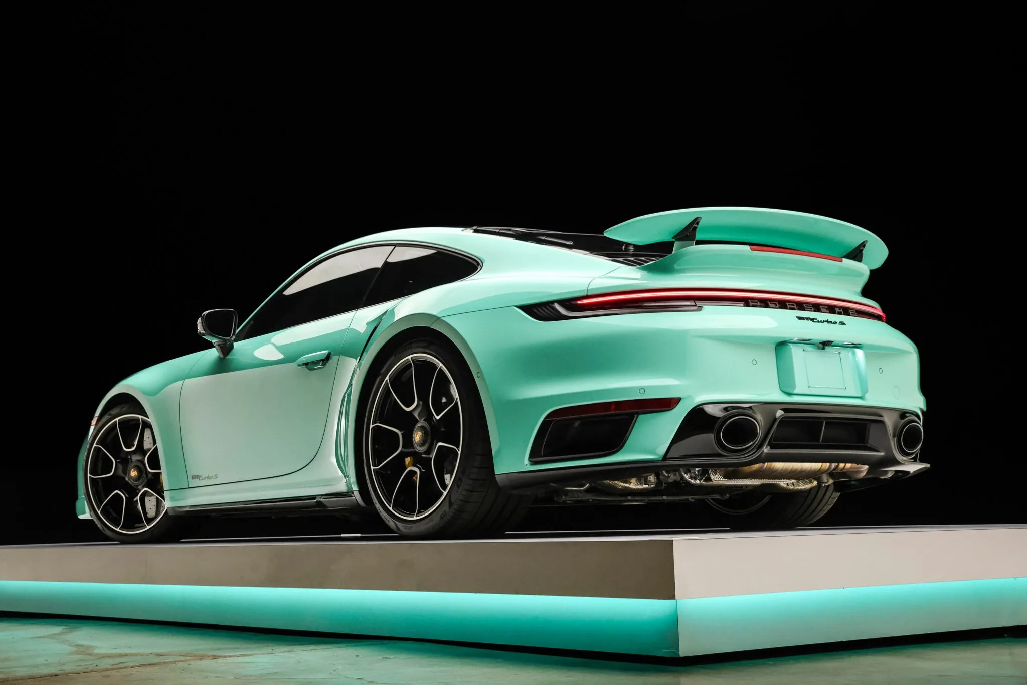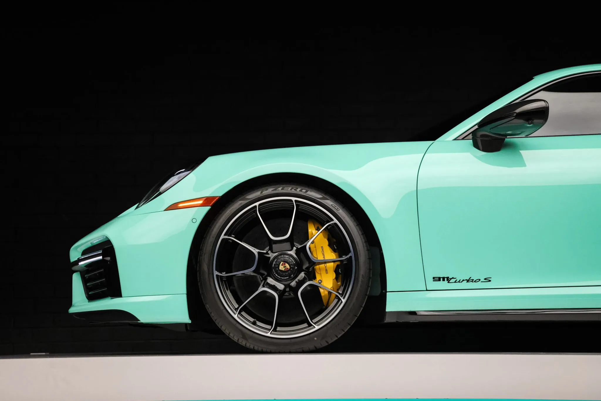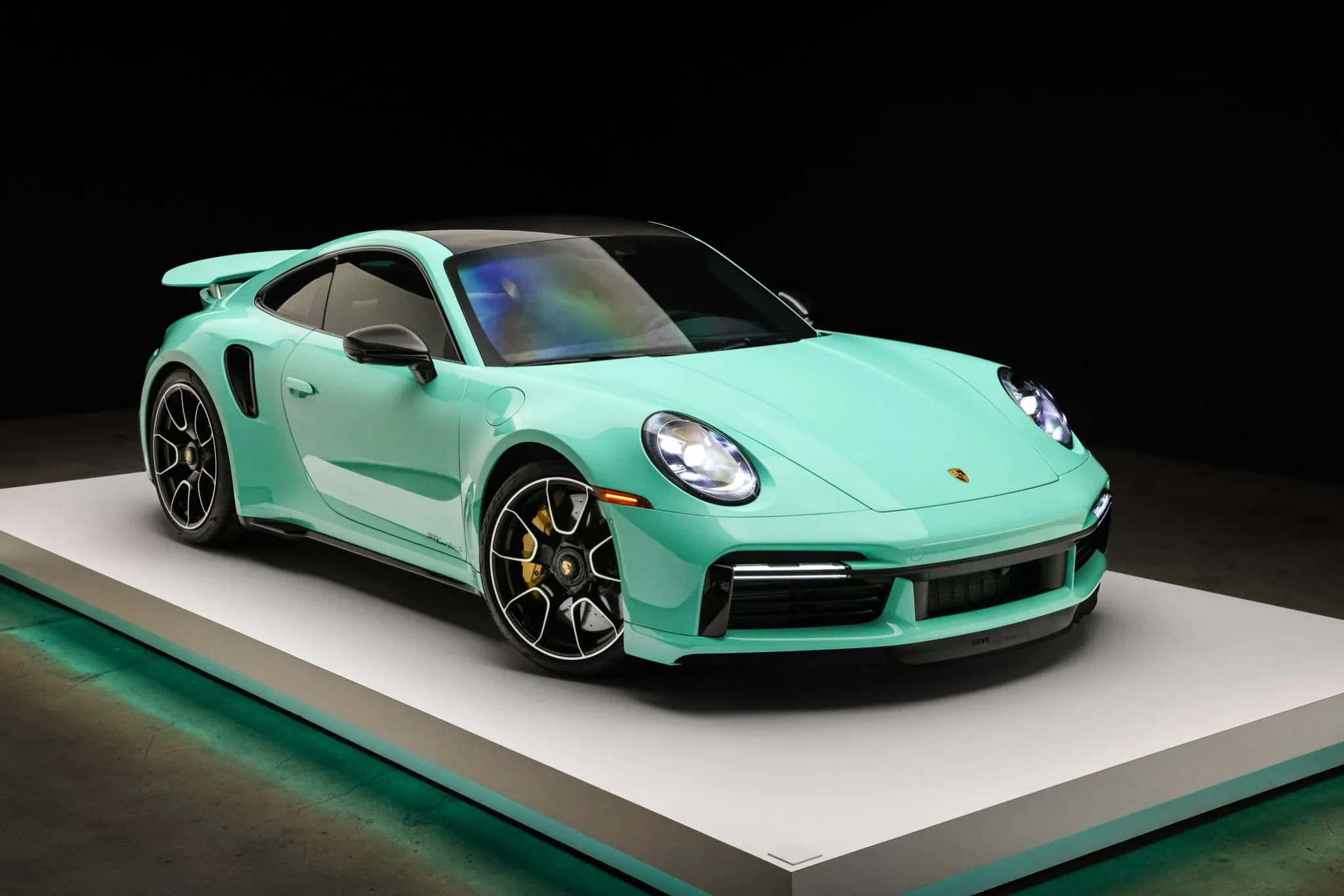 This 2022 Porsche 911 Turbo S coupe has 1,700 miles and was specified with nearly $50k in options, including a paint-to-sample Mint Green finish, a sport exhaust system, a carbon-fiber roof, and Racing Yellow seatbelts. The car is powered by a twin-turbocharged 3.7L flat-six linked with an eight-speed PDK dual-clutch automatic transaxle and all-wheel drive. Additional equipment includes Chalk and Slate Gray leather upholstery, Porsche Ceramic Composite Brakes, center-locking 20″ and 21″ Turbo S Exclusive Design wheels, Porsche Active Suspension Management, a front-axle lift system, Power Steering Plus, Exclusive Design taillights, LED headlights, heated adaptive front sport seats, a heated GT Sport steering wheel, a Burmester sound system, and a surround-view camera system. This 992.1 Turbo S is now offered in California by Wob Cars, a BaT Local Partner, as part of the PTS Porsche Collection with two keys, a clean Carfax report, and a clean Illinois title.