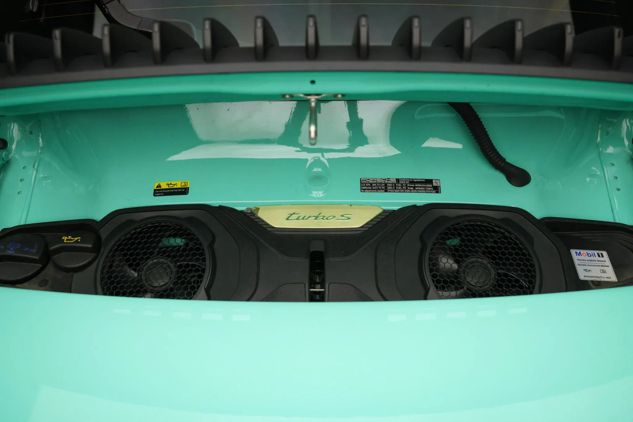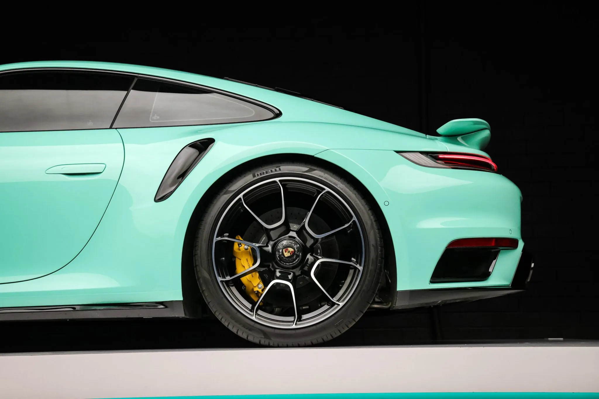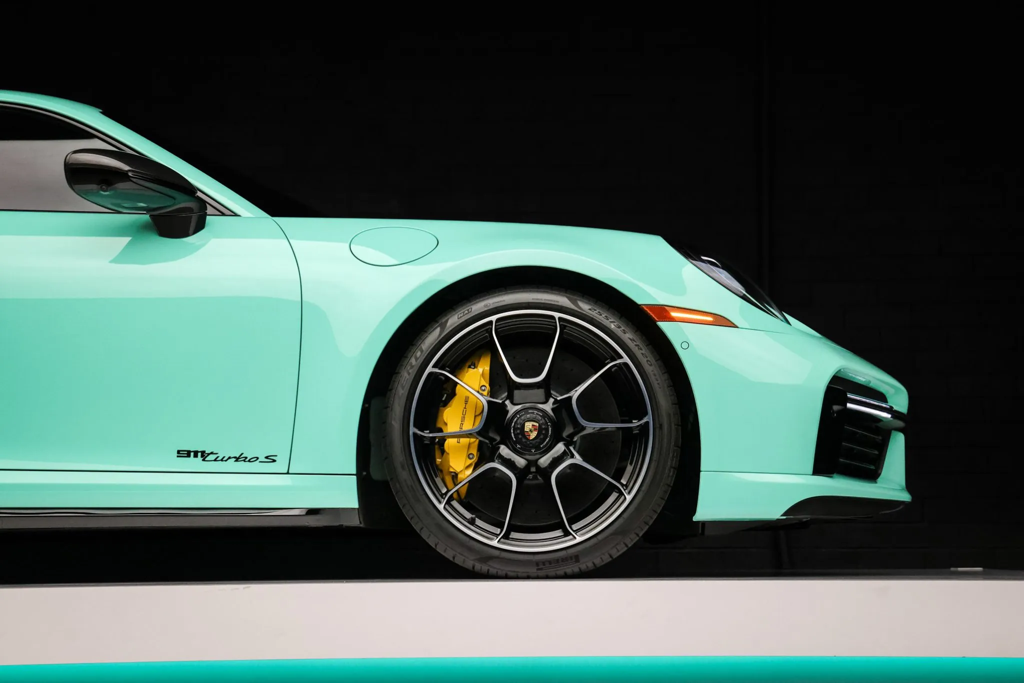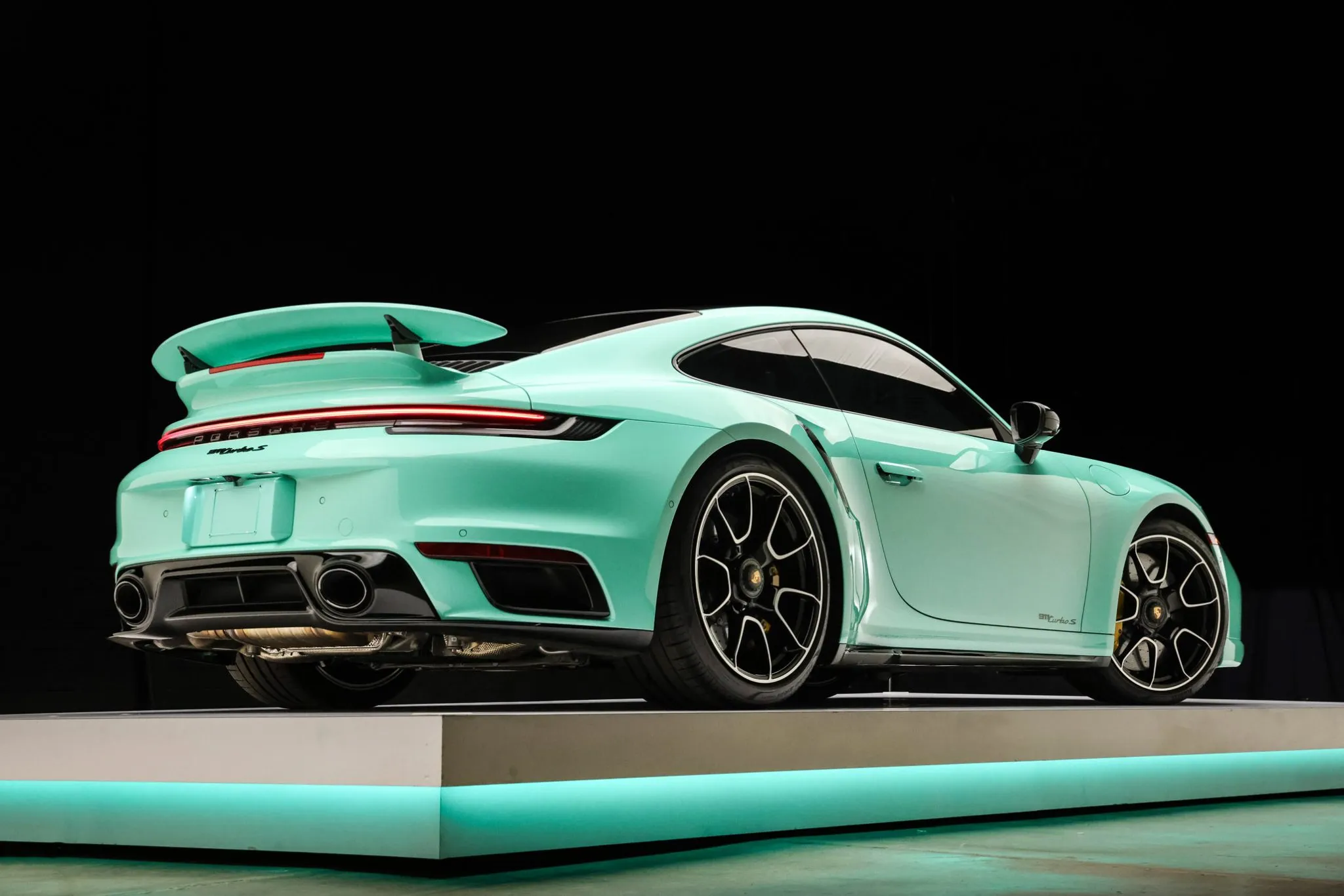 This 2022 Porsche 911 Turbo S coupe has 1,700 miles and was specified with nearly $50k in options, including a paint-to-sample Mint Green finish, a sport exhaust system, a carbon-fiber roof, and Racing Yellow seatbelts. The car is powered by a twin-turbocharged 3.7L flat-six linked with an eight-speed PDK dual-clutch automatic transaxle and all-wheel drive. Additional equipment includes Chalk and Slate Gray leather upholstery, Porsche Ceramic Composite Brakes, center-locking 20″ and 21″ Turbo S Exclusive Design wheels, Porsche Active Suspension Management, a front-axle lift system, Power Steering Plus, Exclusive Design taillights, LED headlights, heated adaptive front sport seats, a heated GT Sport steering wheel, a Burmester sound system, and a surround-view camera system. This 992.1 Turbo S is now offered in California by Wob Cars, a BaT Local Partner, as part of the PTS Porsche Collection with two keys, a clean Carfax report, and a clean Illinois title.