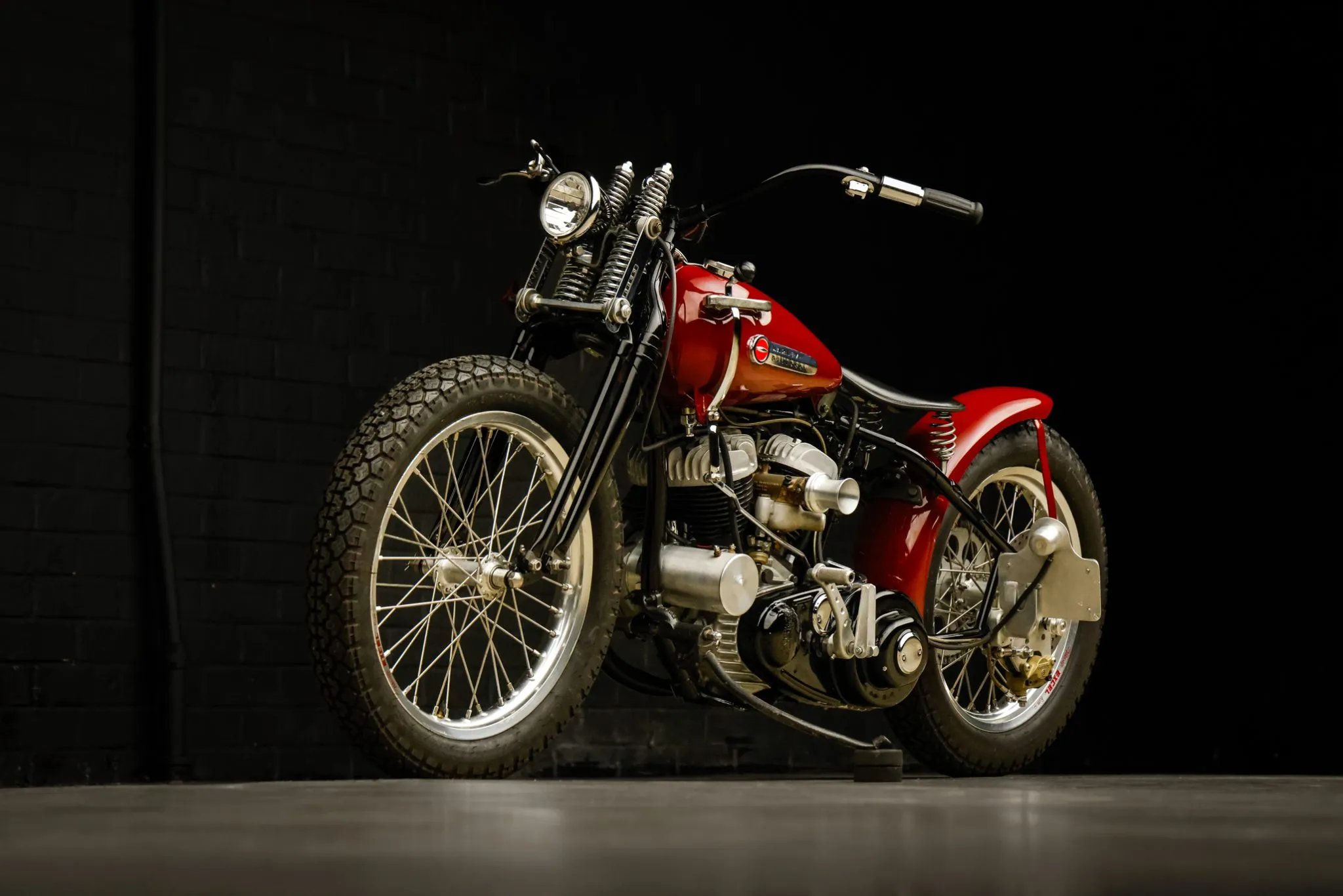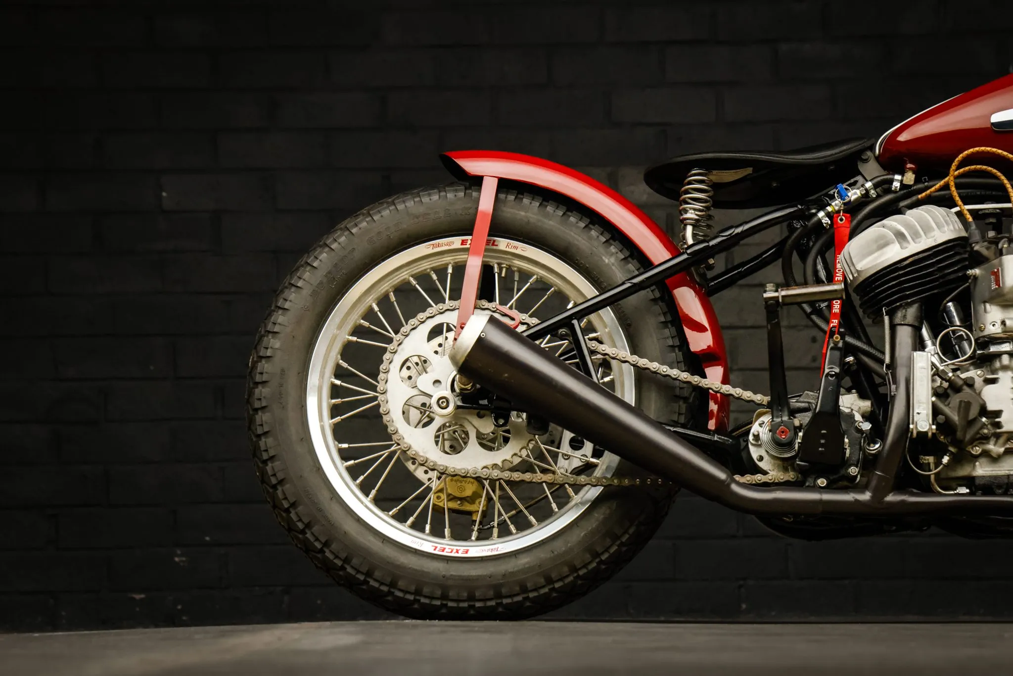The 45ci flathead V-twin features aluminum cylinder heads, a kick starter, a Wico magneto ignition system, and a Linkert carburetor that has been fitted with a “bomb-sight” venturi and a high-capacity float bowl. The cylinder heads were milled and ported, and the engine has been further modified with domed pistons, piston skirt oilers, KR-profile cam lobes, Chevrolet-sourced intake valves, replacement valve springs, a modified clutch basket, and a two-into-one exhaust with a megaphone-style silencer.