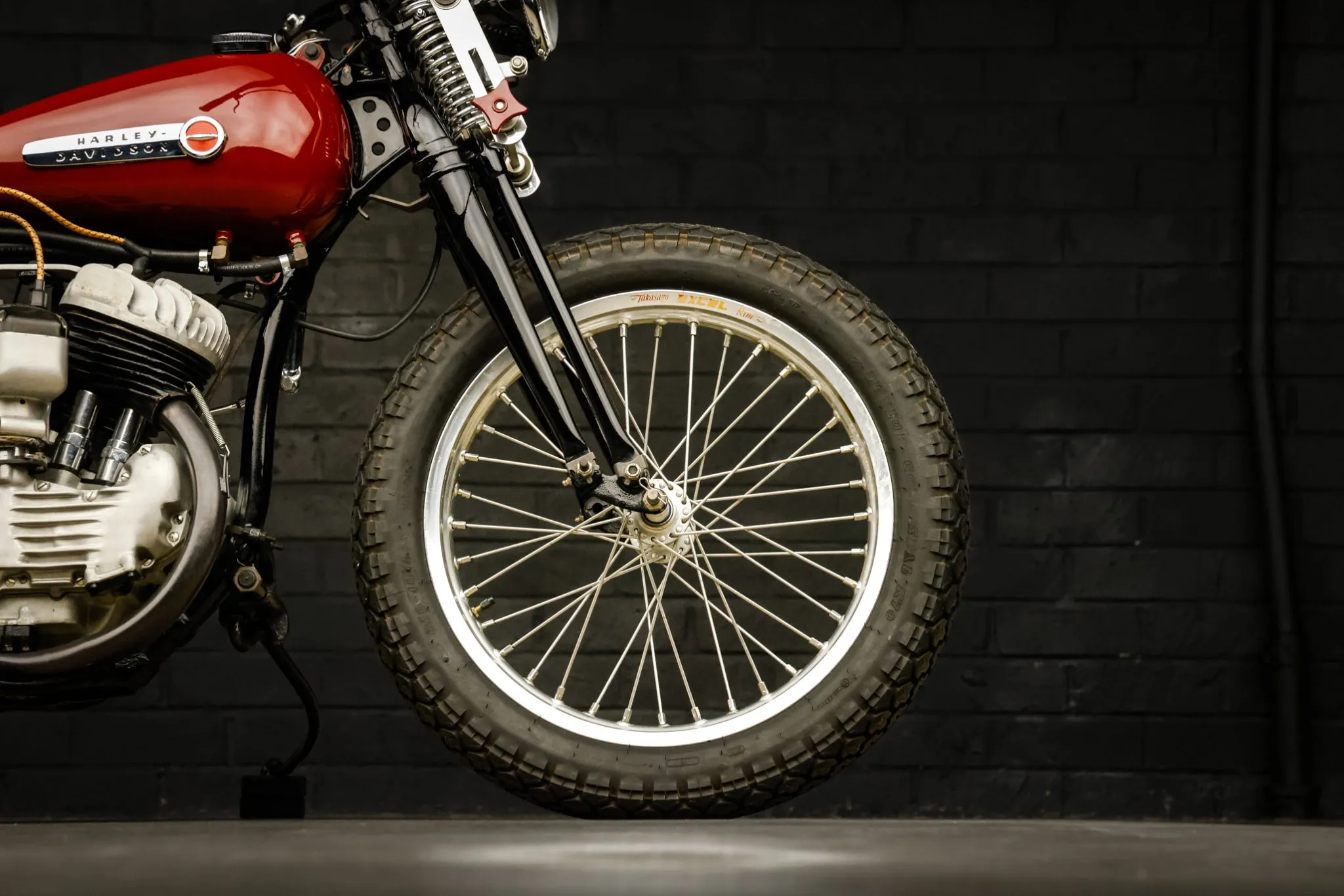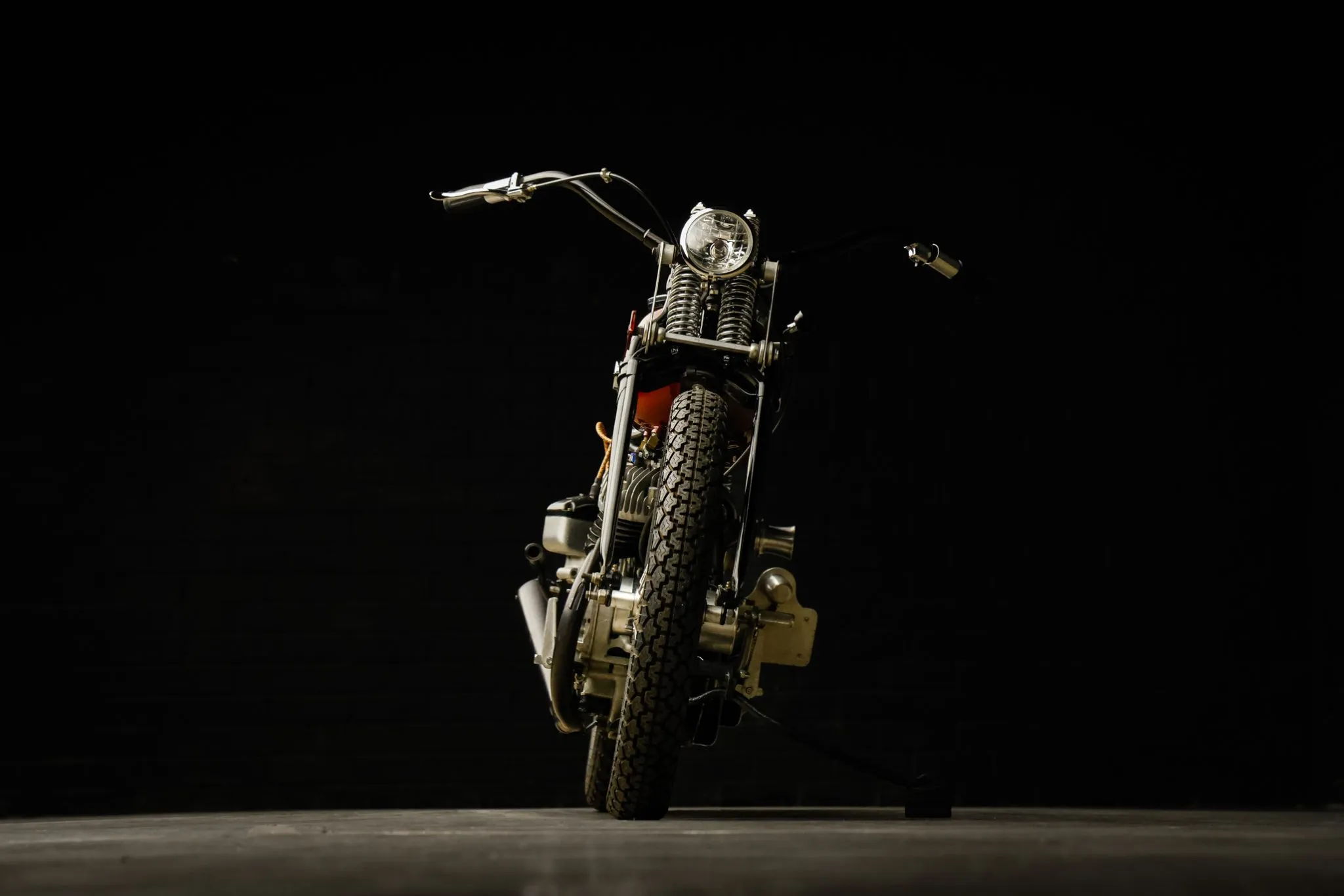 Excel alloy rims measuring 19″ up front and 18″ at the rear are laced to spool hubs with Buchanan’s stainless-steel spokes and are mounted with Dunlop Gold Seal K70 tires. A springer fork comprises the bike’s only suspension, and stopping power is provided by a rear drilled rotor clamped by a hydraulic Brembo caliper.