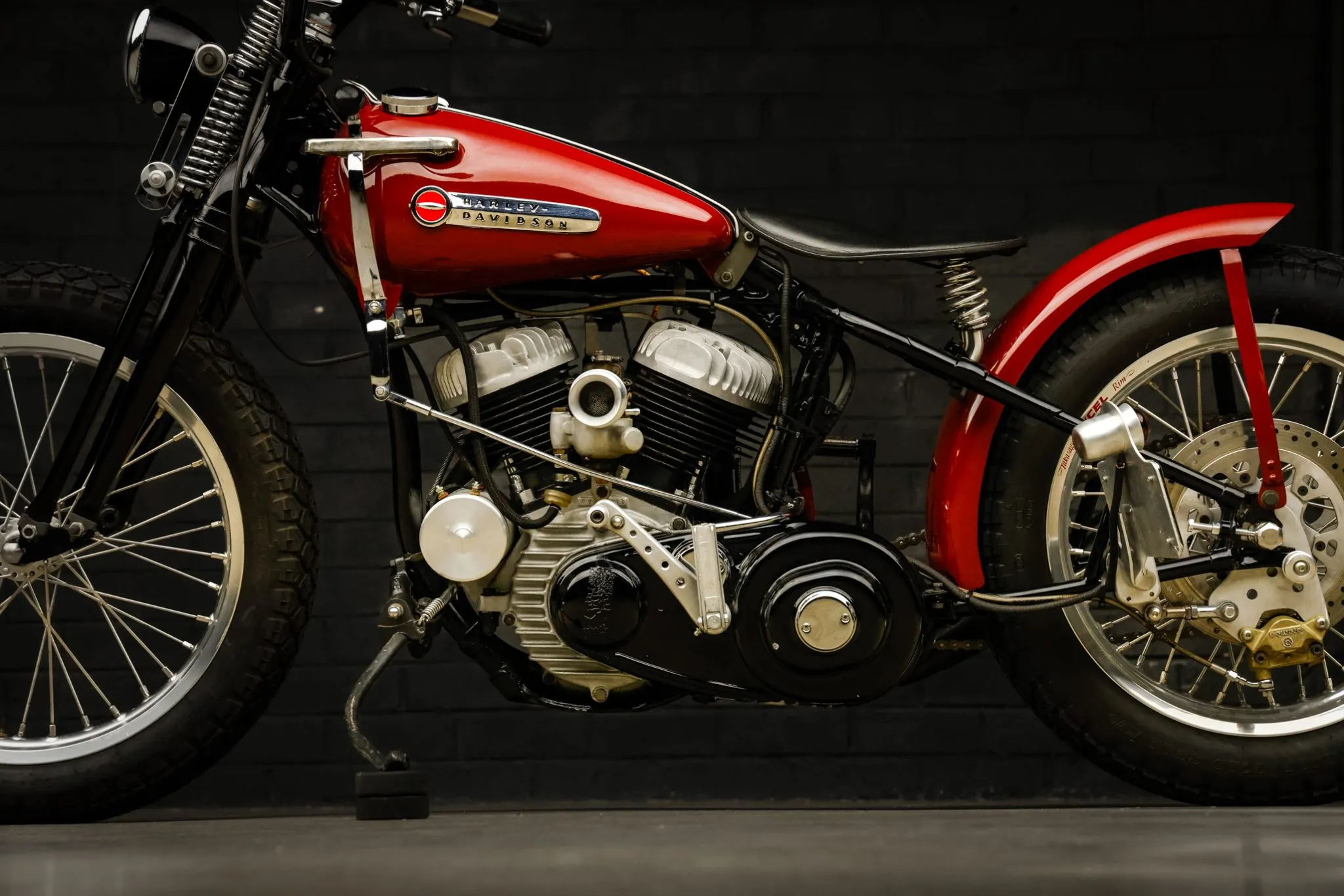 This 1947 Harley-Davidson WL is powered by a 45ci flathead V-twin that has been modified with domed pistons, piston skirt oilers, KR-profile cam lobes, Chevrolet-sourced intake valves, a modified clutch basket, and a black two-into-one exhaust system with a megaphone-style silencer. The reinforced hardtail frame carries a Panhead fuel tank and a rear fender that have been refinished in red, and the bike is further equipped with a hand-shifted three-speed transmission, Excel alloy rims, a rear disc brake, a springer fork, a steering damper, LED lighting, and a leather Corbin Gentry solo seat. This WL is now offered at no reserve by the consigning dealer, a BaT local partner, with a clean California title.