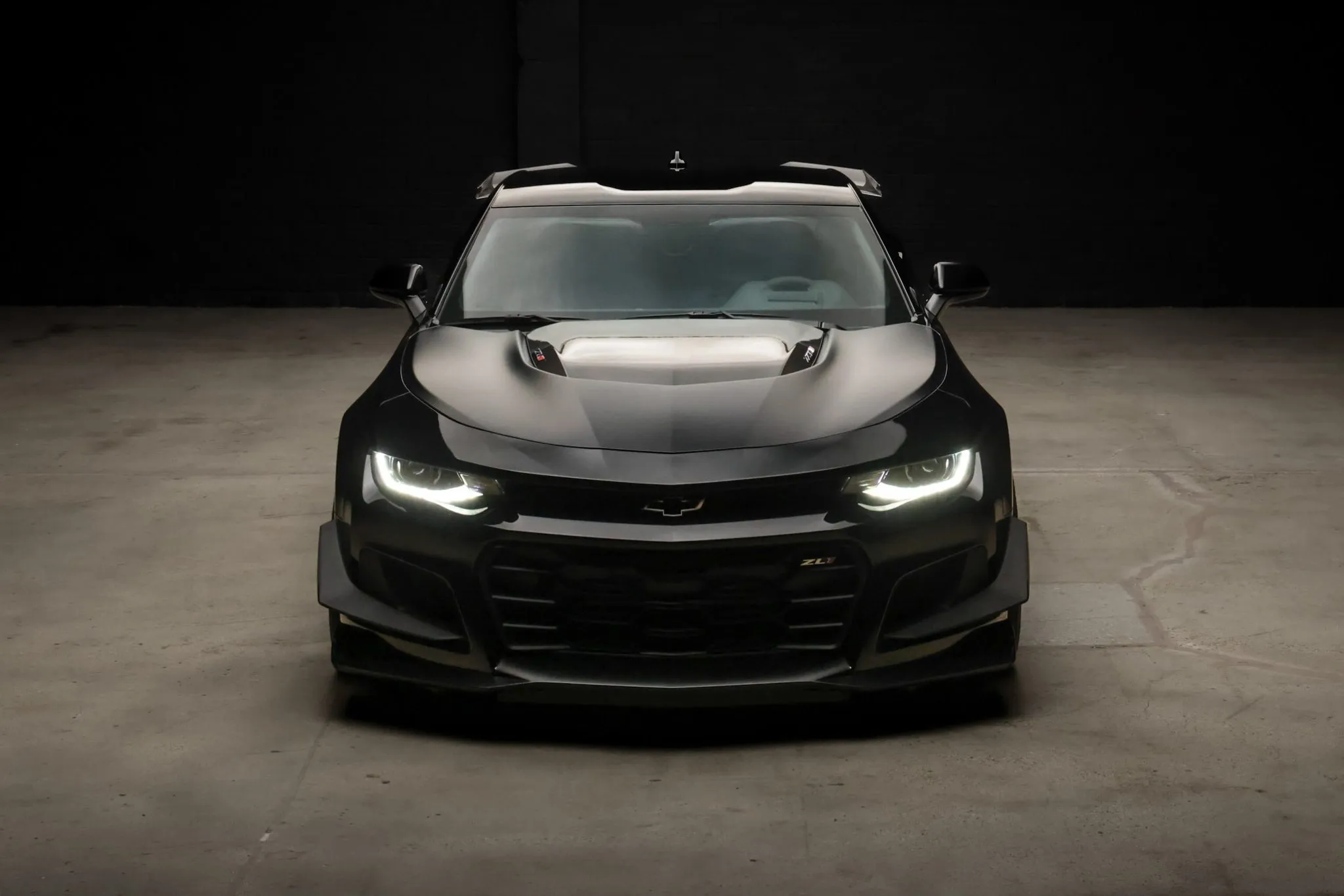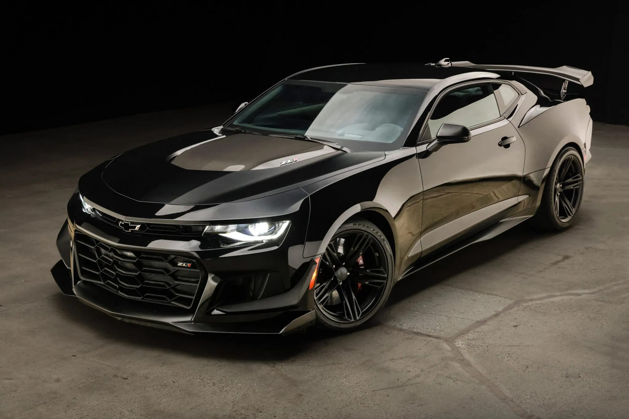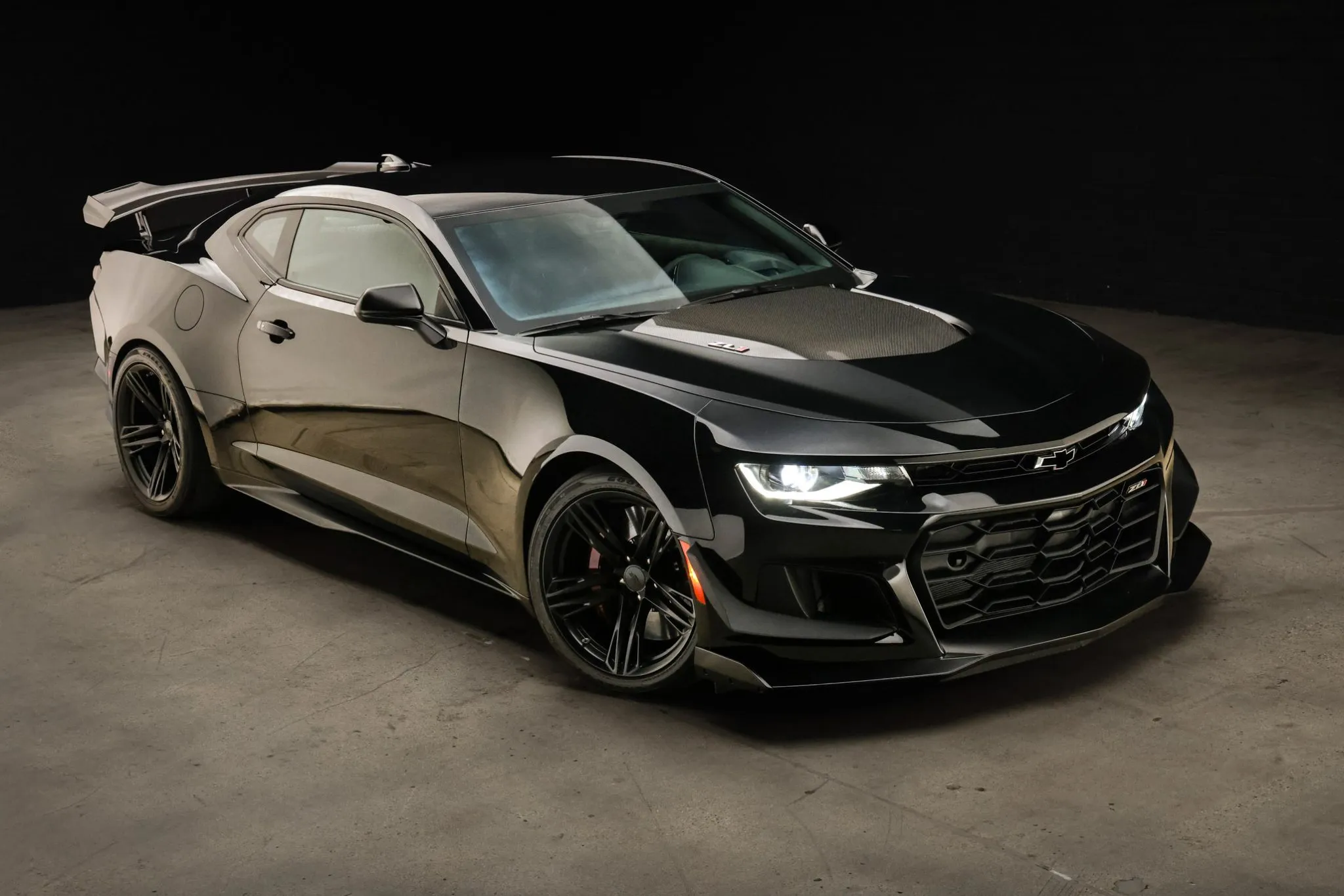 The car is finished in Black (GBA), and a Satin Black hood wrap was added with the 1LE Extreme Track Performance Package along with an exposed-weave carbon-fiber hood insert and rear wing. Additional exterior details include a front splitter, front dive planes, LED headlights, and rear Park Assist parking sensors. Protection film covers the windshield, and paint-protection film has been applied to the bodywork.