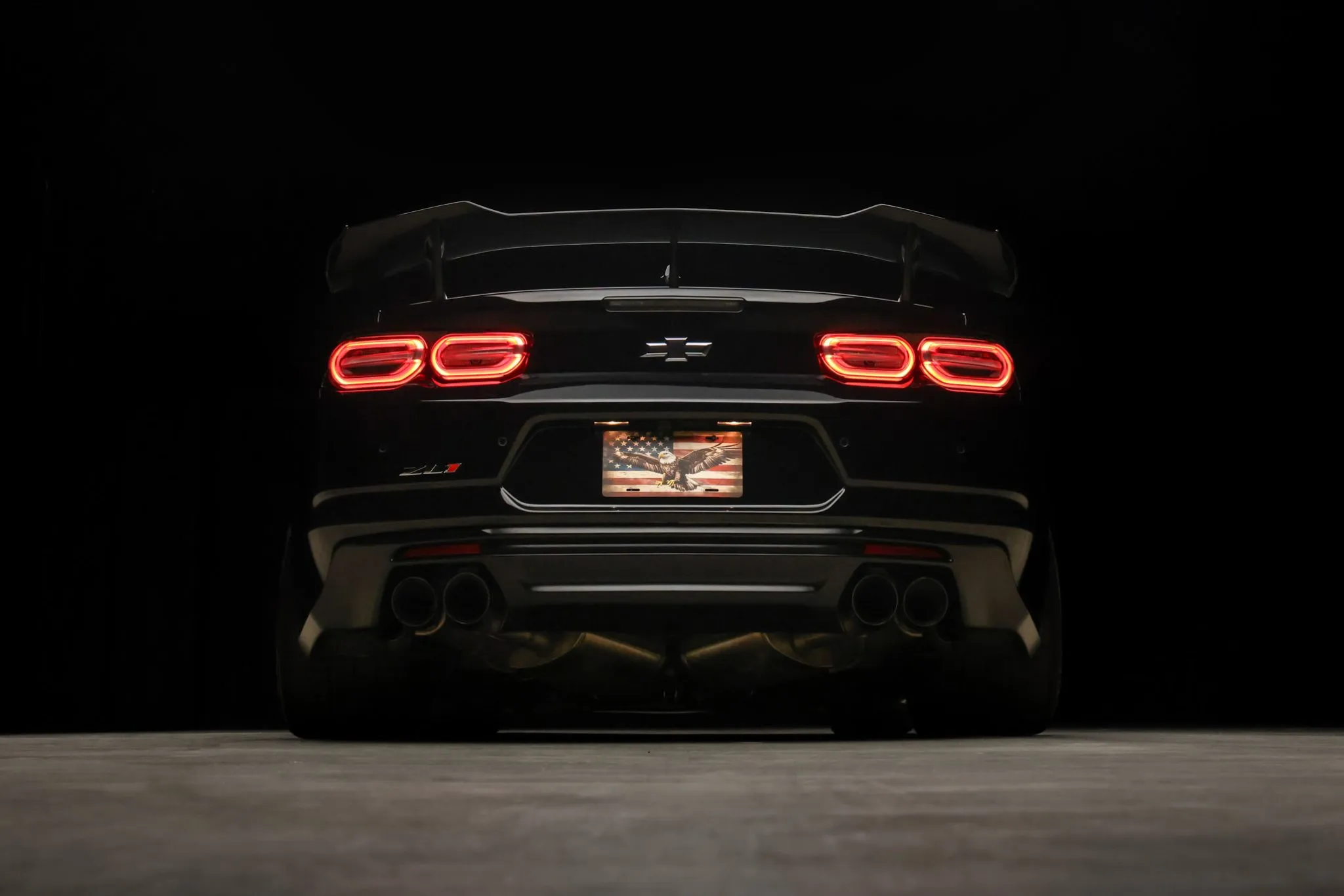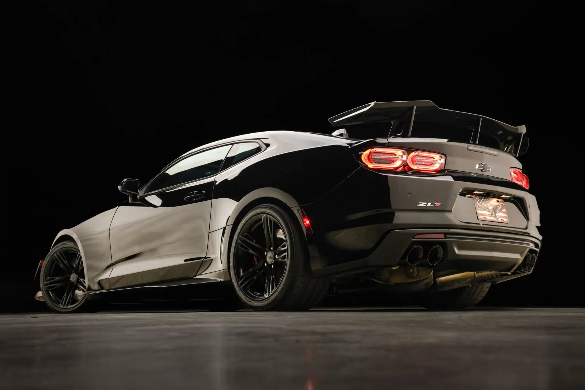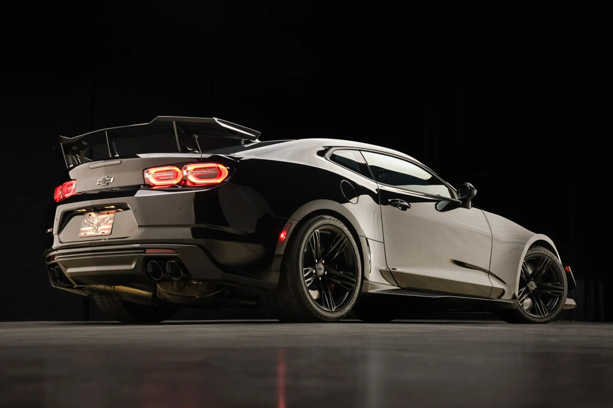 The car is finished in Black (GBA), and a Satin Black hood wrap was added with the 1LE Extreme Track Performance Package along with an exposed-weave carbon-fiber hood insert and rear wing. Additional exterior details include a front splitter, front dive planes, LED headlights, and rear Park Assist parking sensors. Protection film covers the windshield, and paint-protection film has been applied to the bodywork.