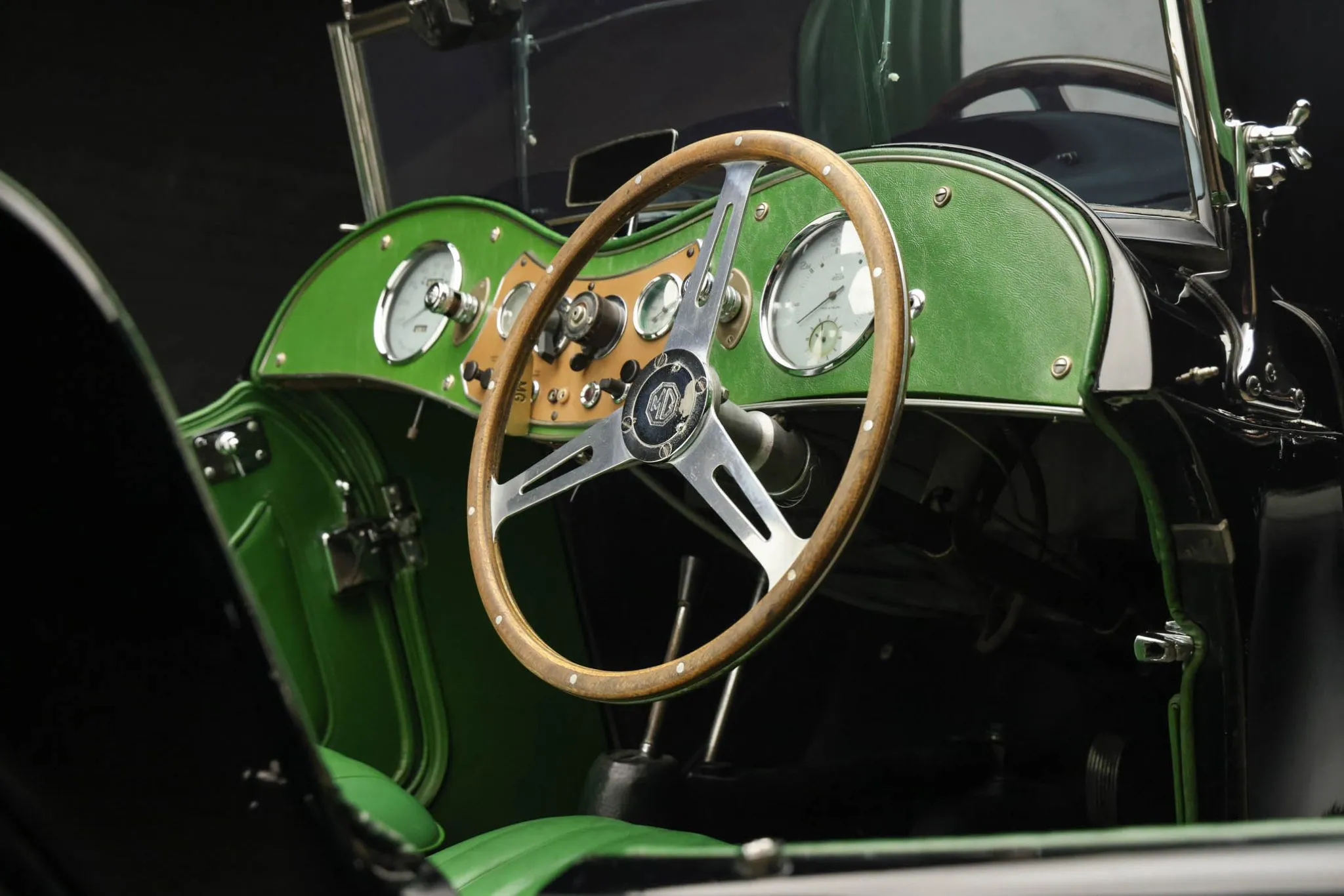 The right-hand-drive cabin is equipped with a split bench trimmed in Green leather accompanied by a color-coordinated dash and door panels. Further appointments include a dash-mounted rearview mirror, a passenger-side grab handle, and door-panel map pockets.