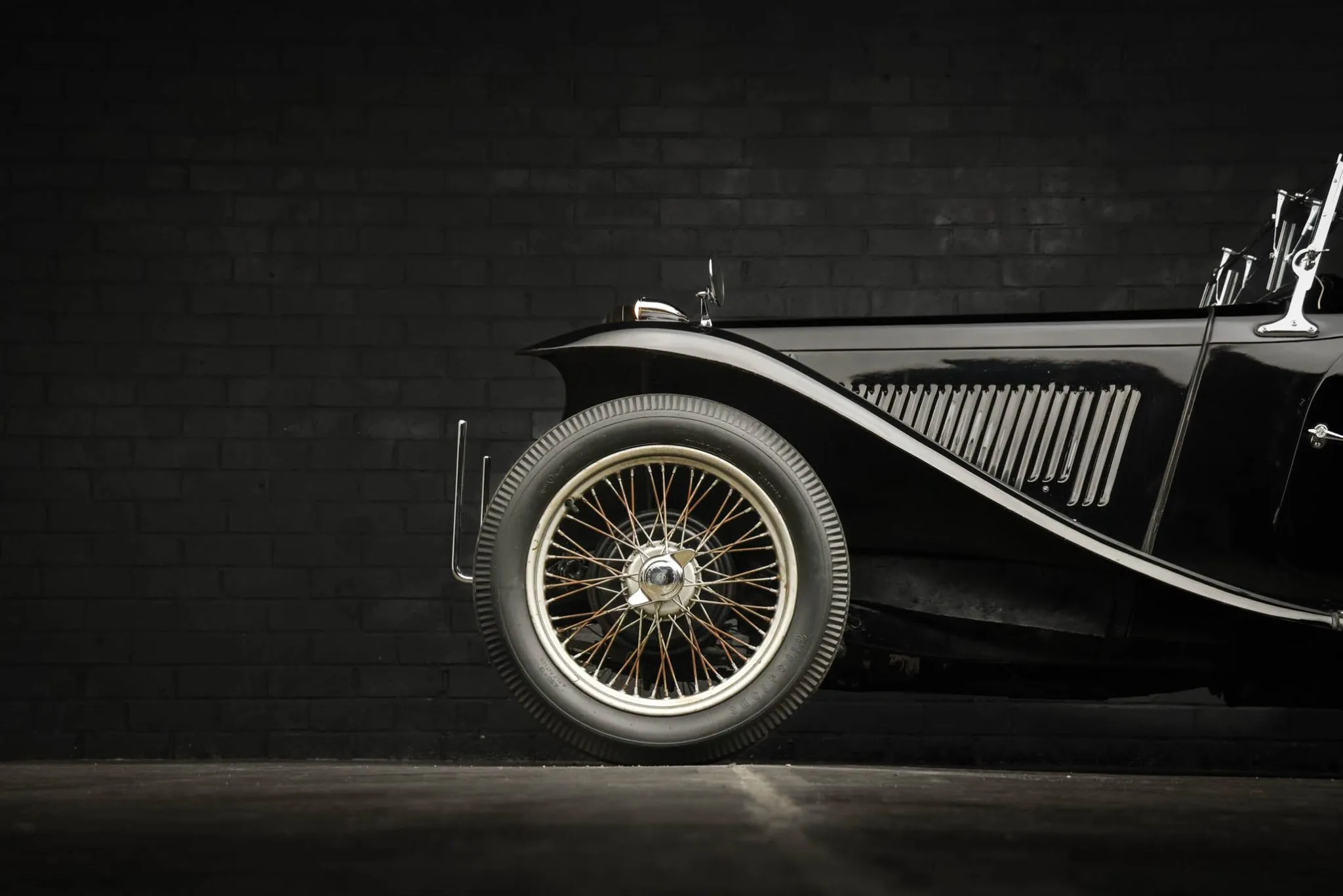 The 19″ wire wheels are secured with two-ear knock-offs and mounted with Firestone tires. A matching spare is stored at the rear of the vehicle against the fuel tank. Braking is handled by hydraulic drums at each corner.
