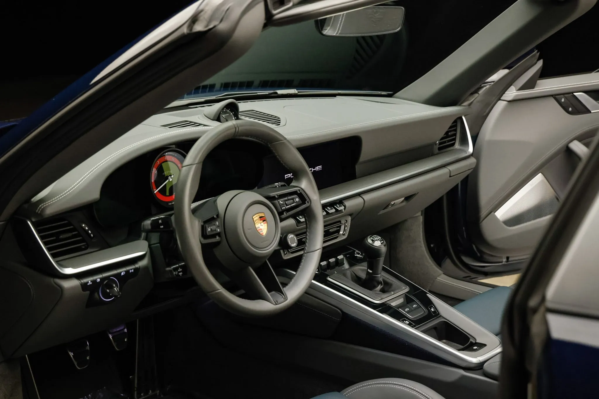The heated leather-wrapped GT Sport steering wheel fronts a central 8k-rpm tachometer with Guards Red finishes, an inset speed readout, and LCD screens with configurable displays. A Sport Chrono stopwatch is mounted atop the center of the dashboard. The digital odometer indicates under 1,700 miles.