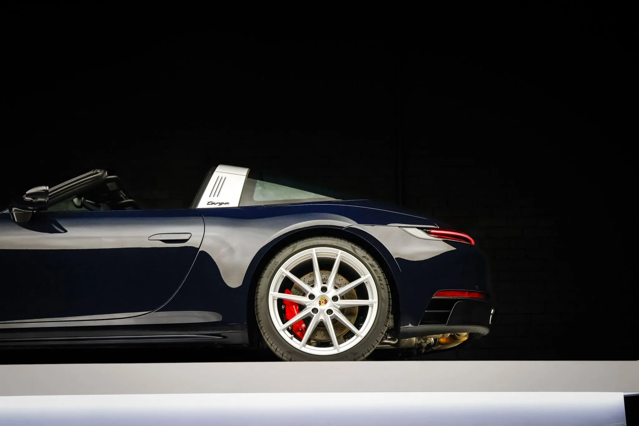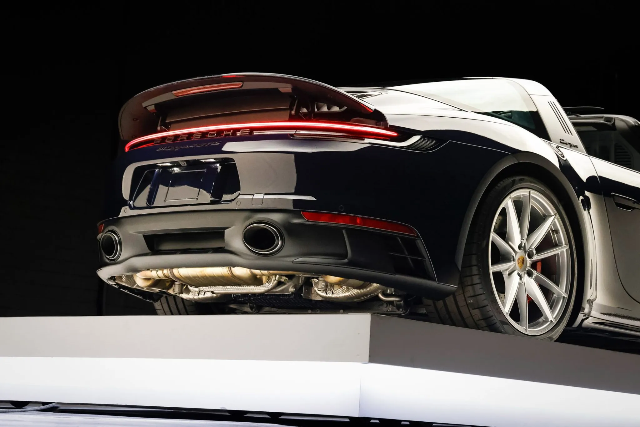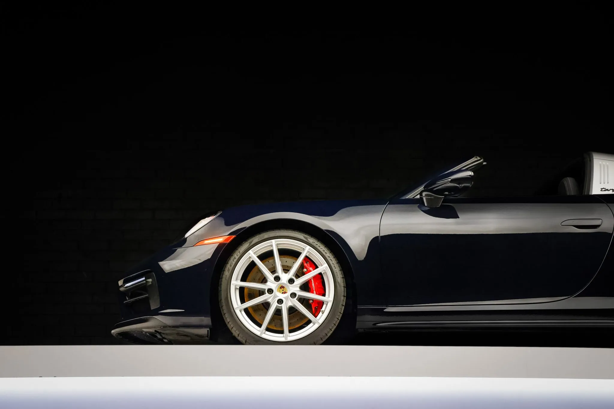 The 20″ and 21″ Carrera S alloy wheels are mounted with Pirelli P Zero tires. The car is equipped with rear-axle steering, Power Steering Plus, and a front-axle lift system, and braking is handled by red-finished Porsche-script calipers over cross-drilled and ventilated rotors.