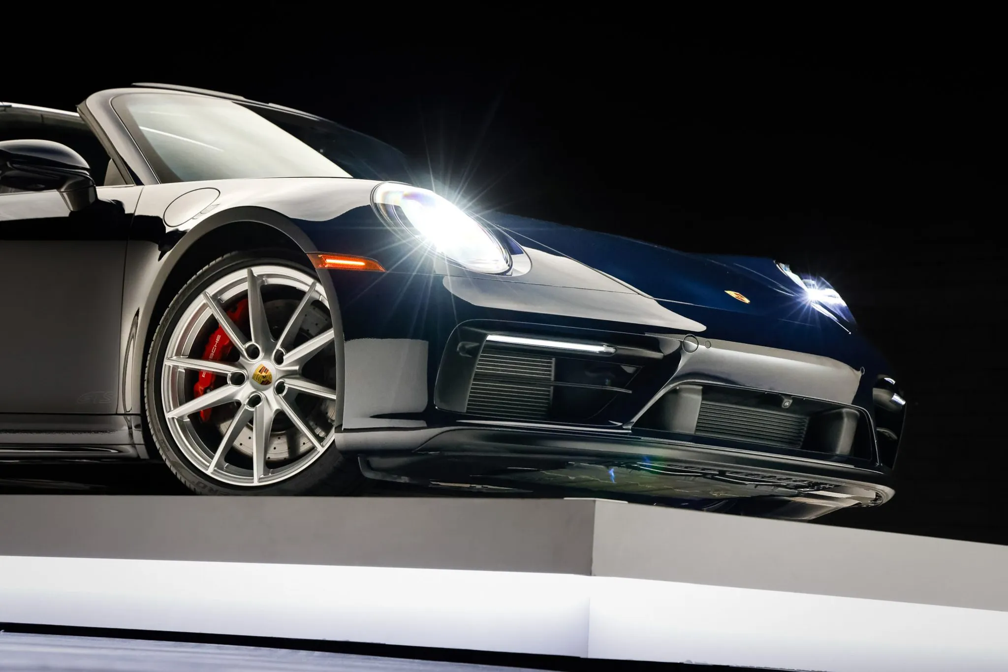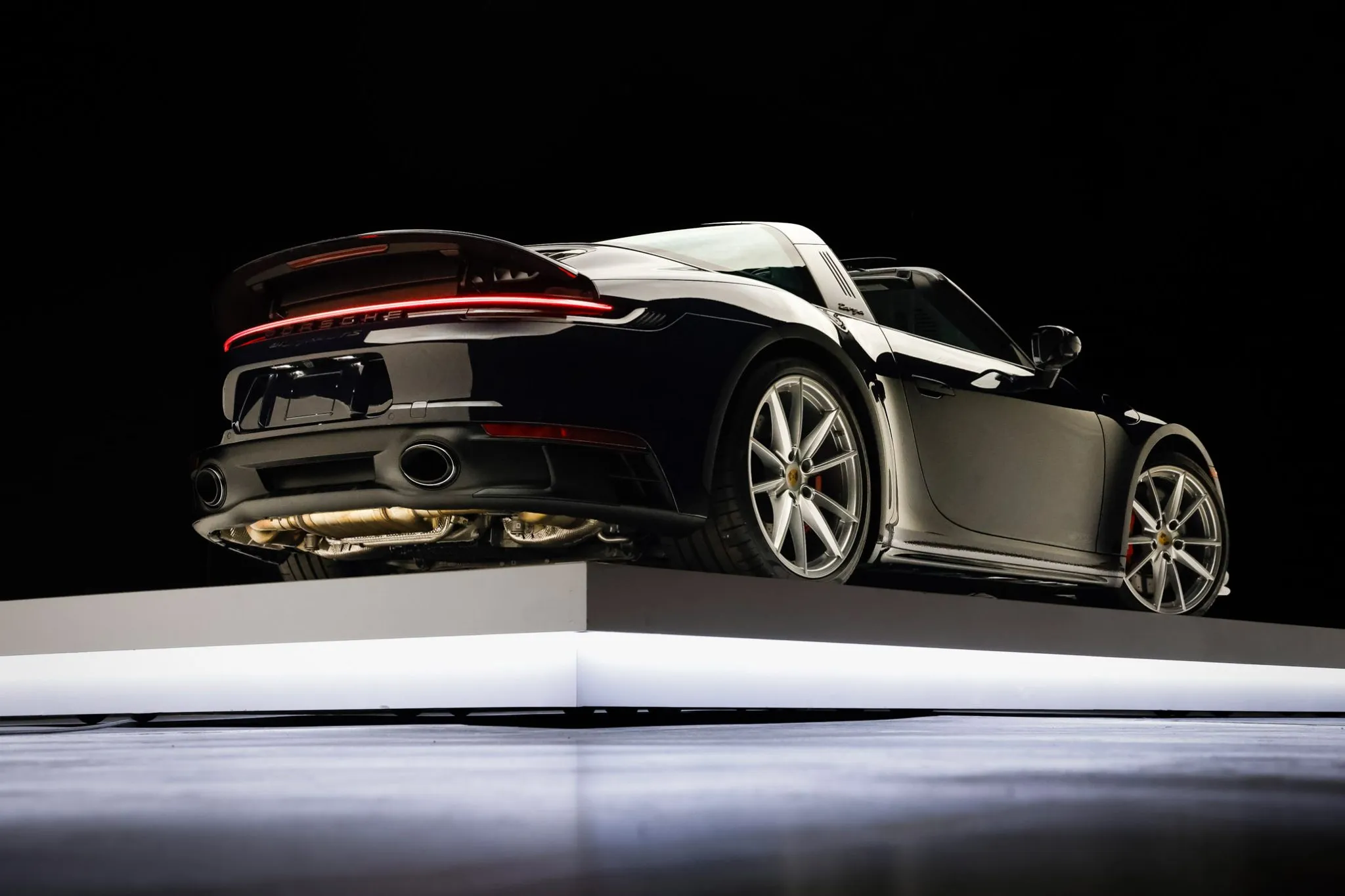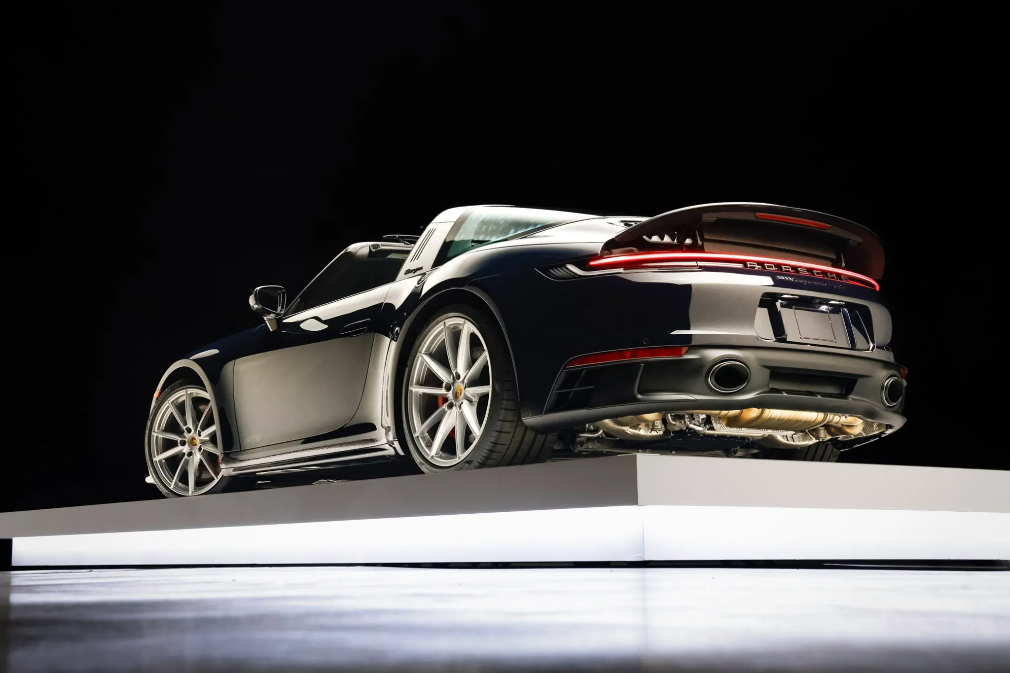 The 20″ and 21″ Carrera S alloy wheels are mounted with Pirelli P Zero tires. The car is equipped with rear-axle steering, Power Steering Plus, and a front-axle lift system, and braking is handled by red-finished Porsche-script calipers over cross-drilled and ventilated rotors.