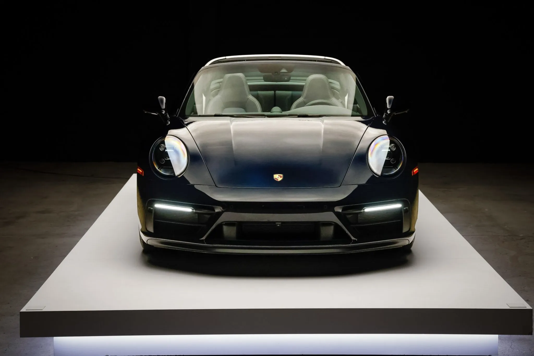 The car is finished in paint-to-sample Xblue and features SportDesign side skirts and silver-finished Exclusive Design tailpipes. Additional exterior details include a black retractable Targa roof panel, a speed-activated rear spoiler, and parking sensors.